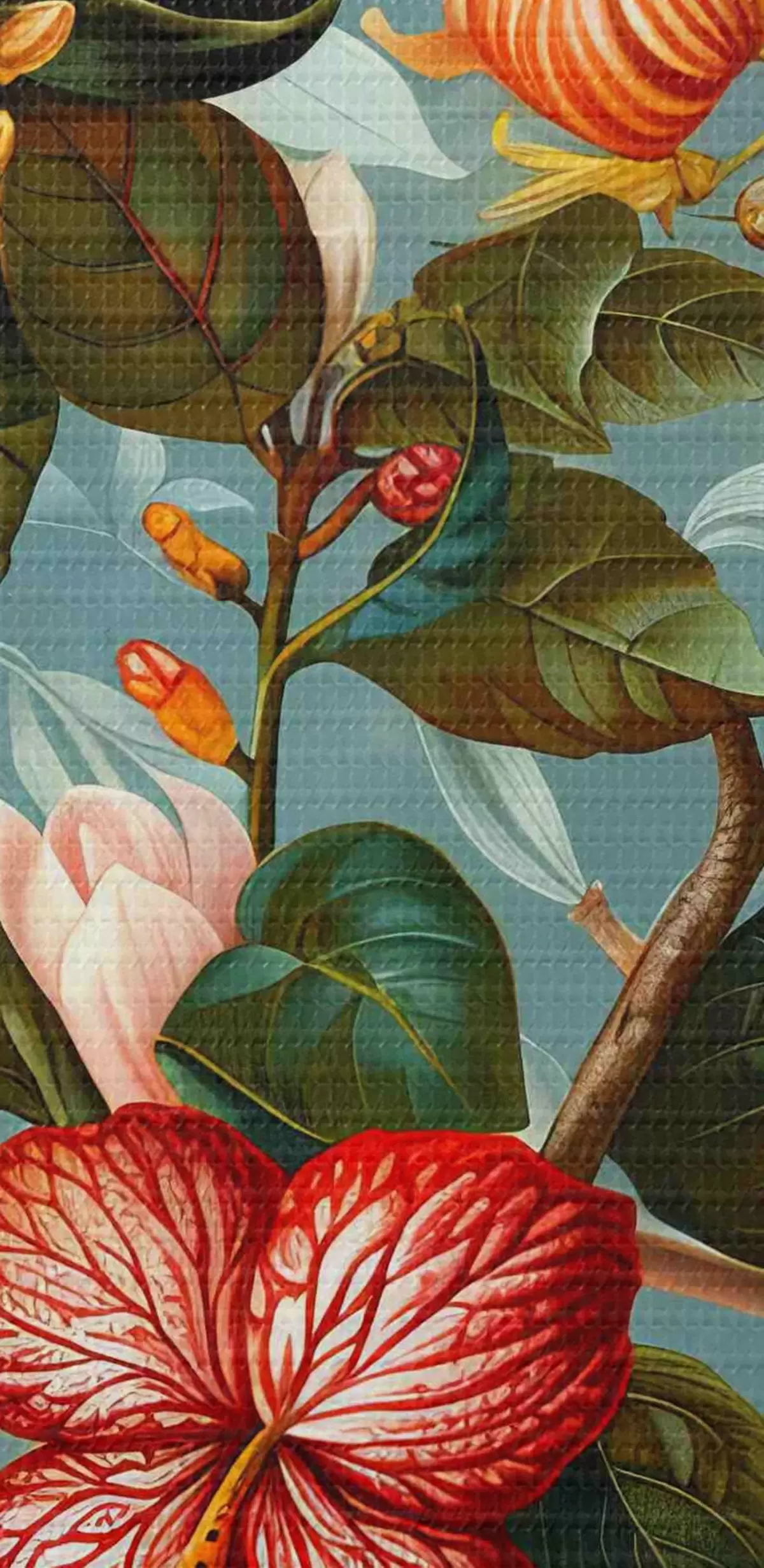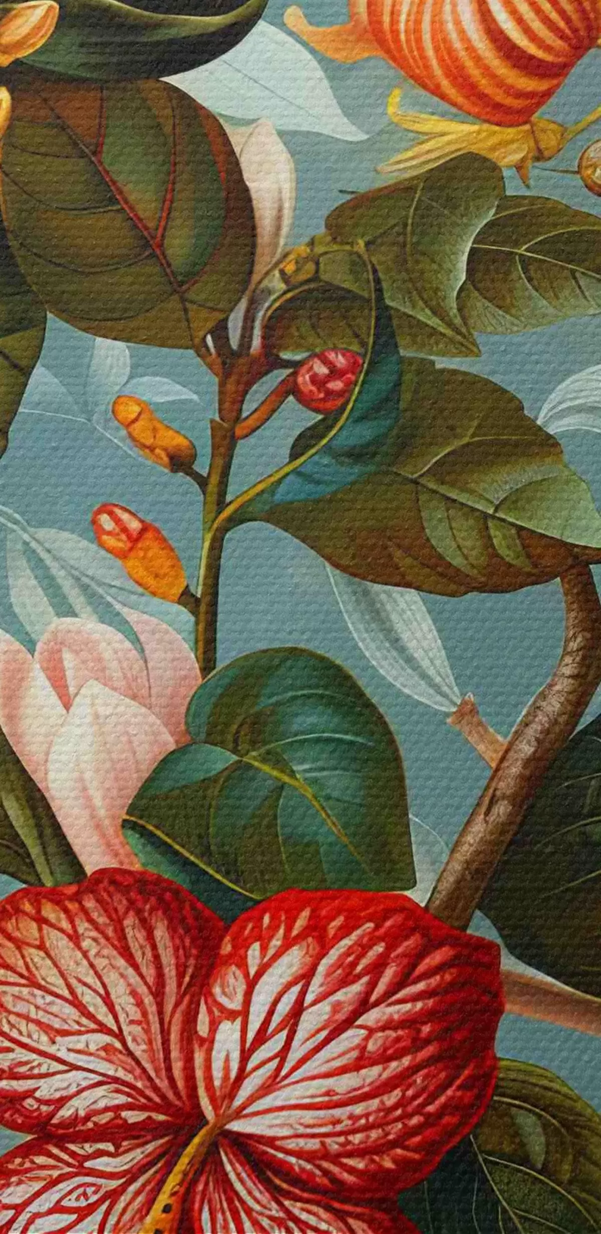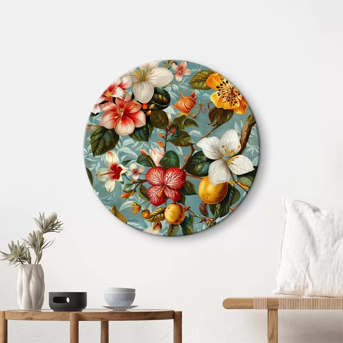 Obrázek Kompozice s různou zelení a tropickými květinami na modrém pozadí Nr r40668