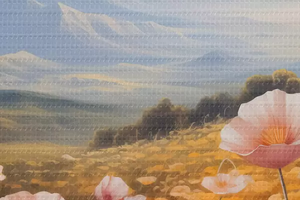 Obrázek Pole máků za úsvitu s horami v pozadí Nr r40730