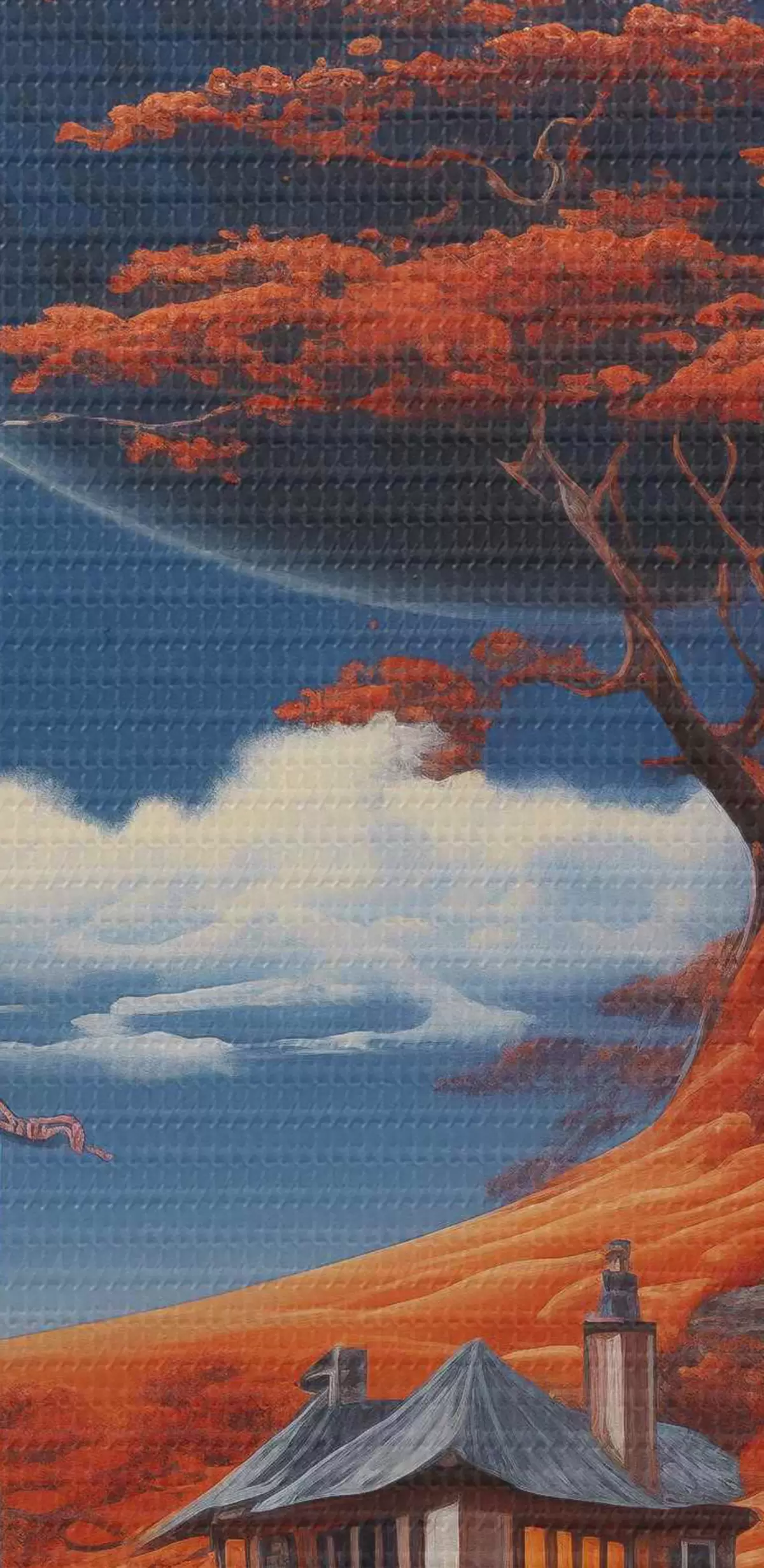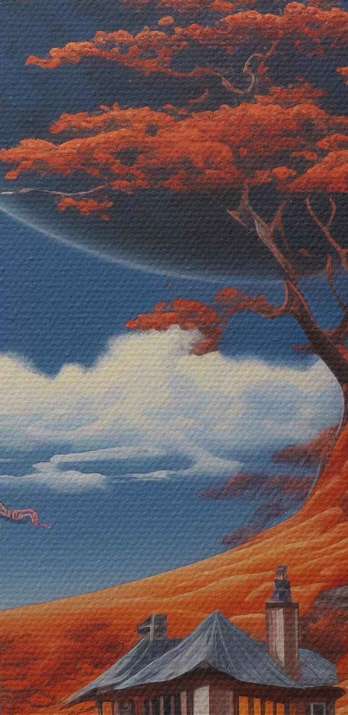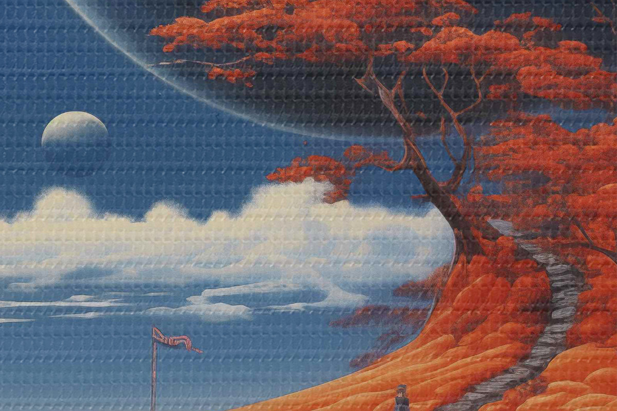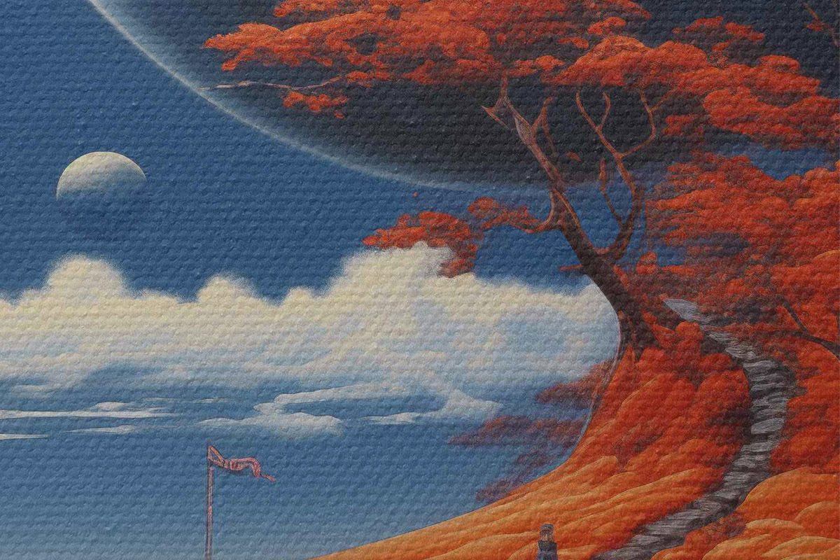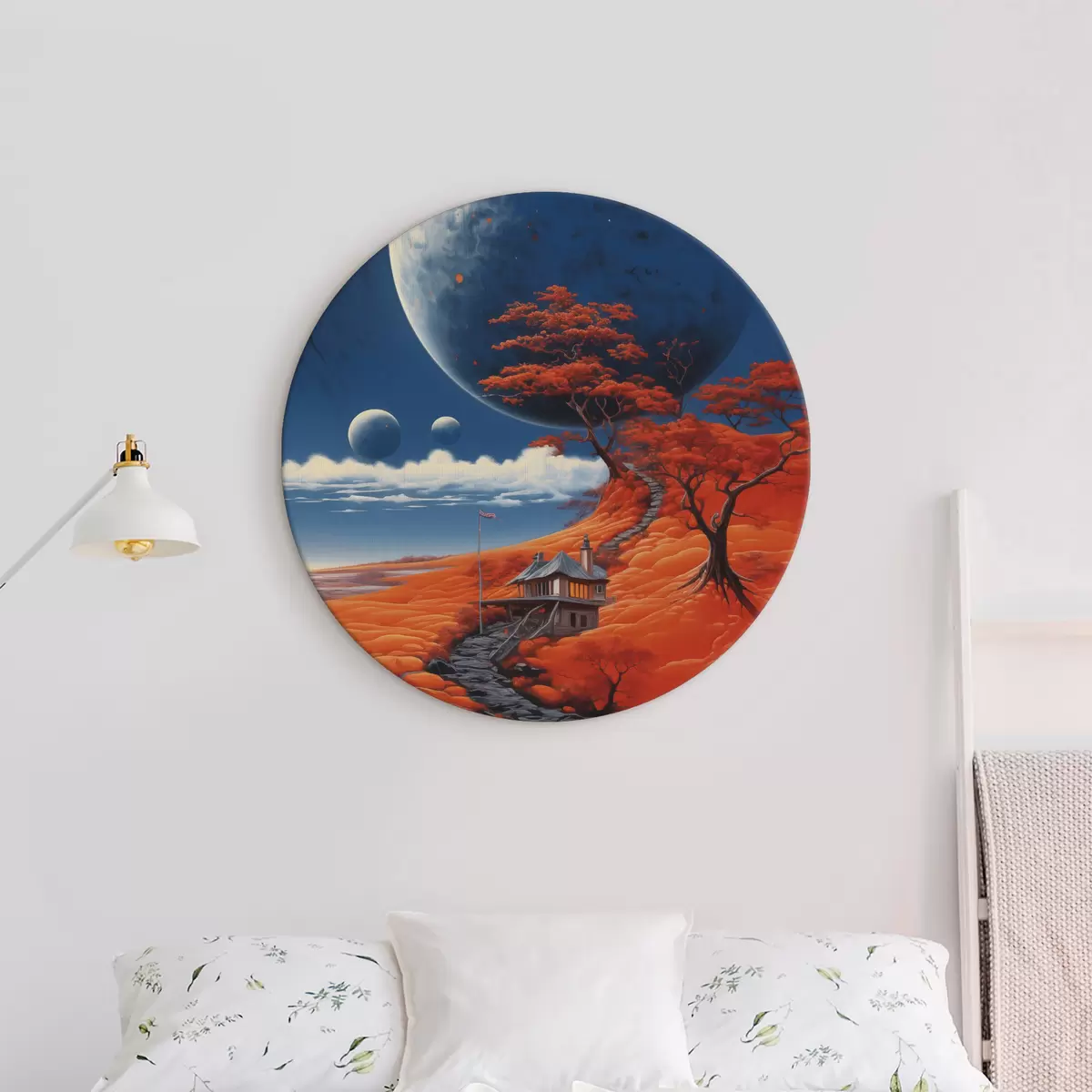 Obrázek Vesmírná ilustrace, planety, modrá obloha, dům na kopci, stromy Nr r40946
