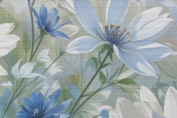 Obrázek Pole bílých a modrých sedmikrásek se zelenými listy a stonky na jemném rozmazaném pozadí Nr r41086