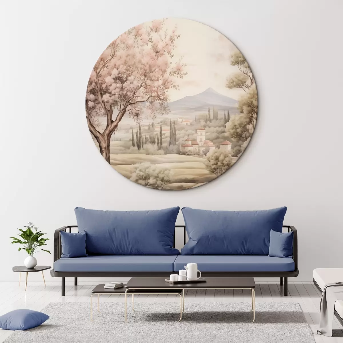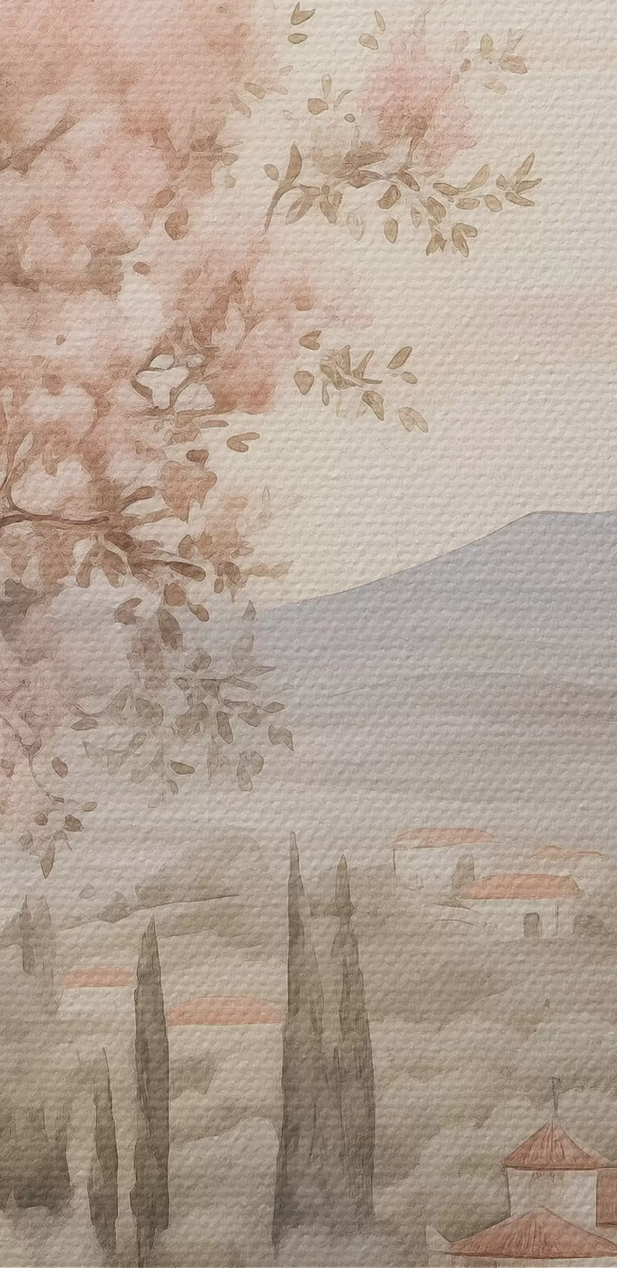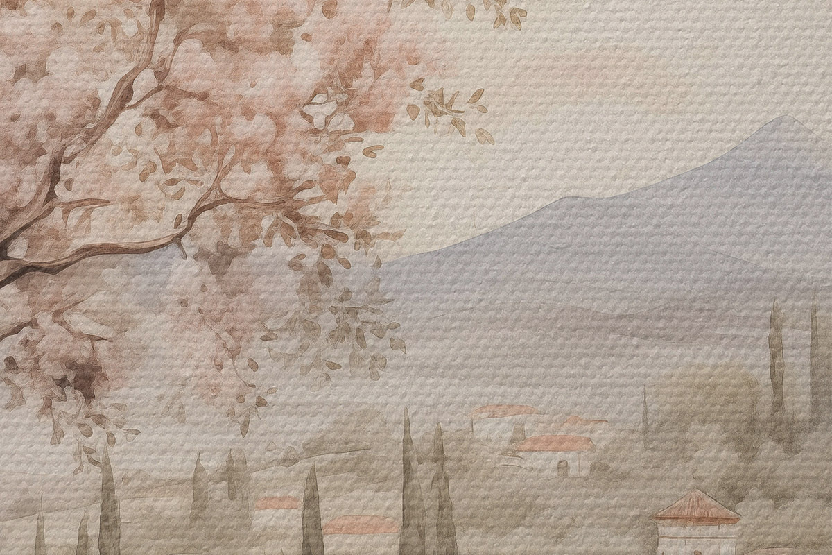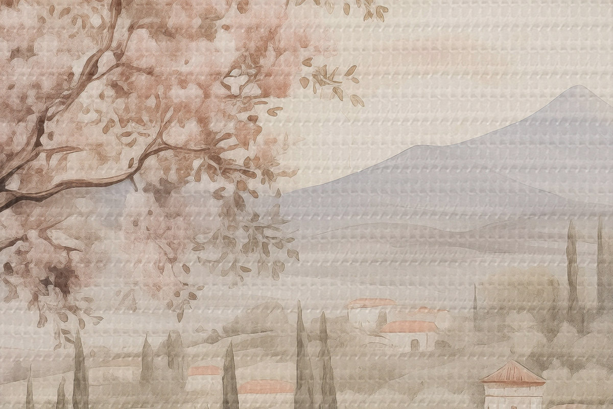Obrázek Akvarel kopce, třešňové květy, hrad, rustikální styl Nr r41225