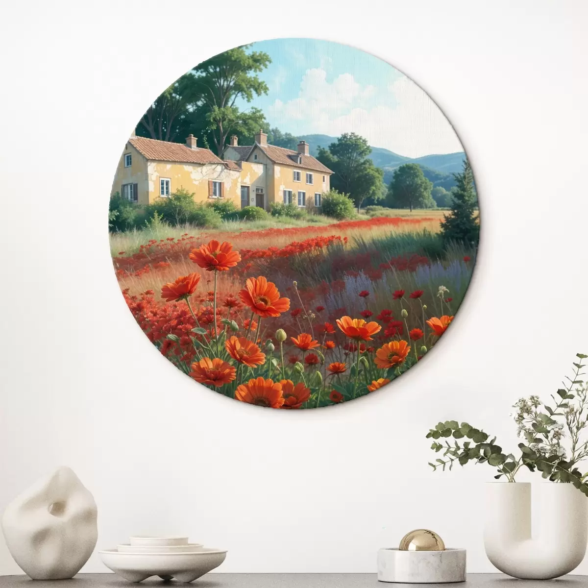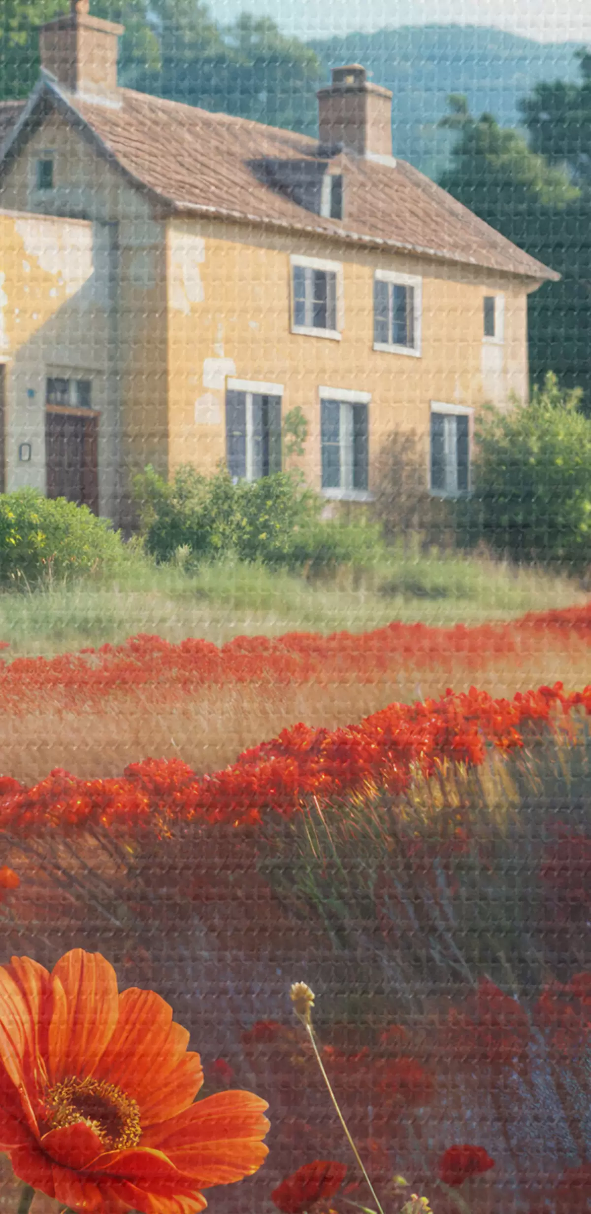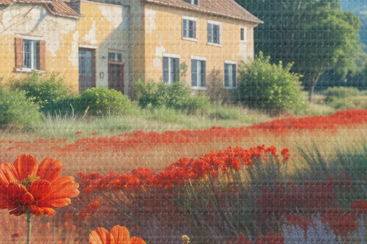 Obrázek Pole zářivě červených vlčích máků v popředí a řada půvabných žlutých a bílých domků v pozadí Nr r41260