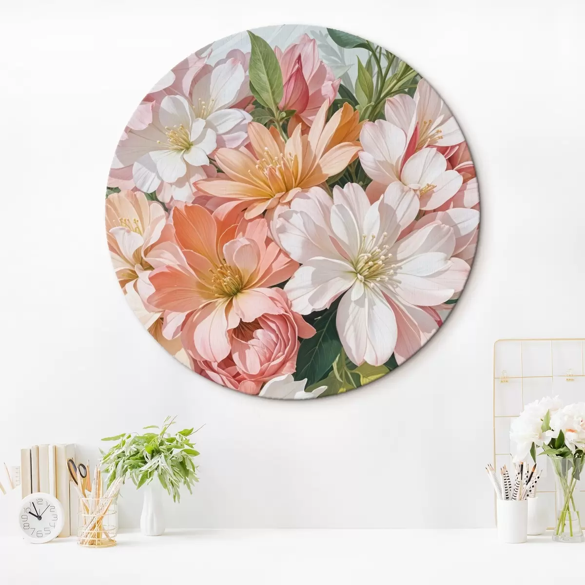 Obrázek Živá kytice velkých růžových, bílých a oranžových květů jiřinek se zelenými listy na jemném růžovém pozadí Nr r41267