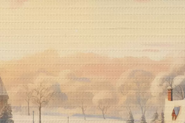 Obrázek Zimní krajina, domy, obloha při západu slunce, stromy, akvarel Nr r41383