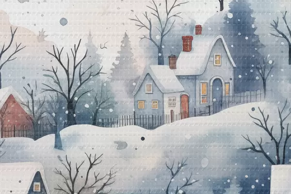 Obrázek Akvarelová zimní krajina s domy a borovým lesem Nr r41389
