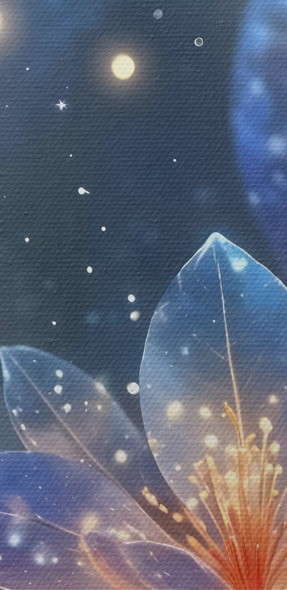 Obrázek Abstraktní fantasy květiny na větvích s texturovanými okvětními lístky s hvězdami a měsícem na pozadí noční oblohy Nr r42211