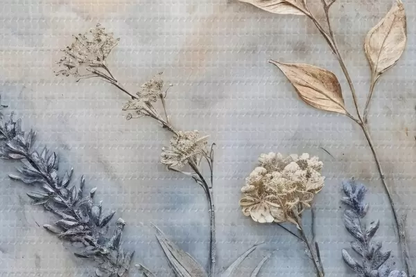 Obrázek Pole různých divokých květin a rostlin v odstínech modré, bílé a béžové na jemném, mlhavém pozadí Nr r42214