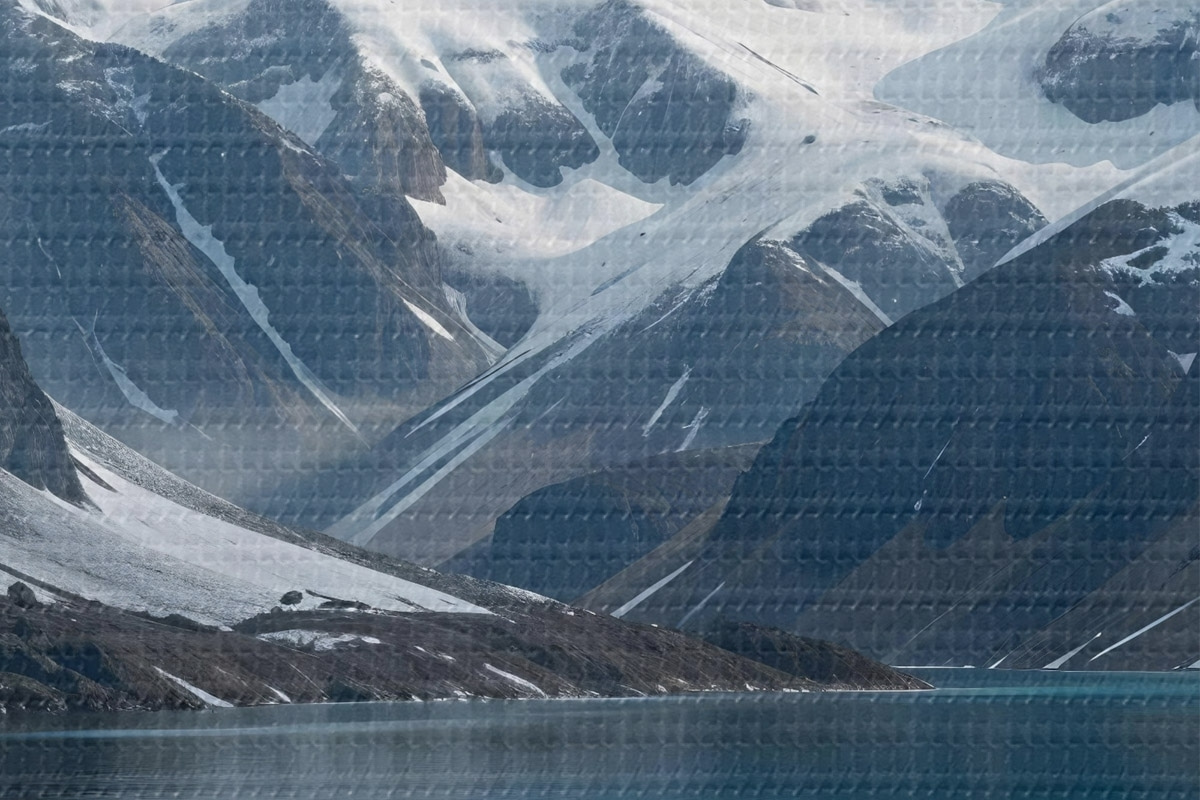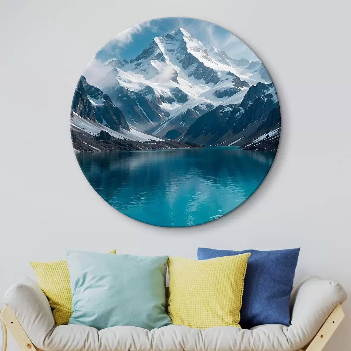 Obrázek Zasněžený vrchol hory odrážející se v klidném tyrkysovém jezeře, obklopený skalnatým terénem a dramatickými mraky Nr r42232
