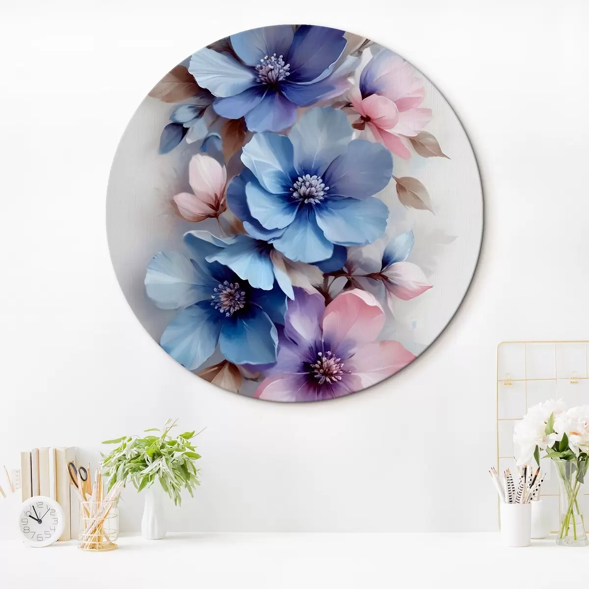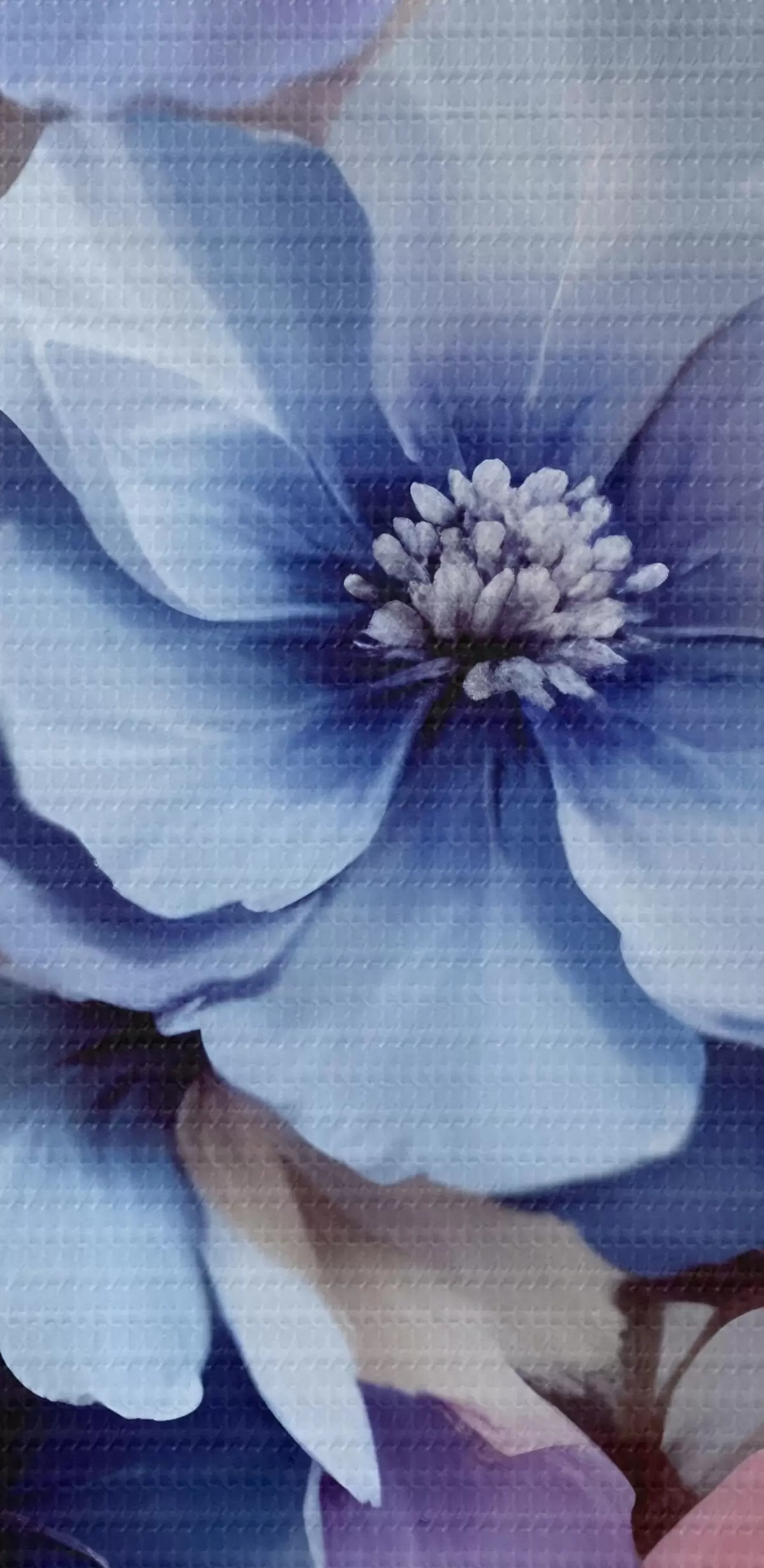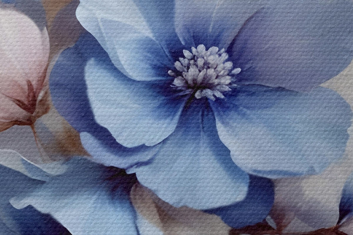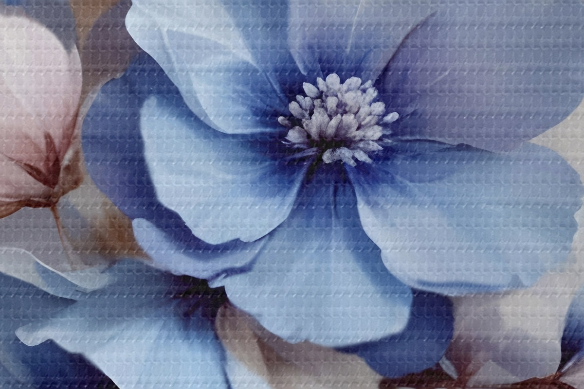 Obrázek Jemné modré a růžové květy s měkkými okvětními lístky a středy, uspořádané do krásného květinového potisku na světlém pozadí Nr r42241
