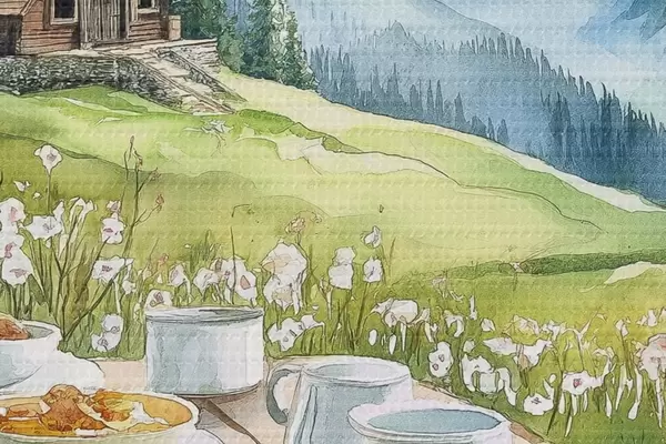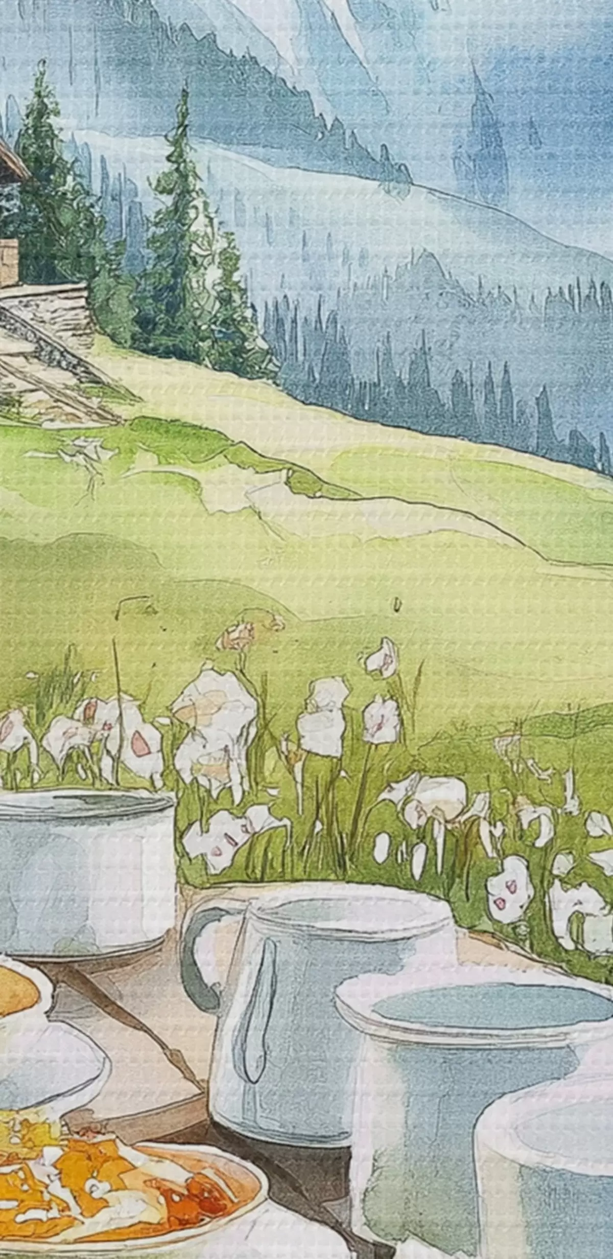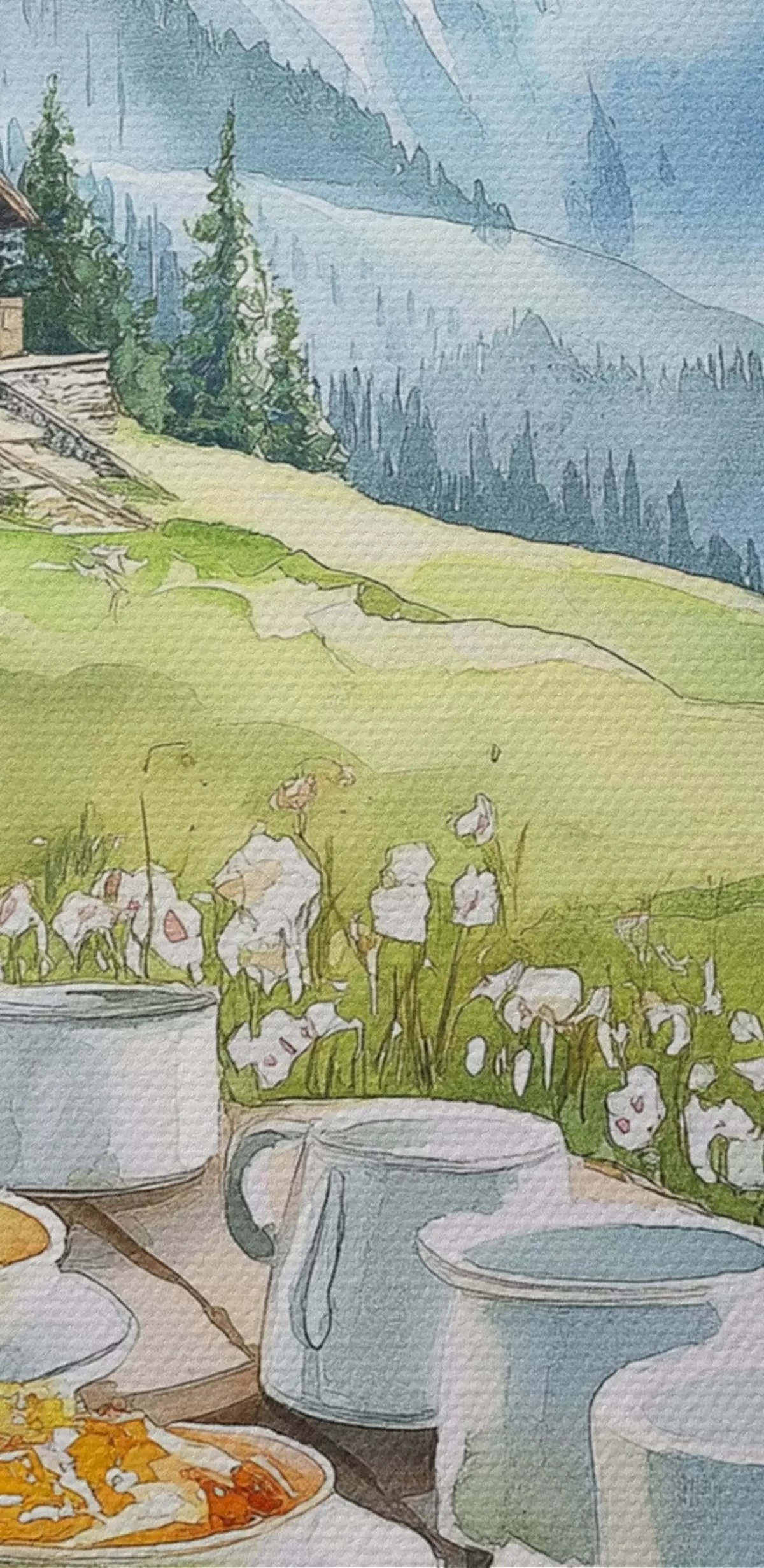 Obrázek Snídaně v Alpách, hory, les, příroda, léto, akvarel Nr r42426