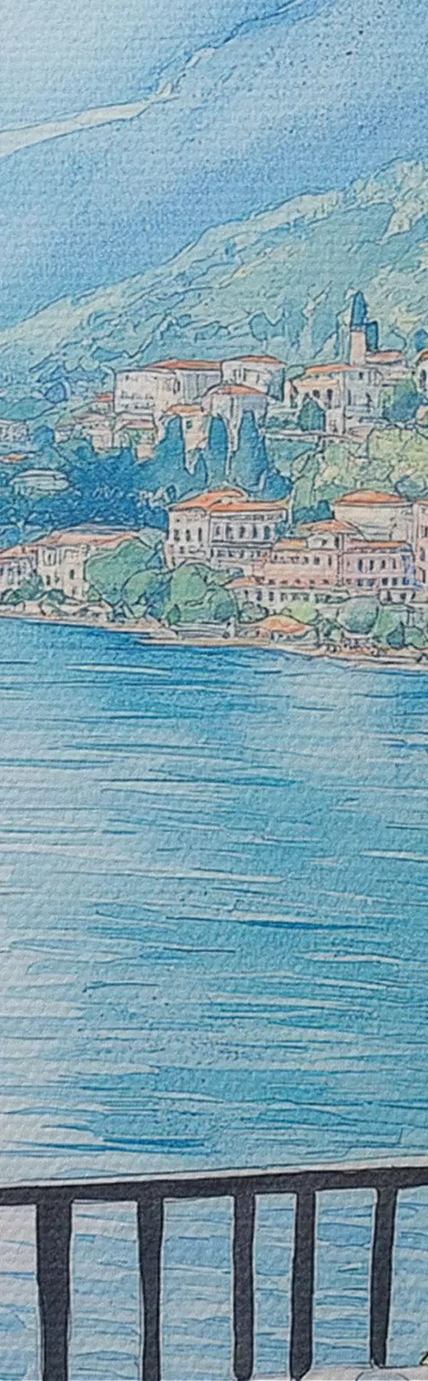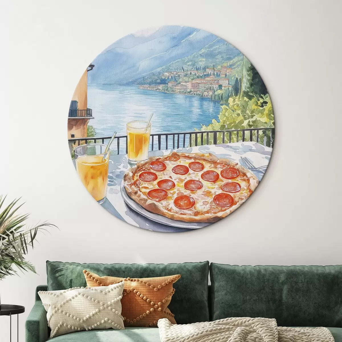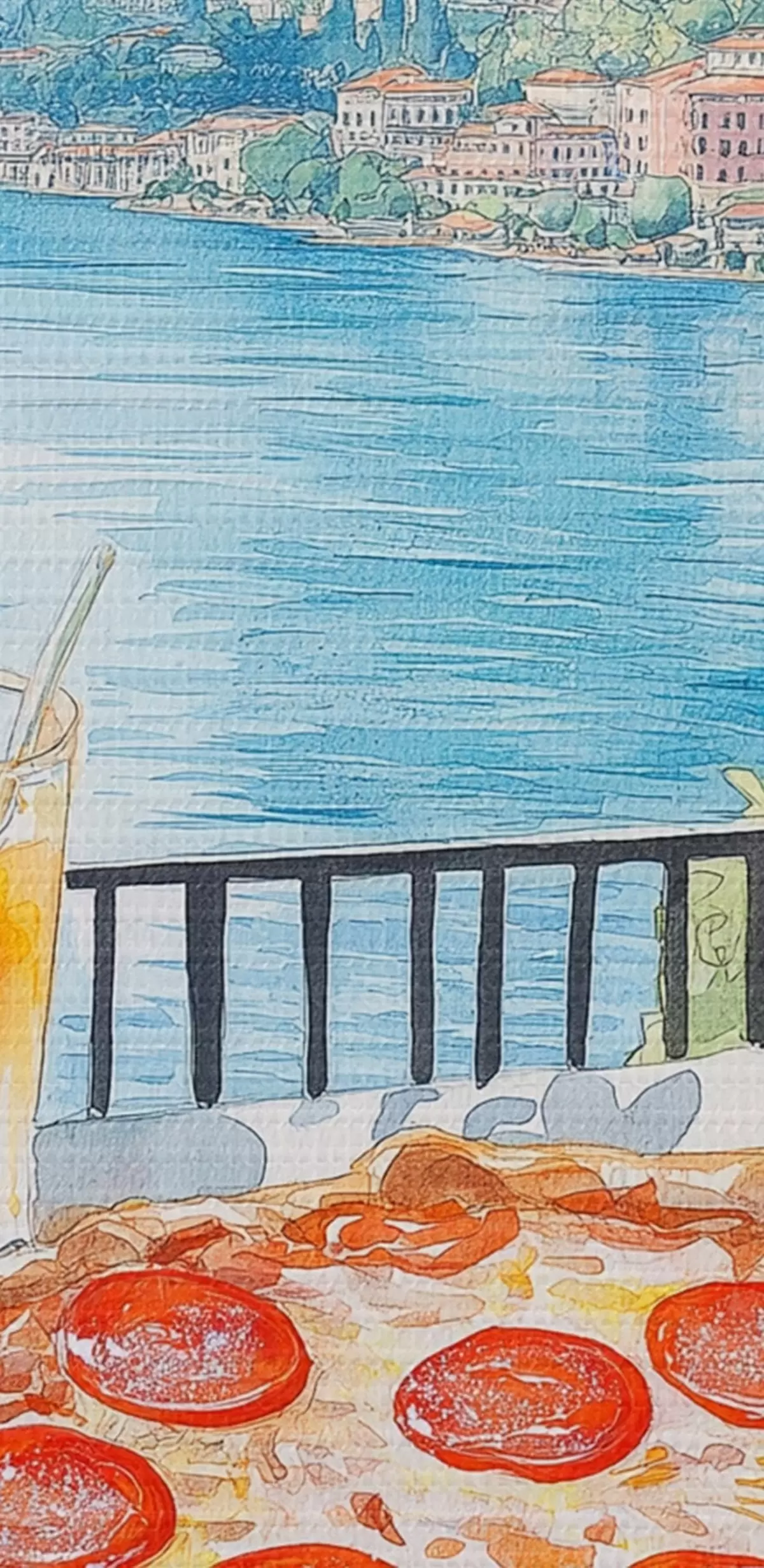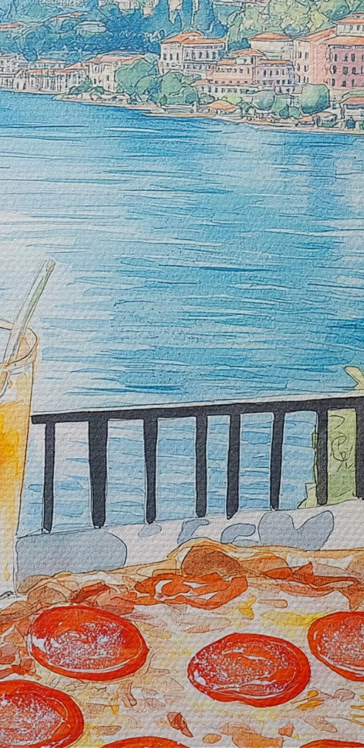 Obrázek Brunch v Itálii, akvarel, pizza margarita, jezero, letní příroda Nr r42436