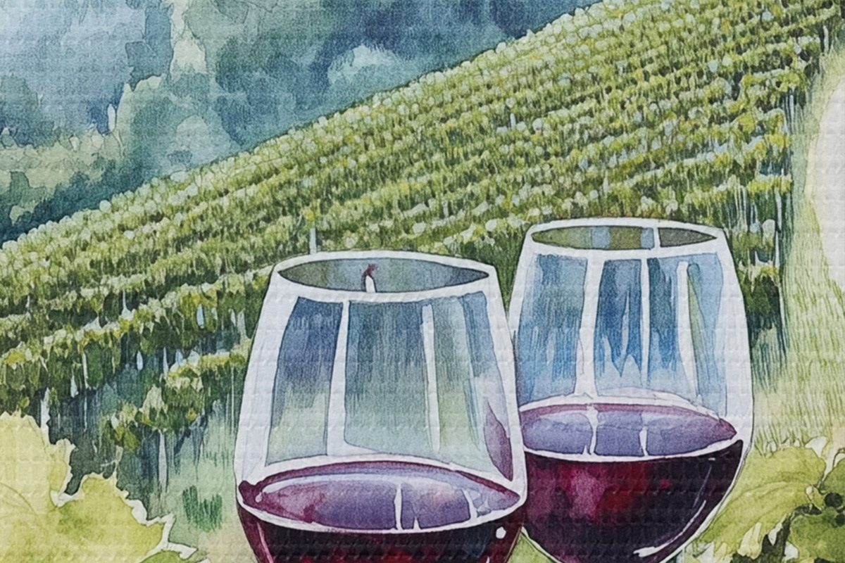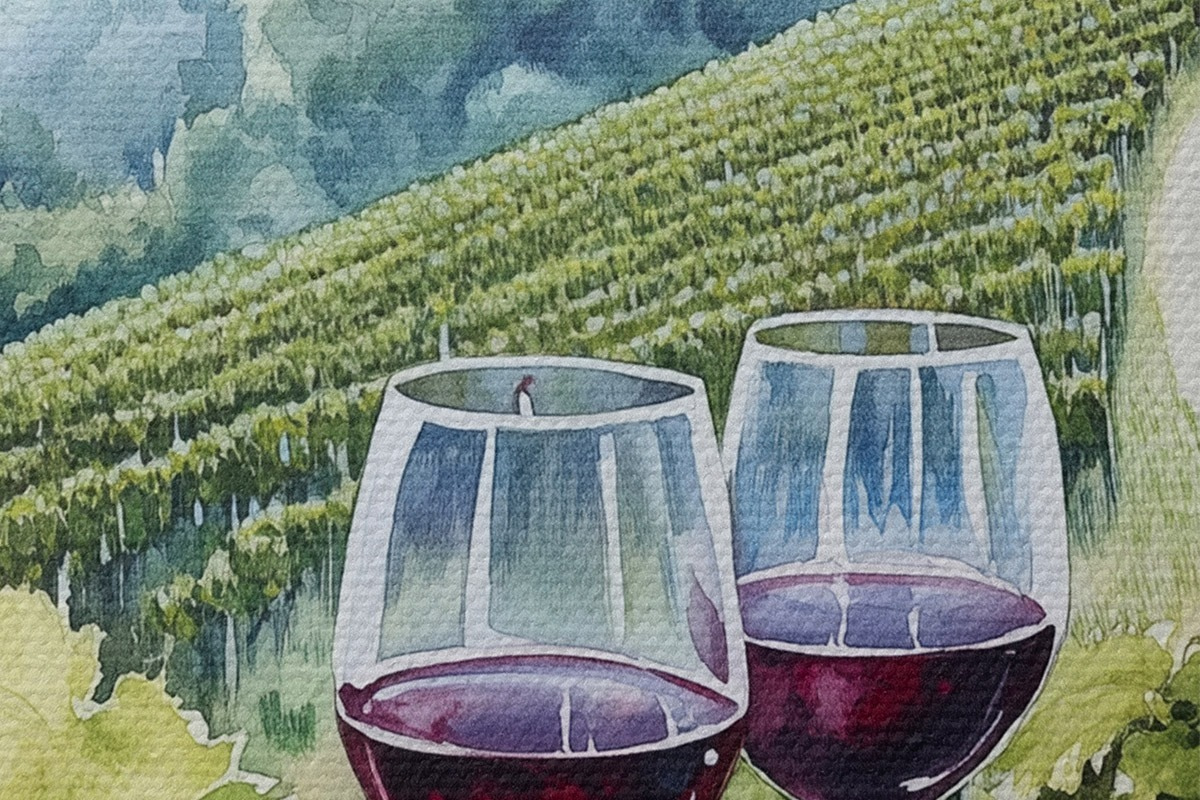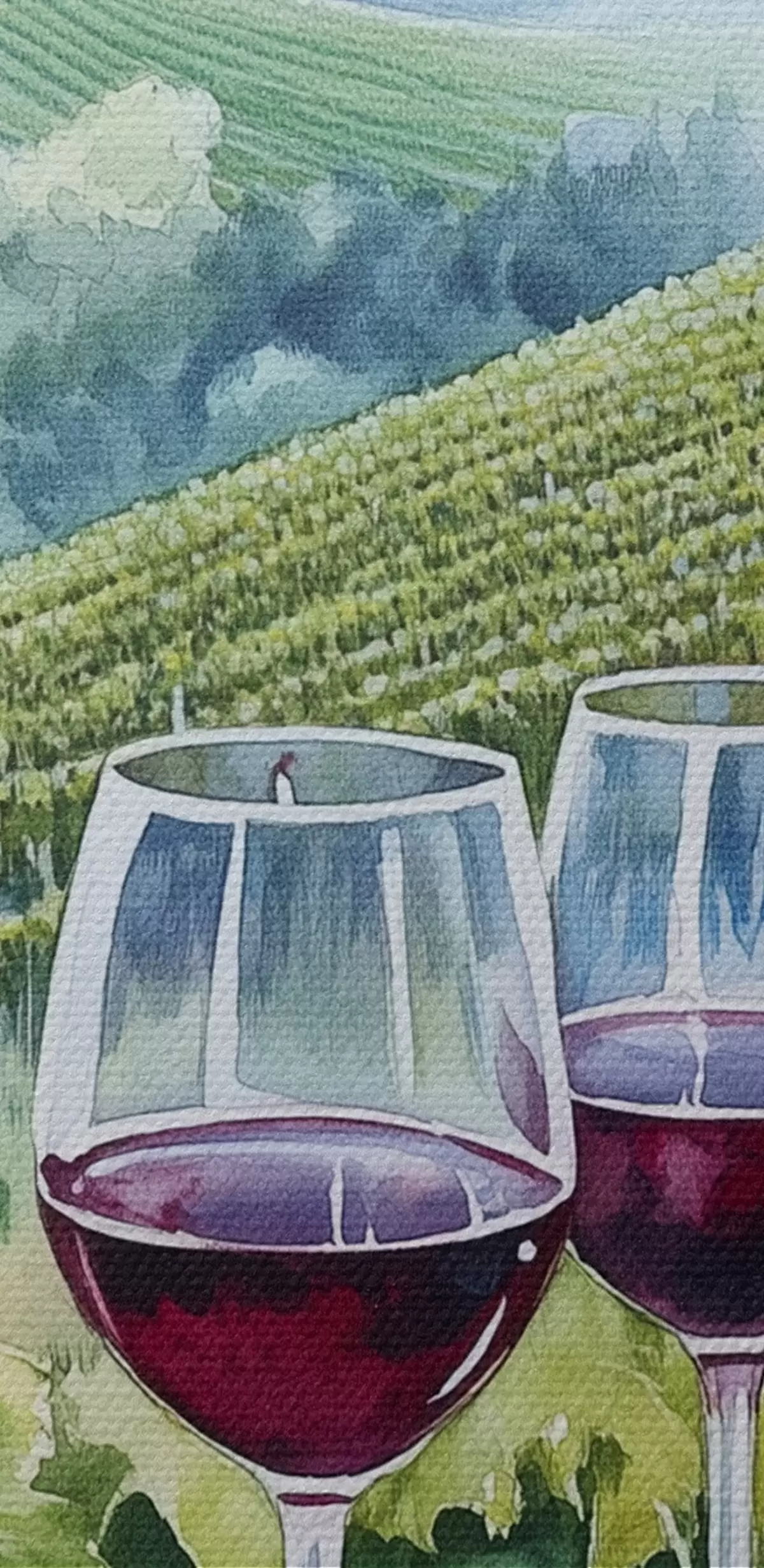 Obrázek Toskánská krajina, vinné sklípky, sklenice na víno, akvarel Nr r42445