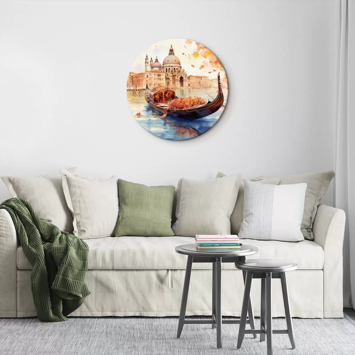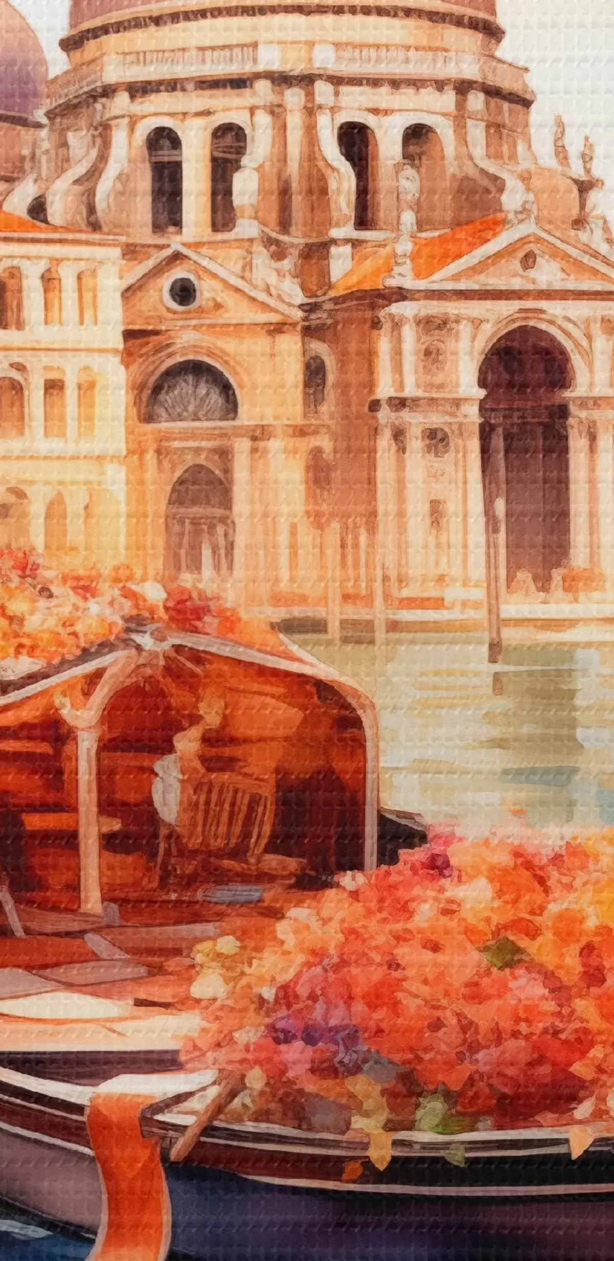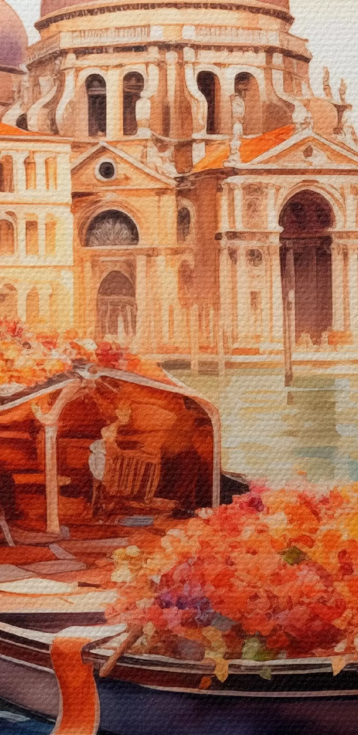 Obrázek Podzimní pohled na Benátky s gondolou obklopenou zářivě oranžovým a červeným listím a s odrazy budov v klidné vodě kanálu Nr r42576