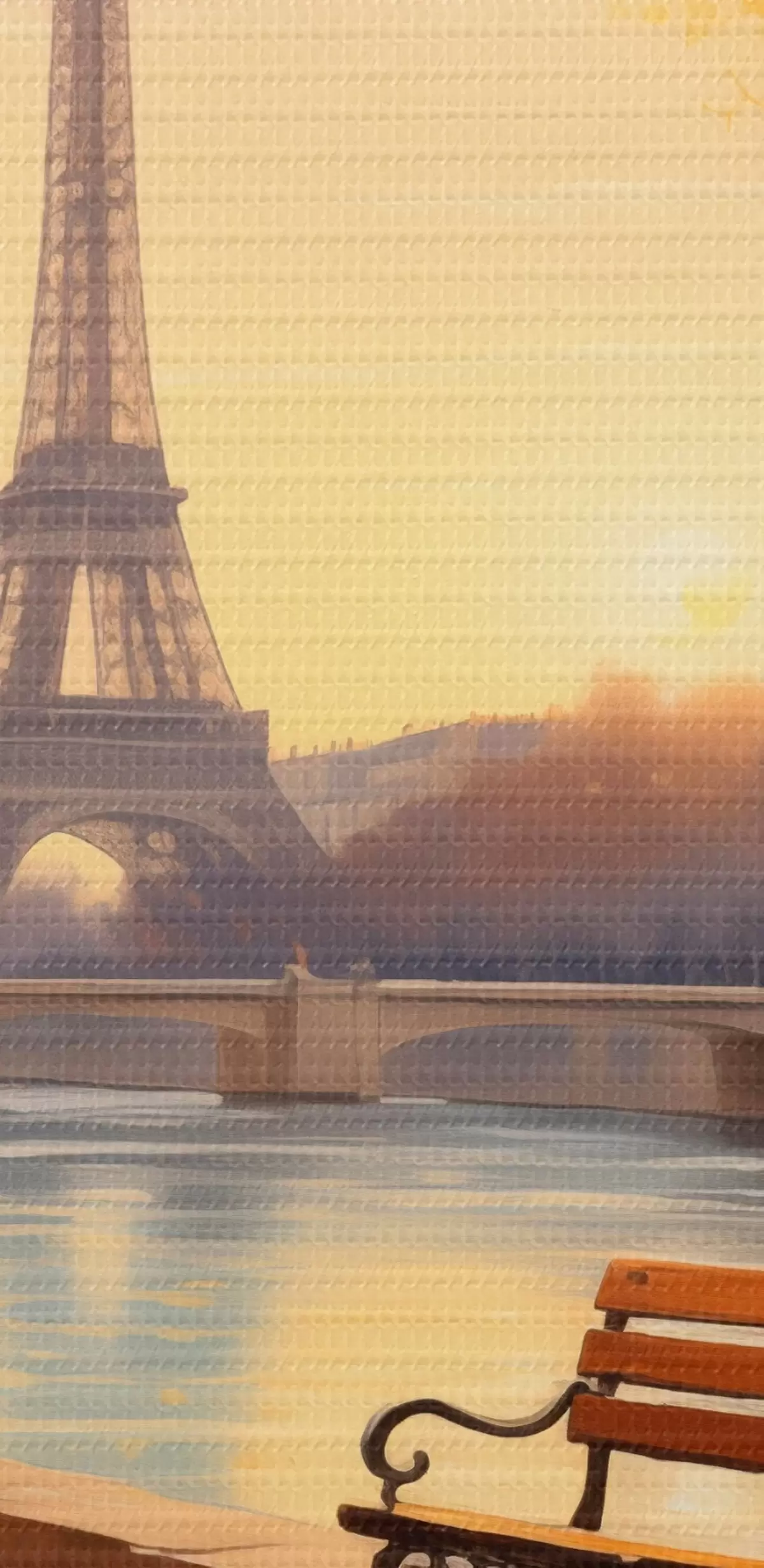 Obrázek Podzim v Paříži s výhledem na Eiffelovu věž, nábřeží Seiny pokryté listím, lavičky a pouliční lampy dodávající romantickou atmosféru. Nr r42577