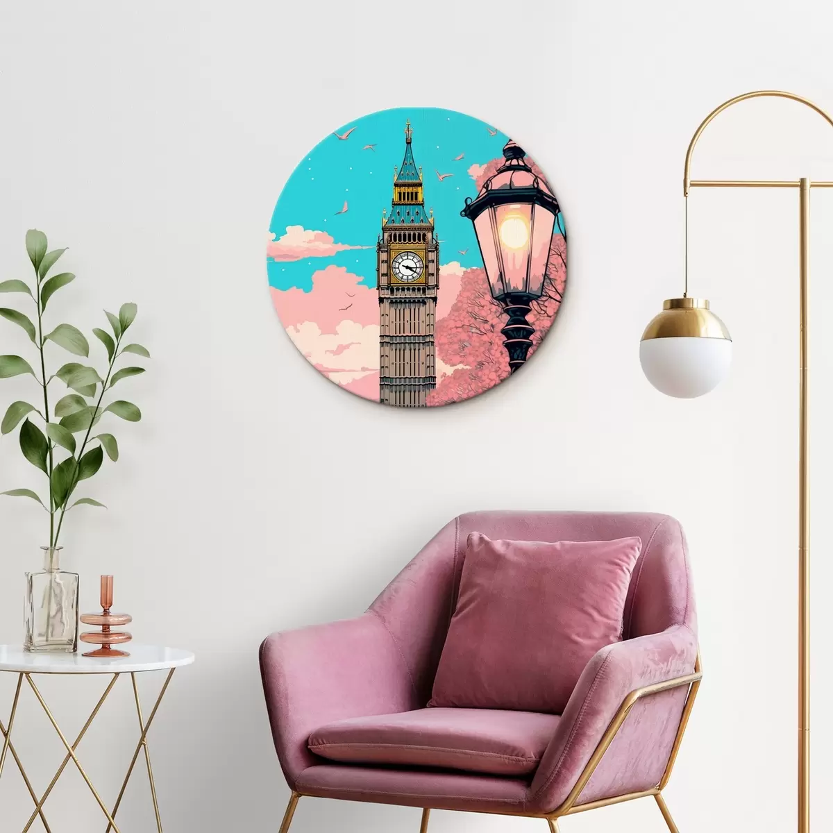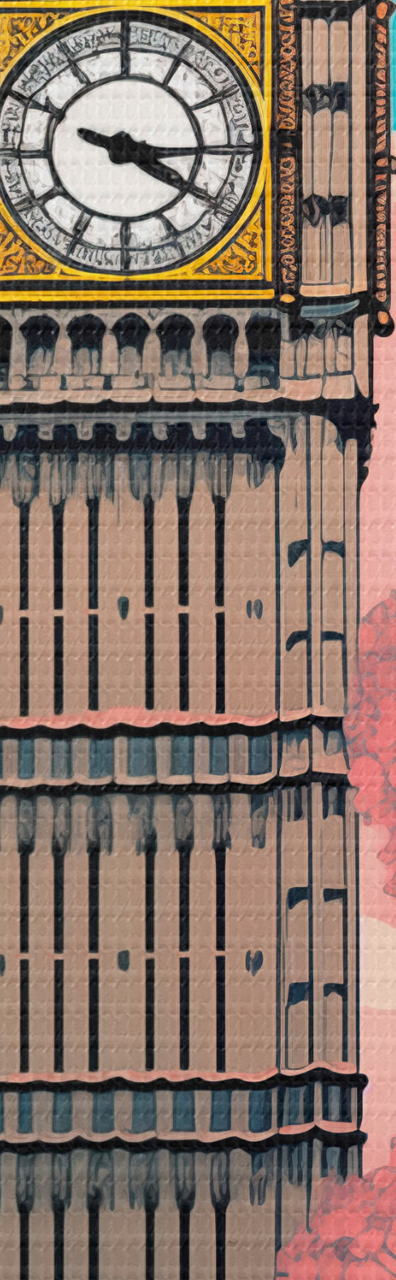 Obrázek Pohled na Big Ben s jarními růžovými stromy, jasně modrou oblohou a historickou pouliční lampou v popředí Nr r42578