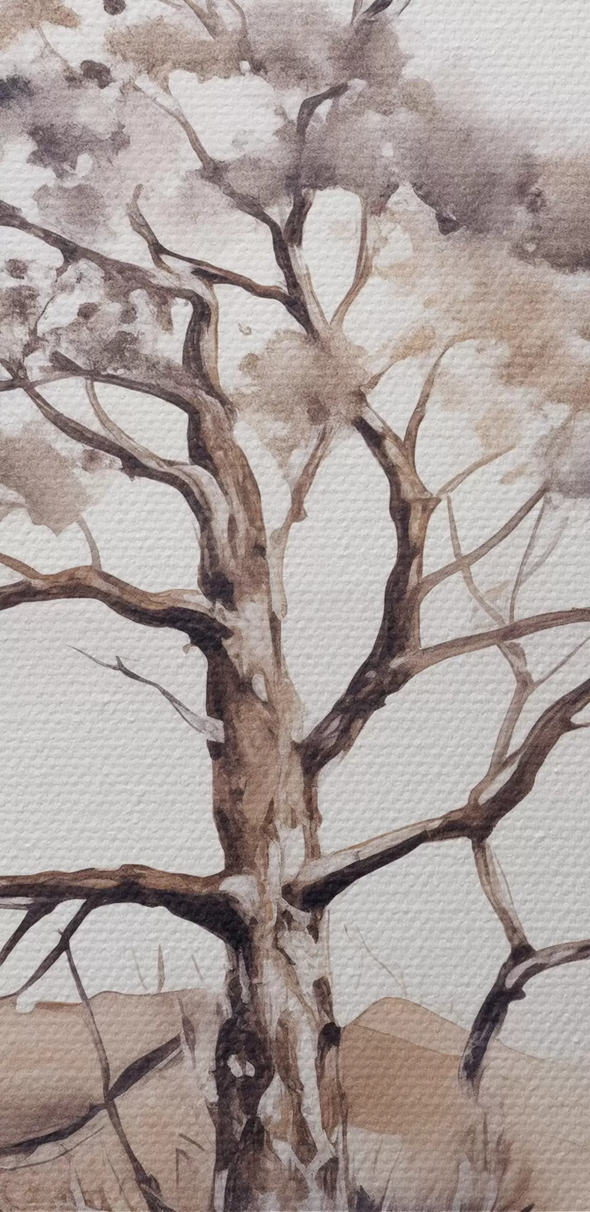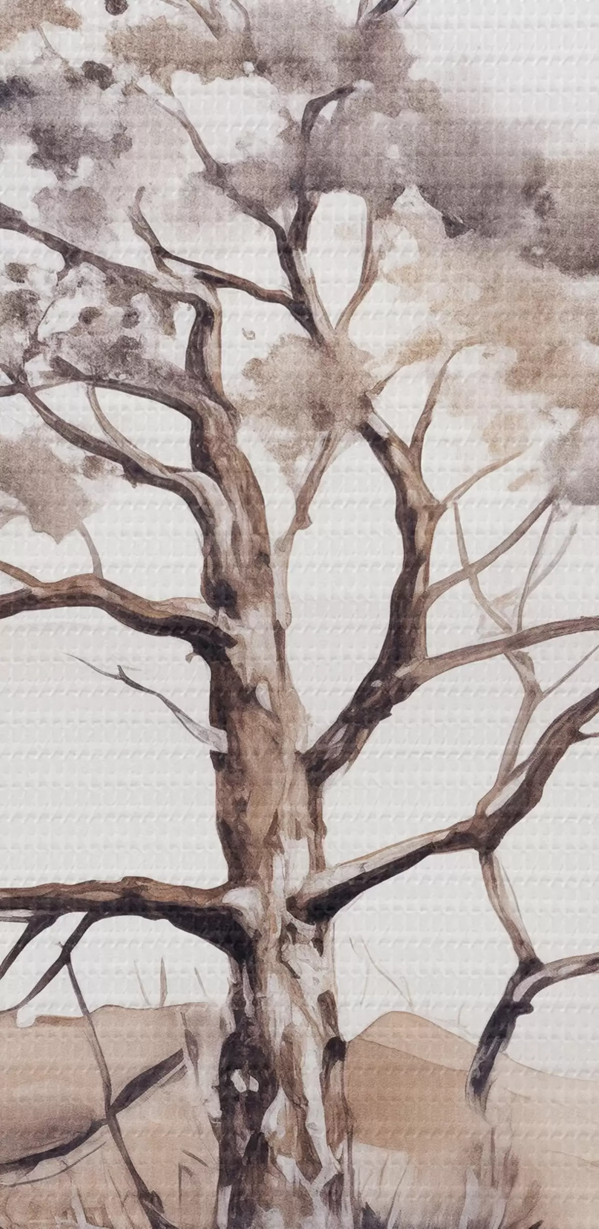 Obrázek Osamělý strom s pokrouceným kmenem a řídkými větvemi na jemném, tlumeném pozadí hor Nr r42715
