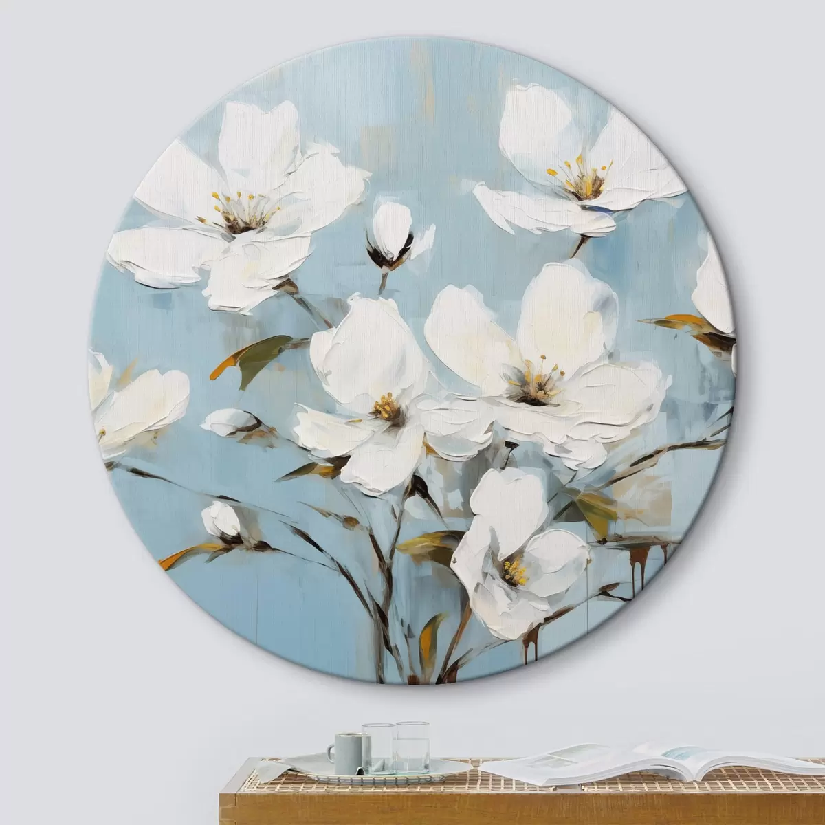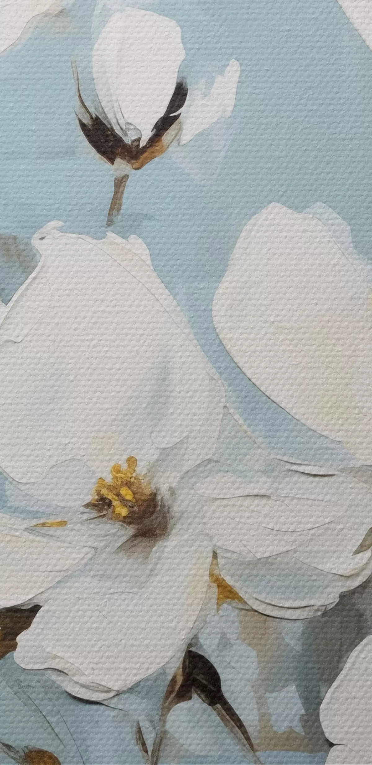 Obrázek Bílé květy s jemnými okvětními lístky a zelenými listy na světle modrém pozadí imitace olejomalby Nr r42719
