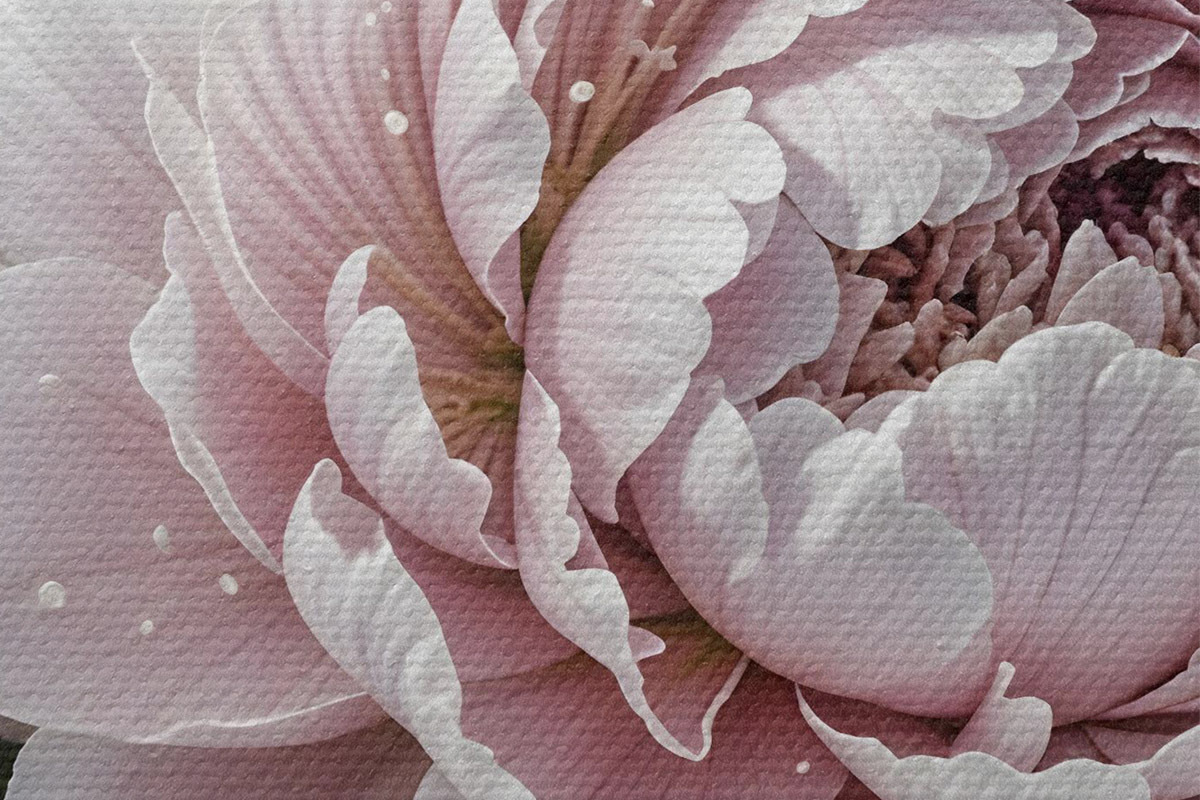 Obrázek Světle růžové a bílé pivoňky s kapkami vody na okvětních lístcích, pozadí je bílý povrch Nr r43158