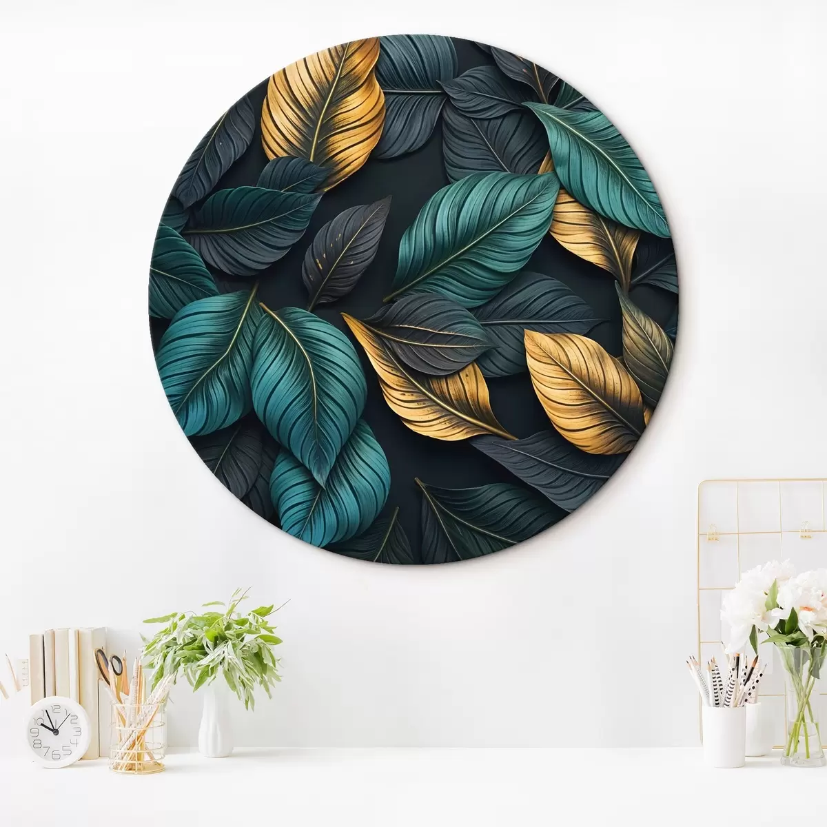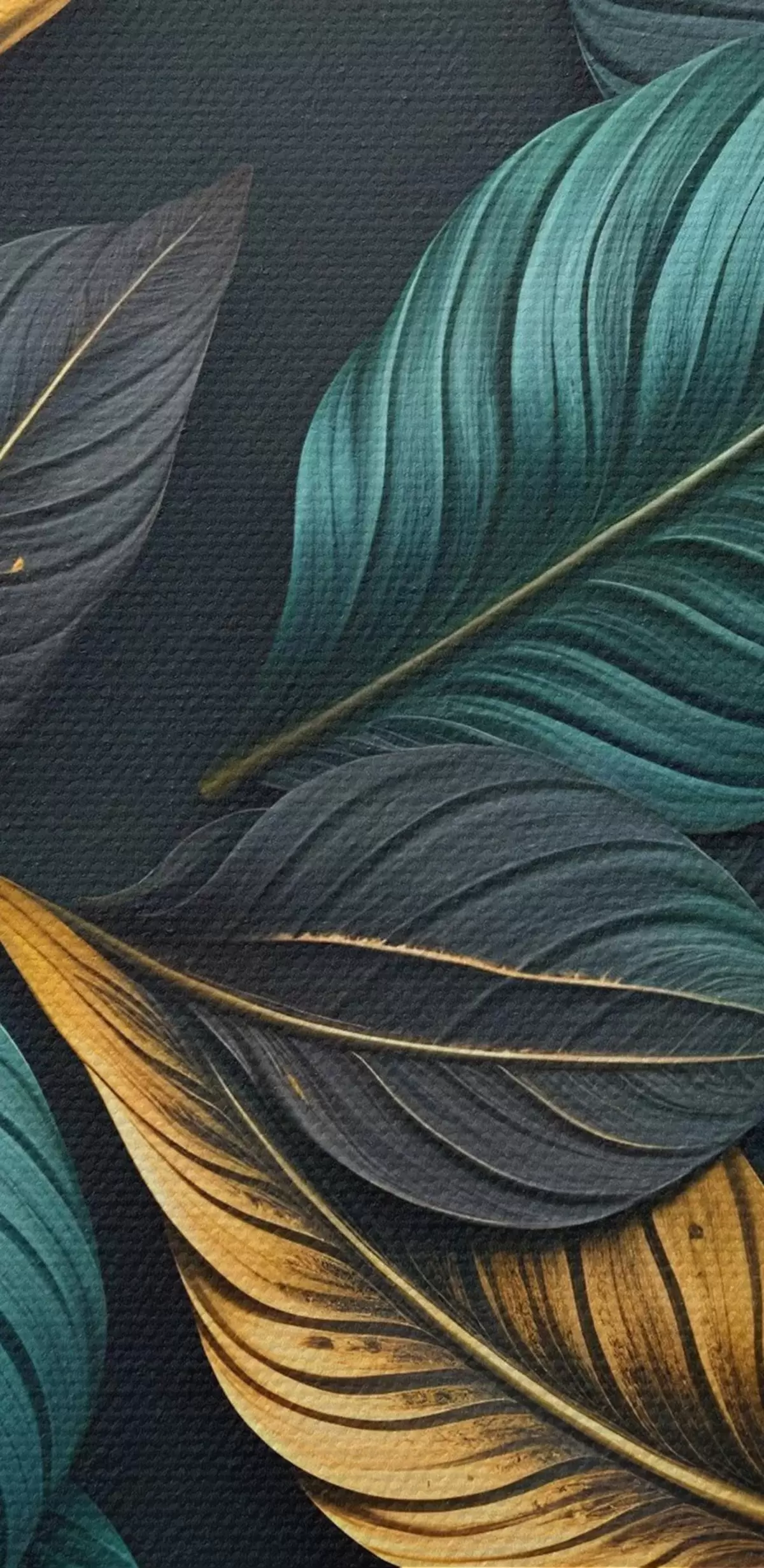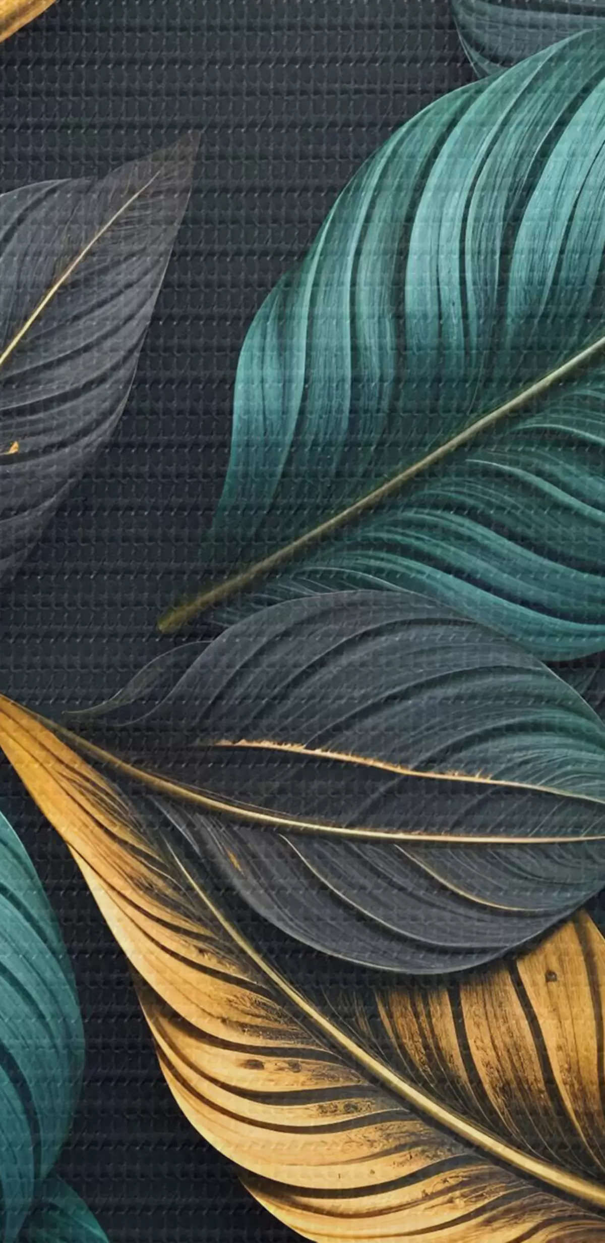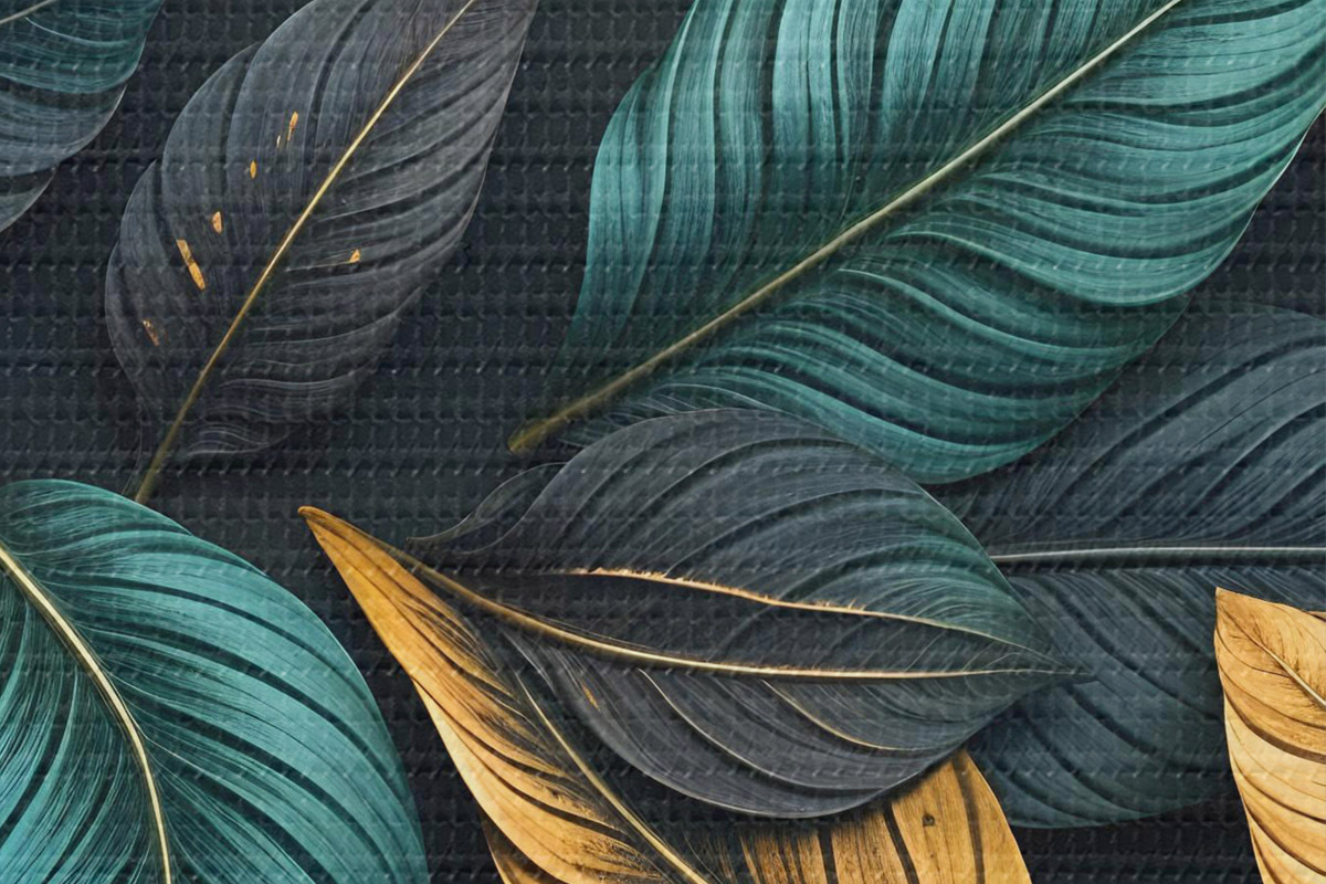 Obrázek Tmavě zelené, žluté a černé listy s tmavými žilkami na tmavém pozadí, elegantní tropická atmosféra Nr r43164
