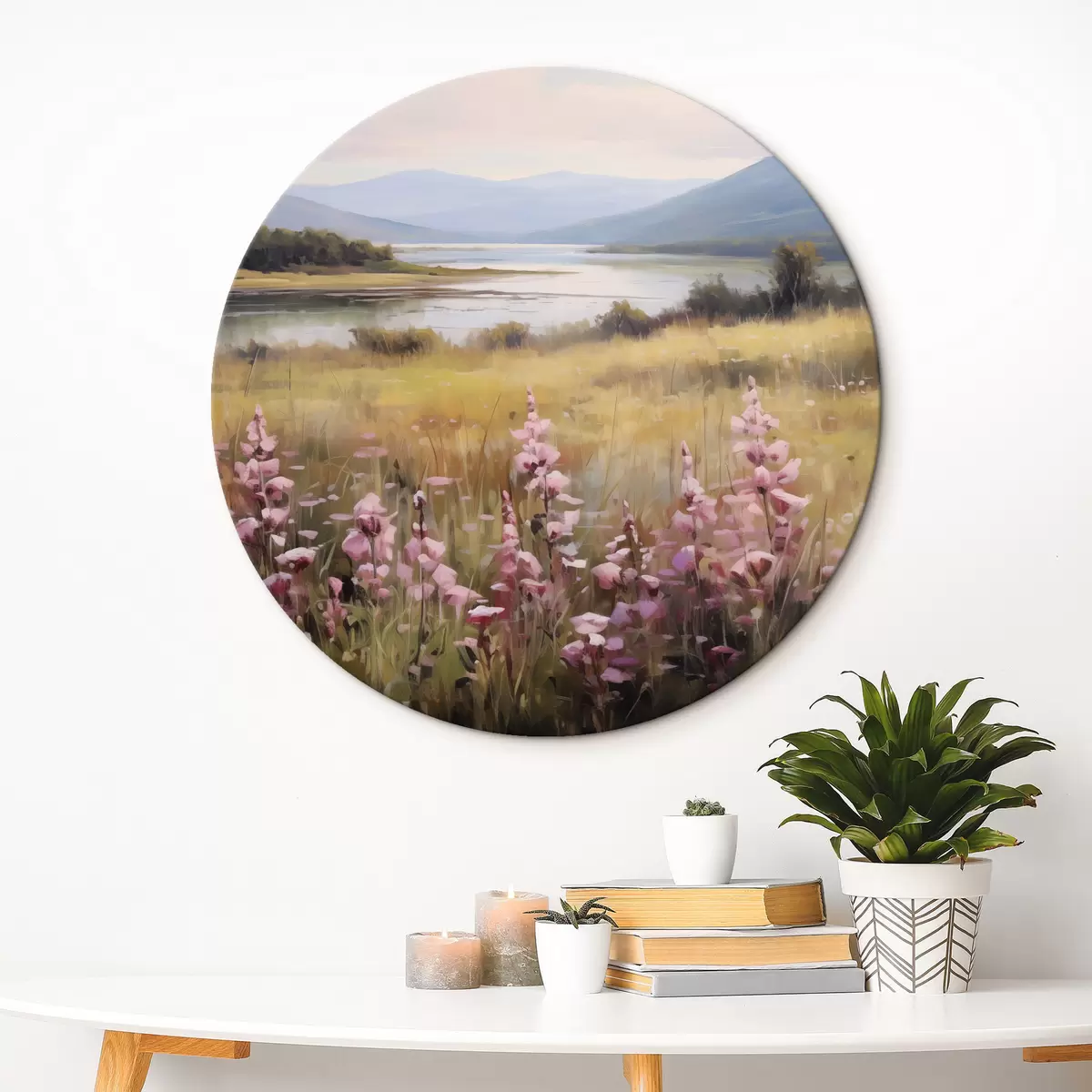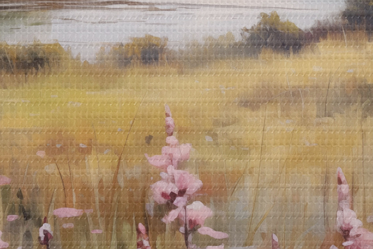 Obrázek Krajina s polem růžových květů, jezerem a horami v pozadí, pod zataženou oblohou Nr r43165