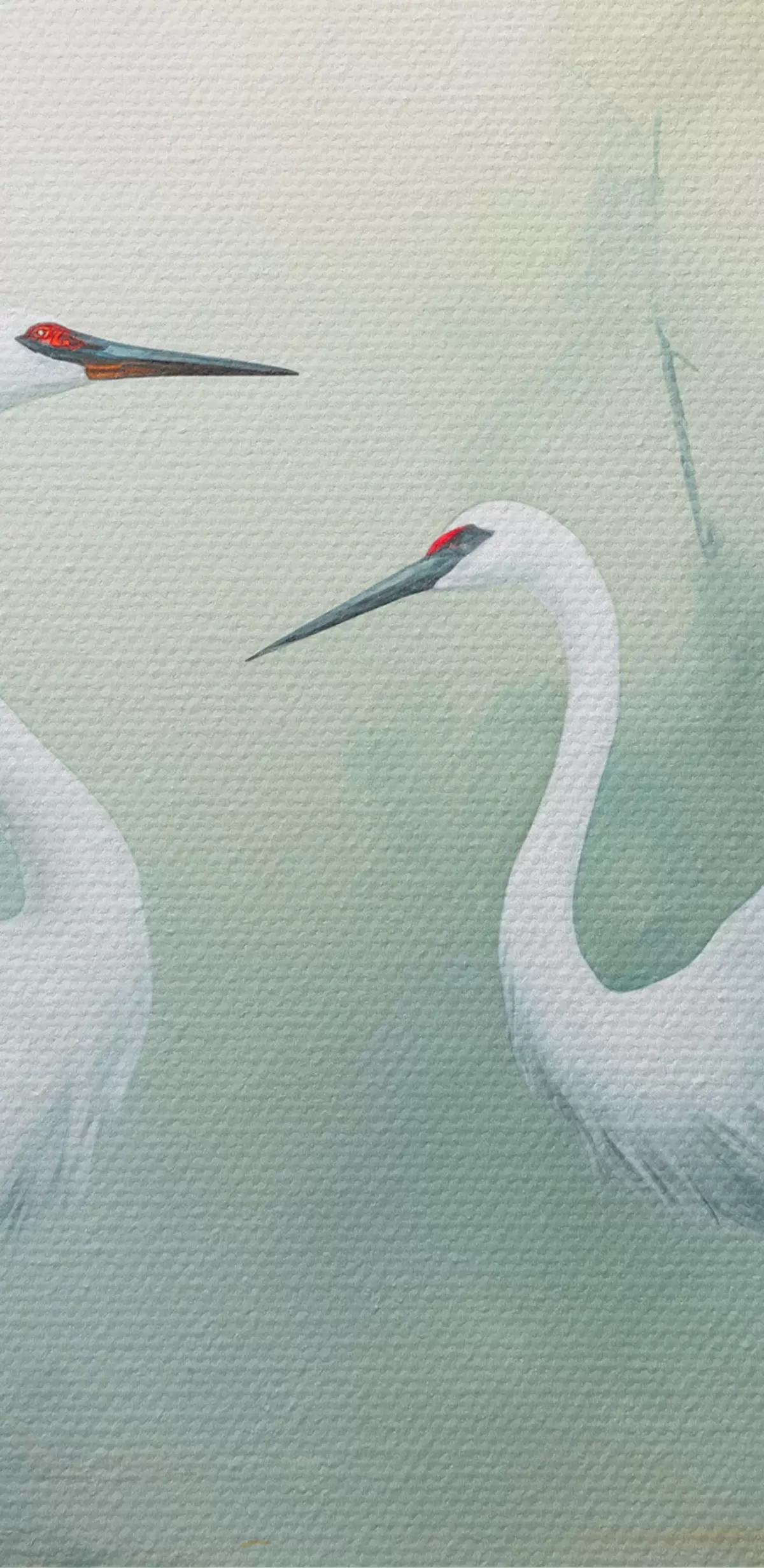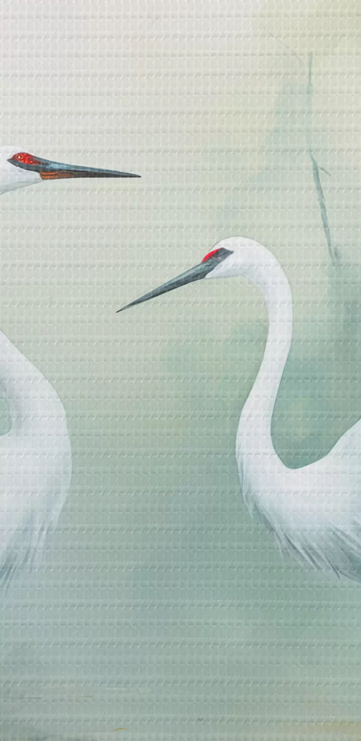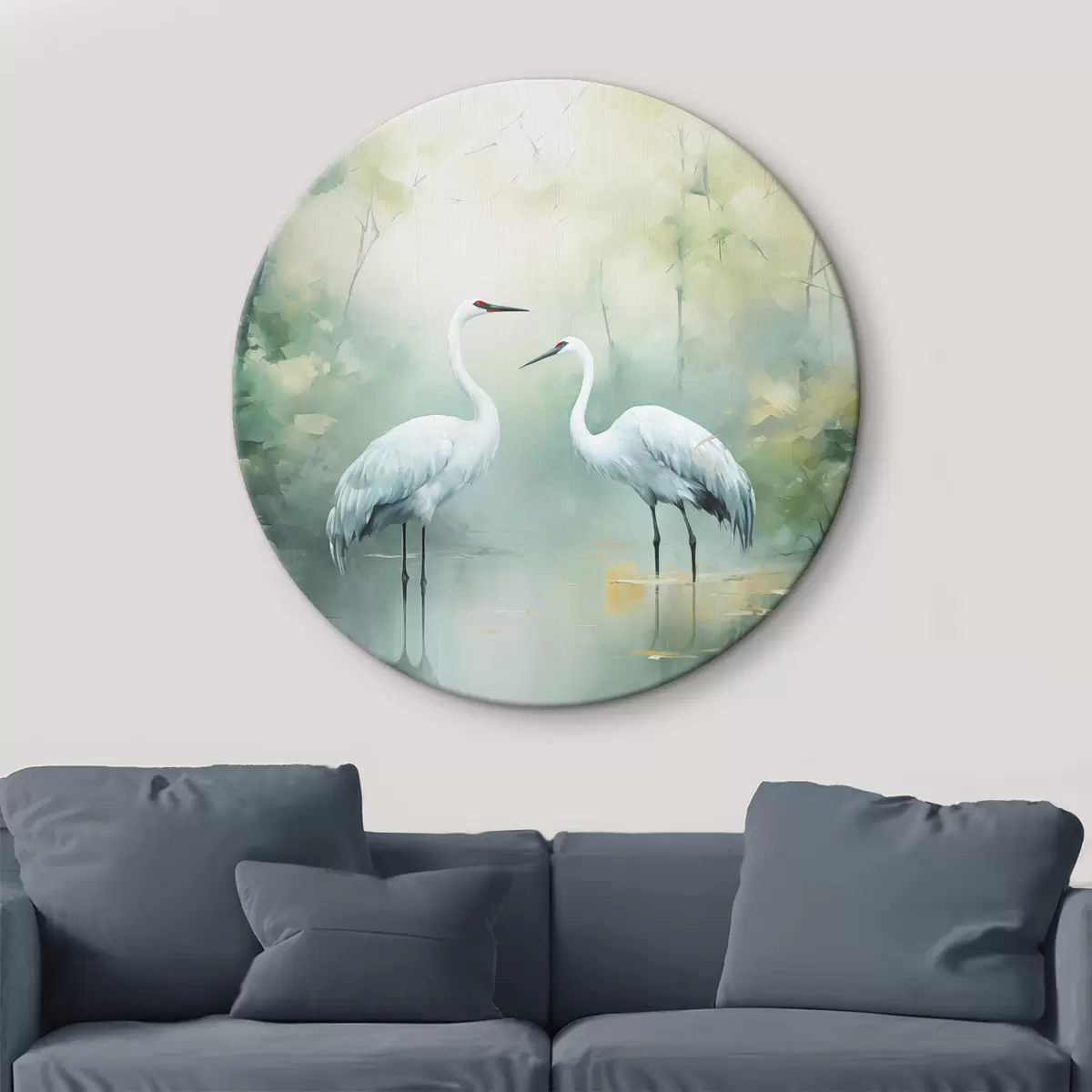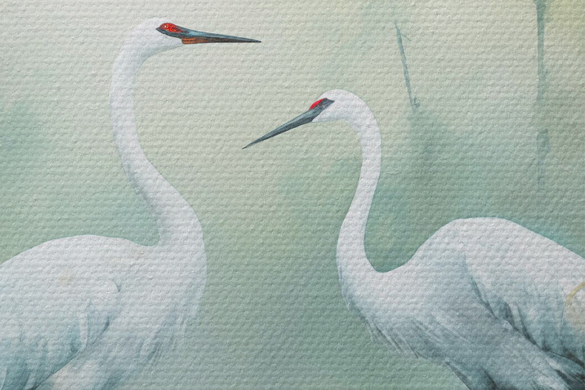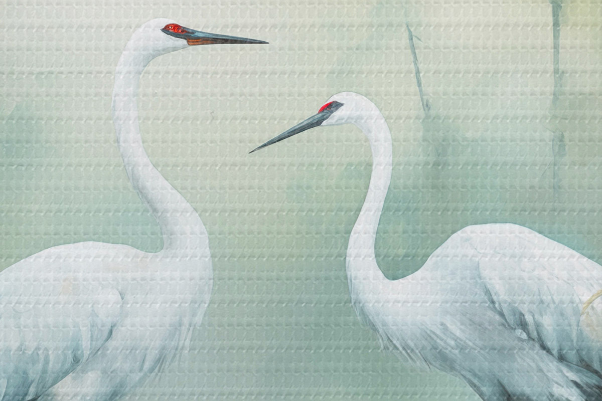 Obrázek Dva bílí jeřábi stojící v rybníce , obklopeni zeleným lesem s měkkým, rozptýleným osvětlením Nr r43166