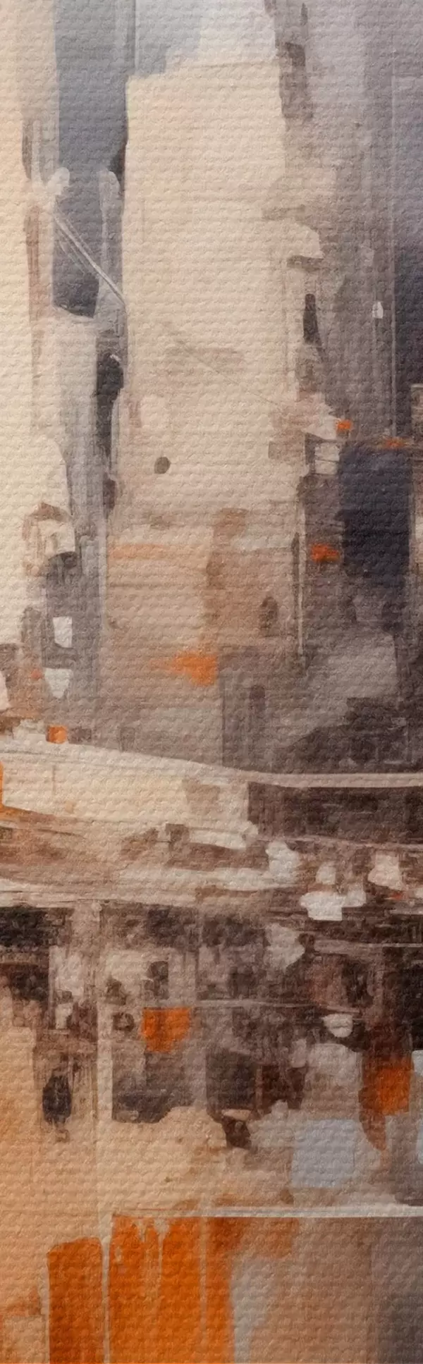 Obrázek Abstraktní malba městské krajiny s vysokými budovami v odstínech hnědé, šedé a bílé barvy , odrážející se ve vodě pod nimi Nr r43168