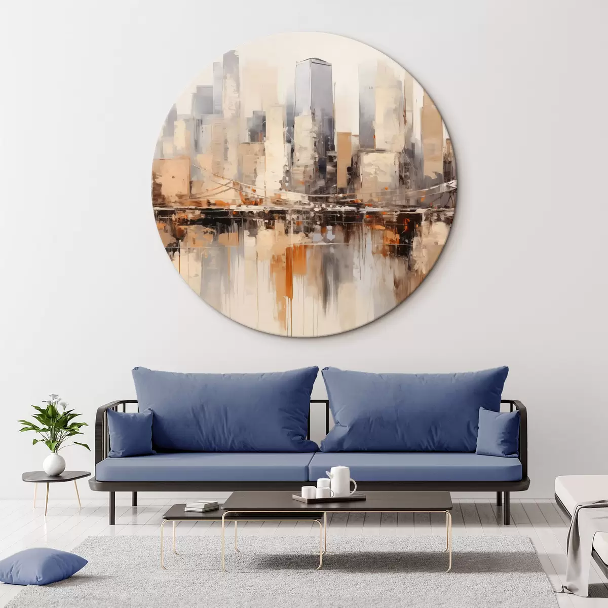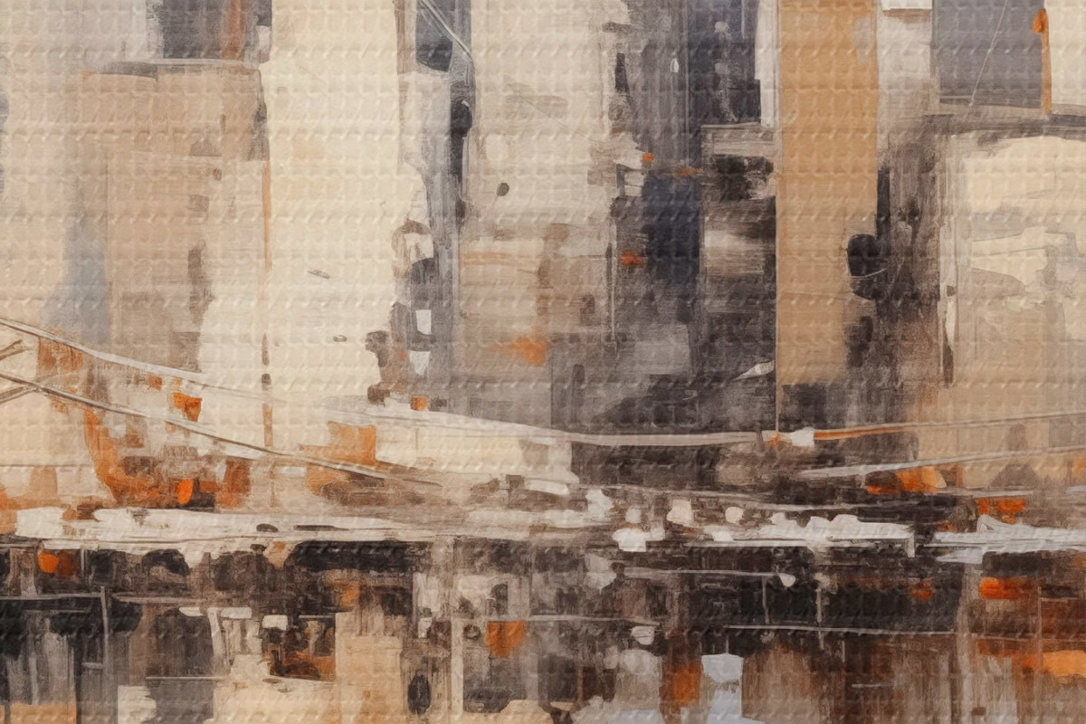 Obrázek Abstraktní malba městské krajiny s vysokými budovami v odstínech hnědé, šedé a bílé barvy , odrážející se ve vodě pod nimi Nr r43168