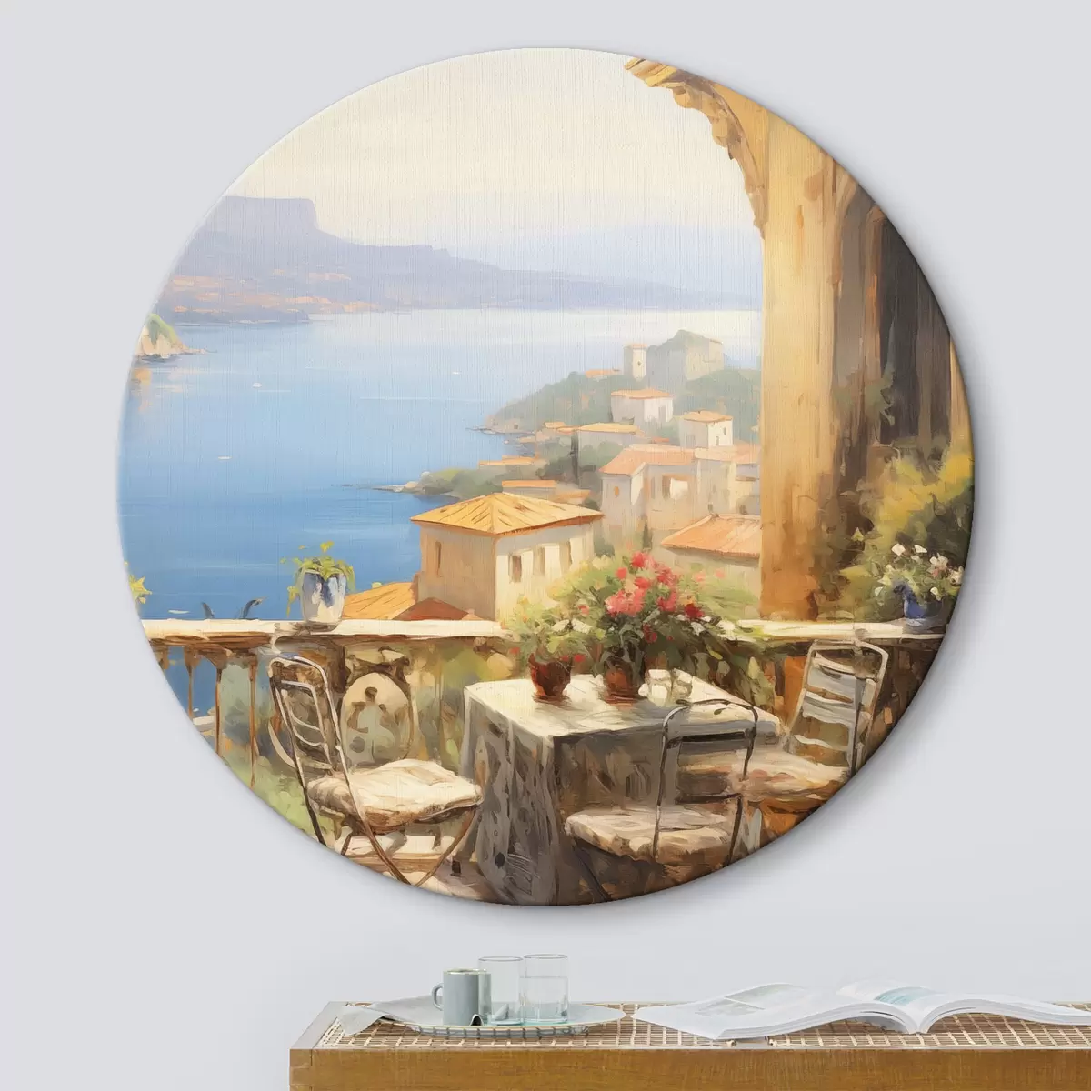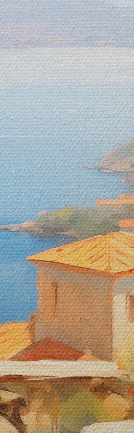 Obrázek Olejomalba imitace balkonu s květinami, s výhledem na moře, domy na pobřeží, slunečný den, modrá obloha Nr r43173