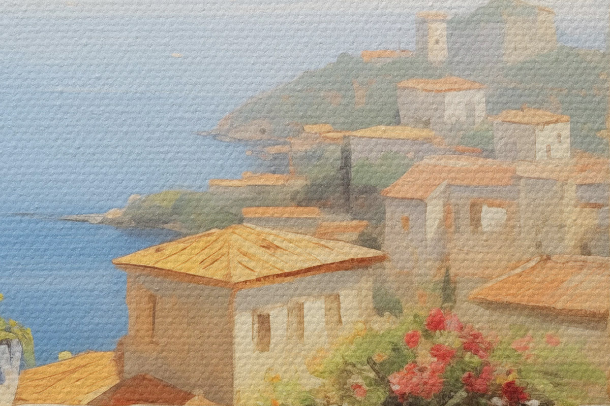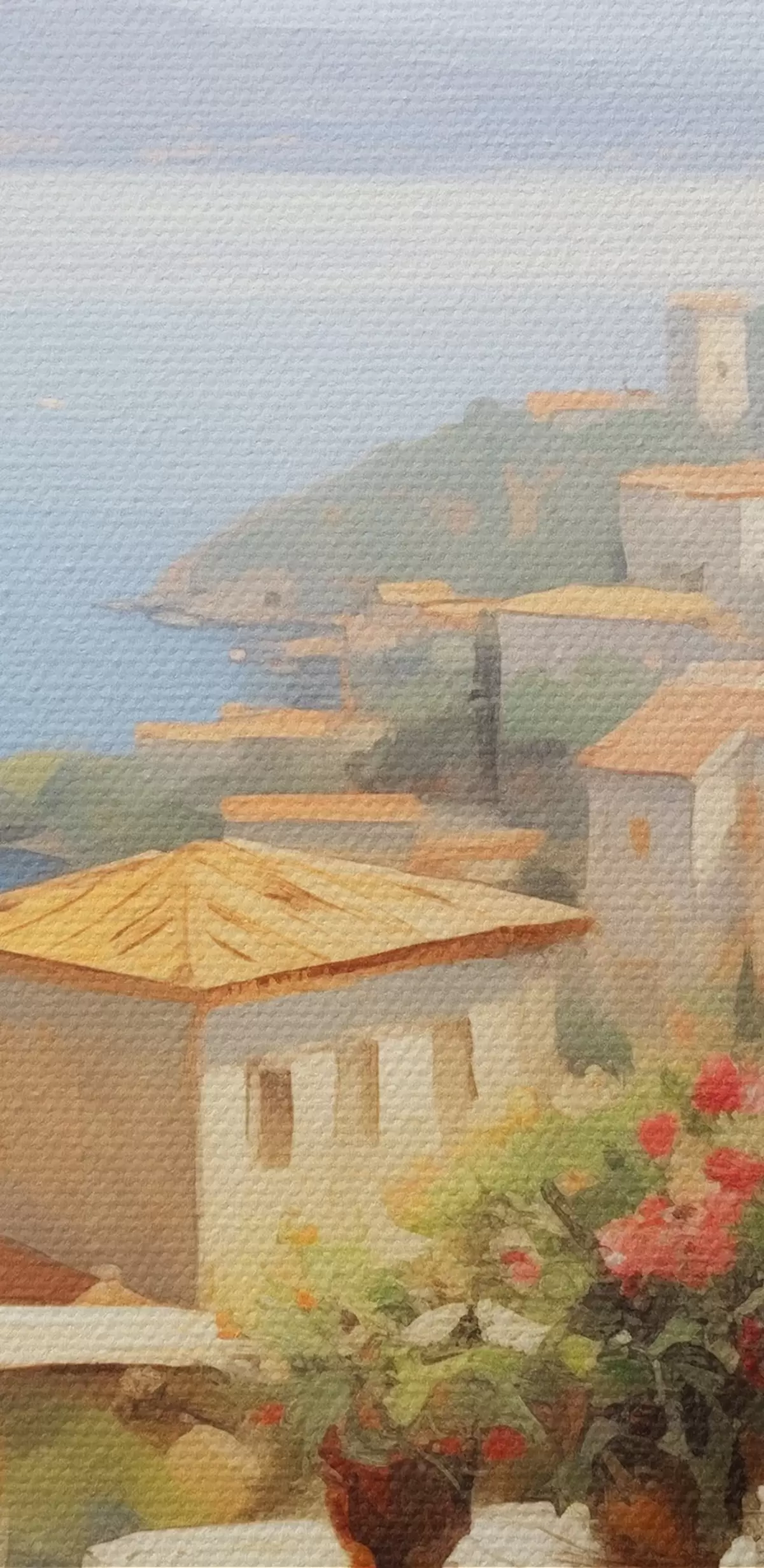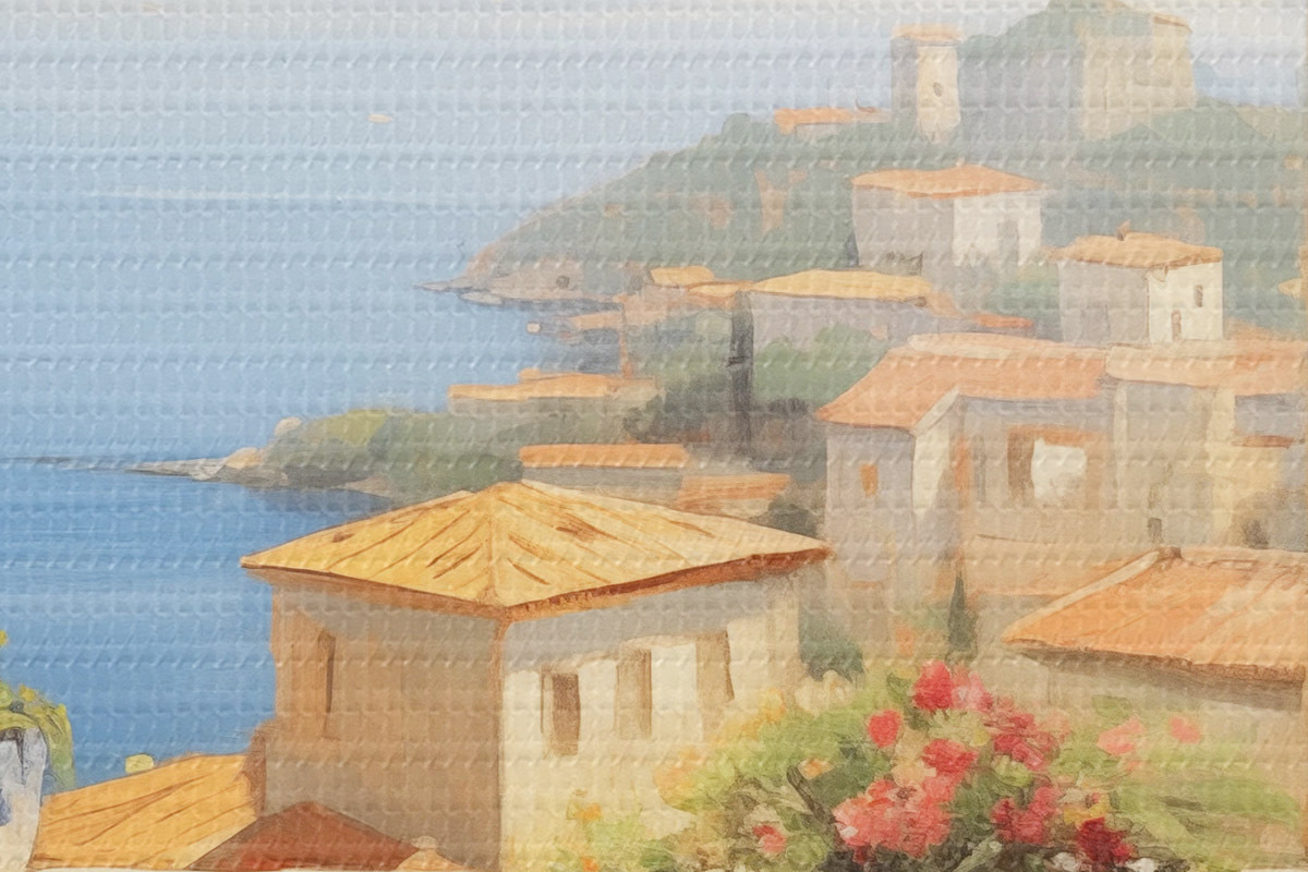 Obrázek Olejomalba imitace balkonu s květinami, s výhledem na moře, domy na pobřeží, slunečný den, modrá obloha Nr r43173