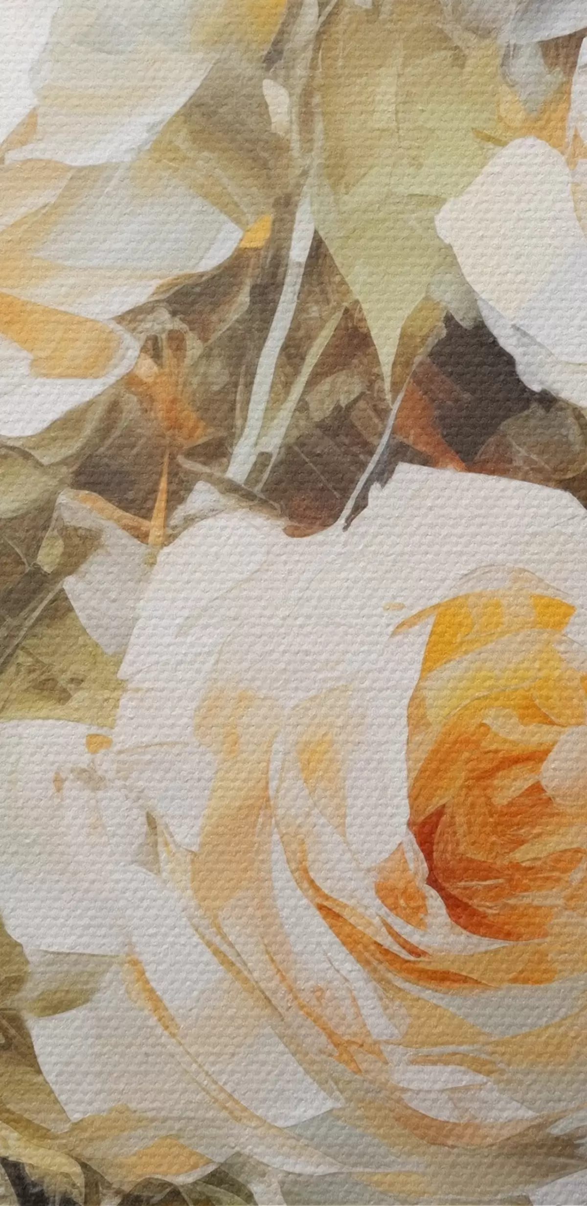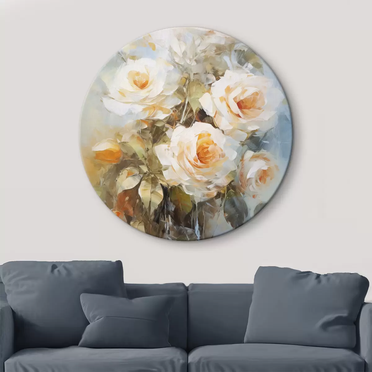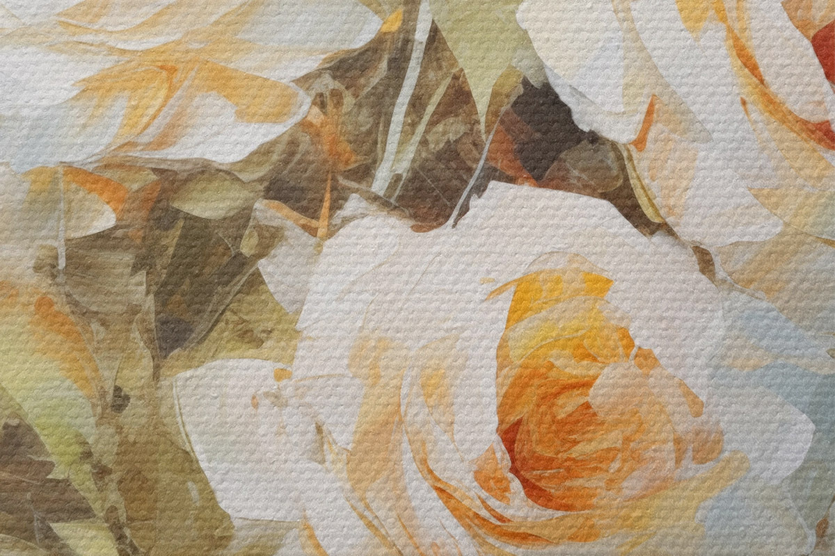 Obrázek Bílé růže s oranžovou barvou na jemném světle modrém pozadí, s viditelnými tahy štětce a malířským stylem Nr r43175