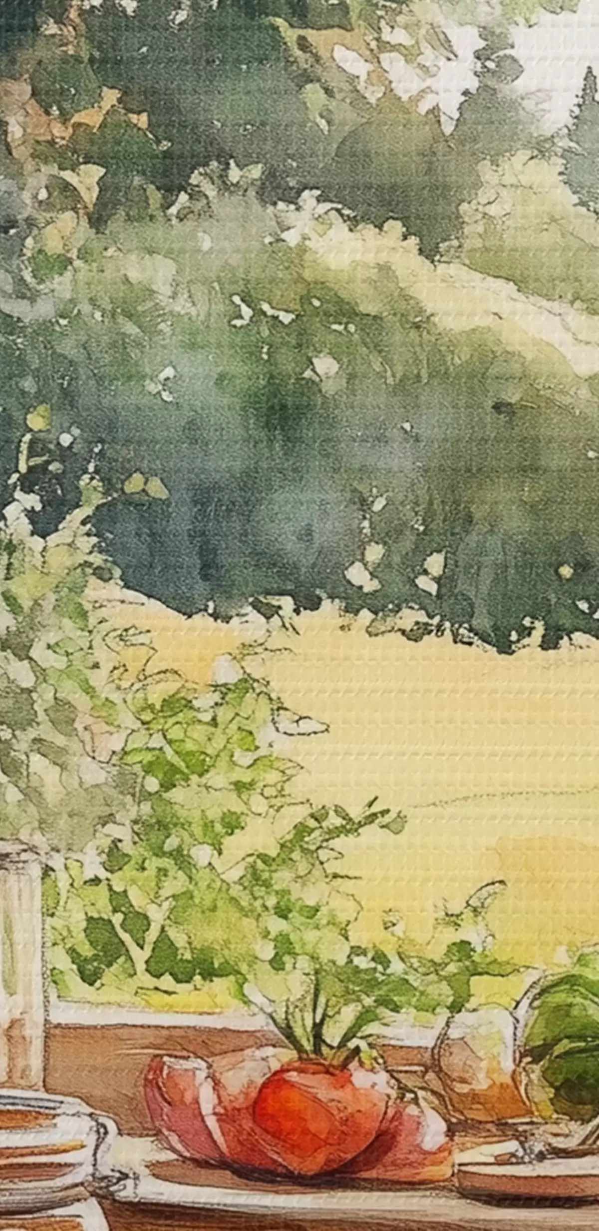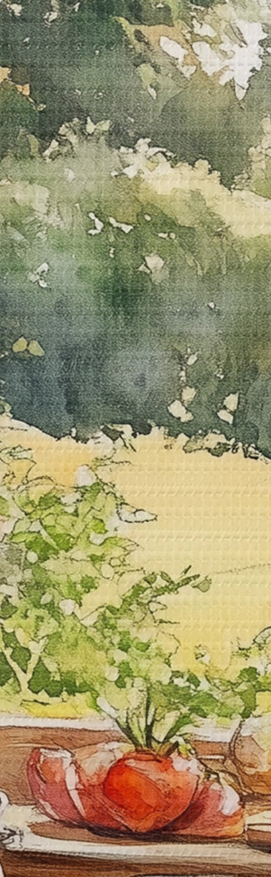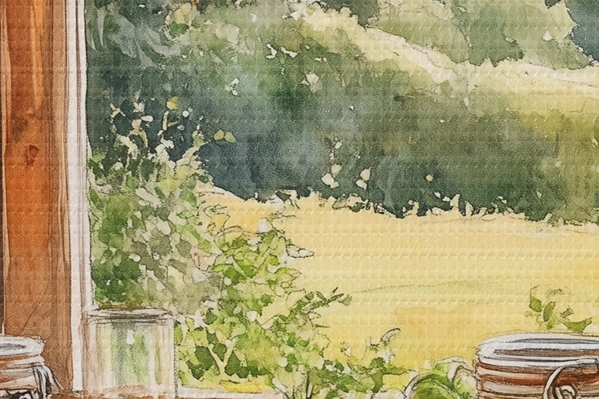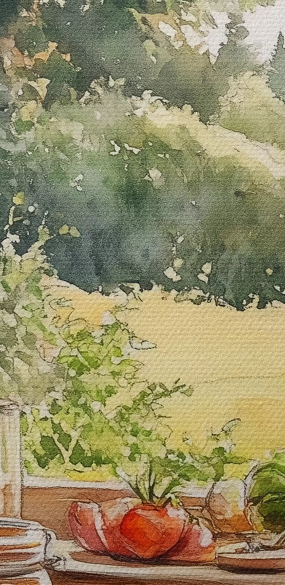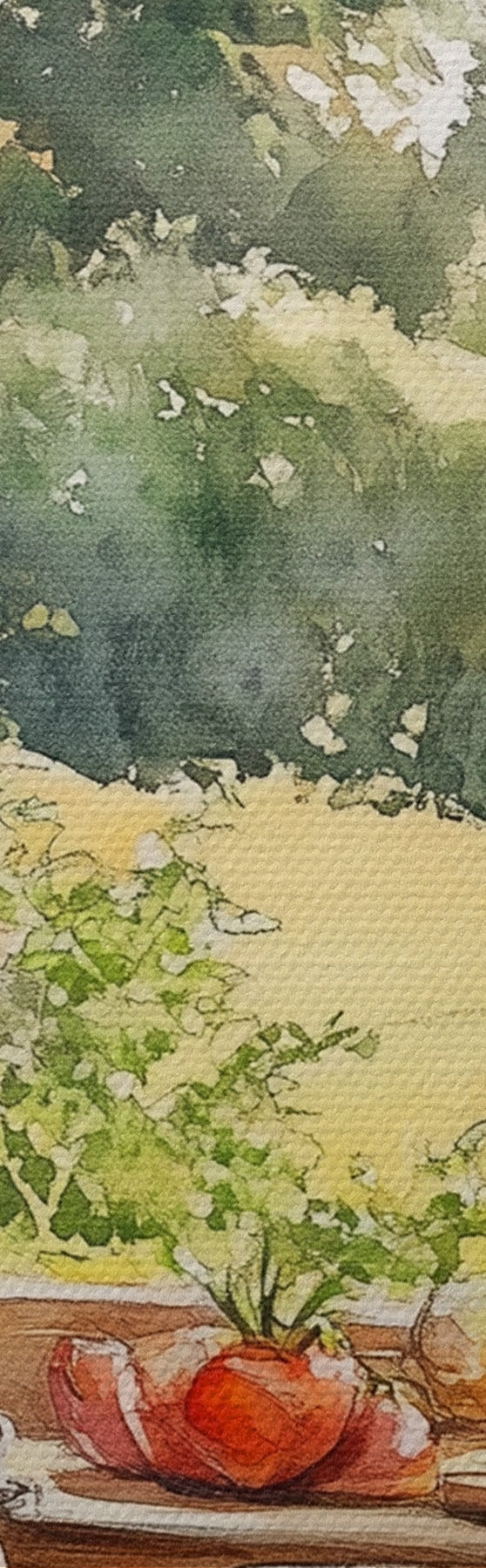 Obrázek Vesnická estetika, dřevěný dům, letní příroda, zelenina, akvarel Nr r43185