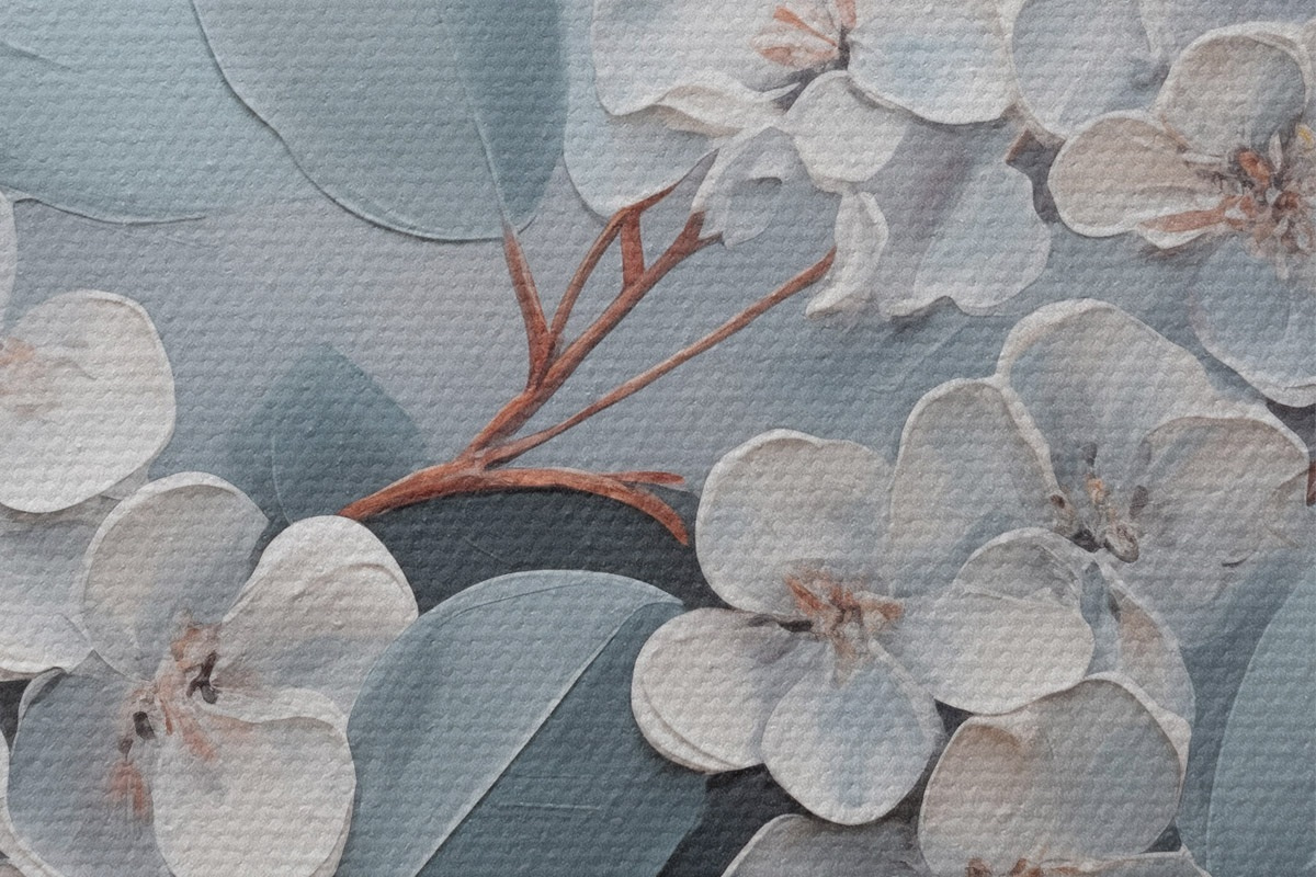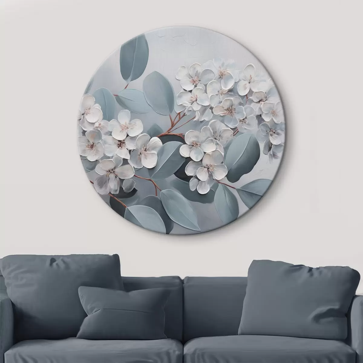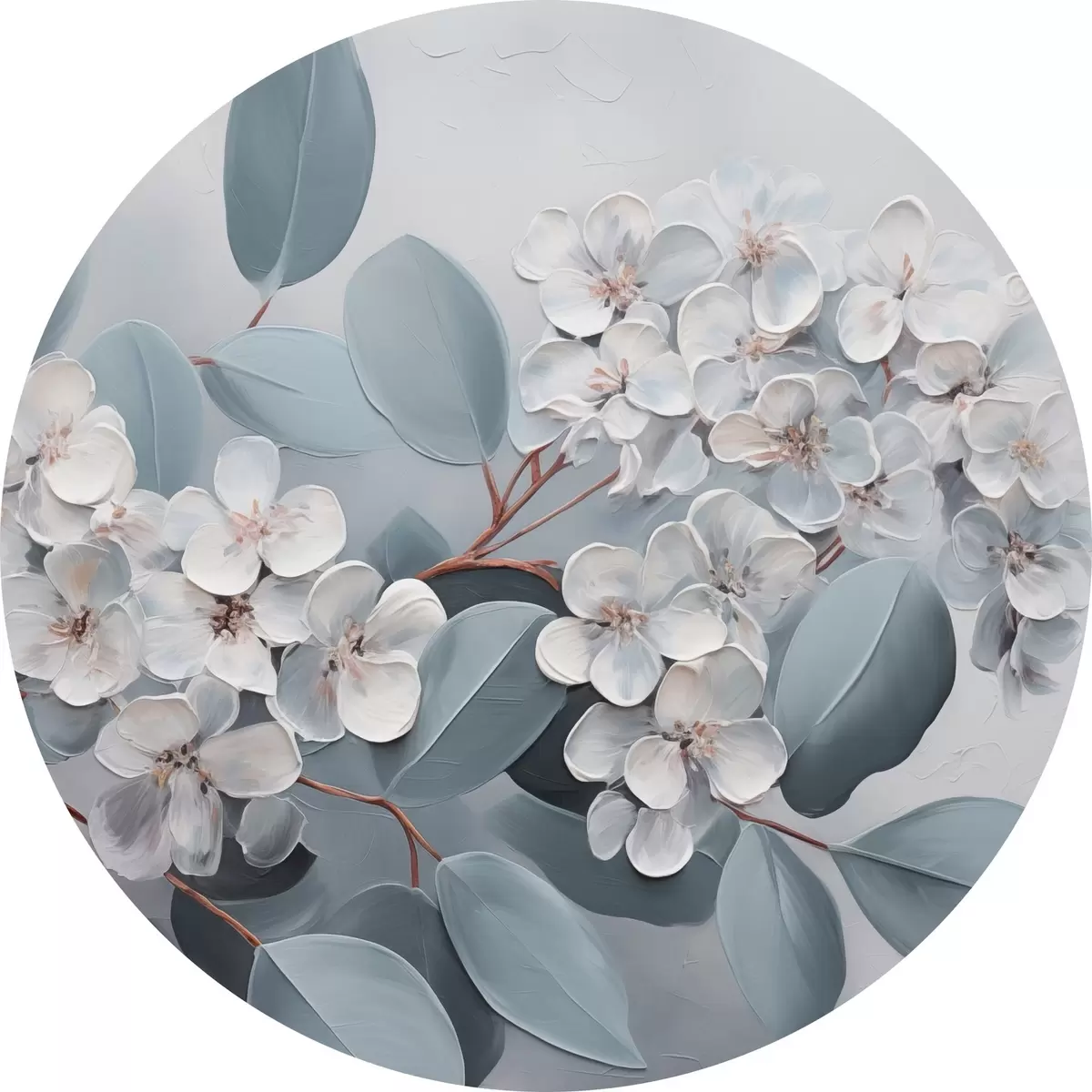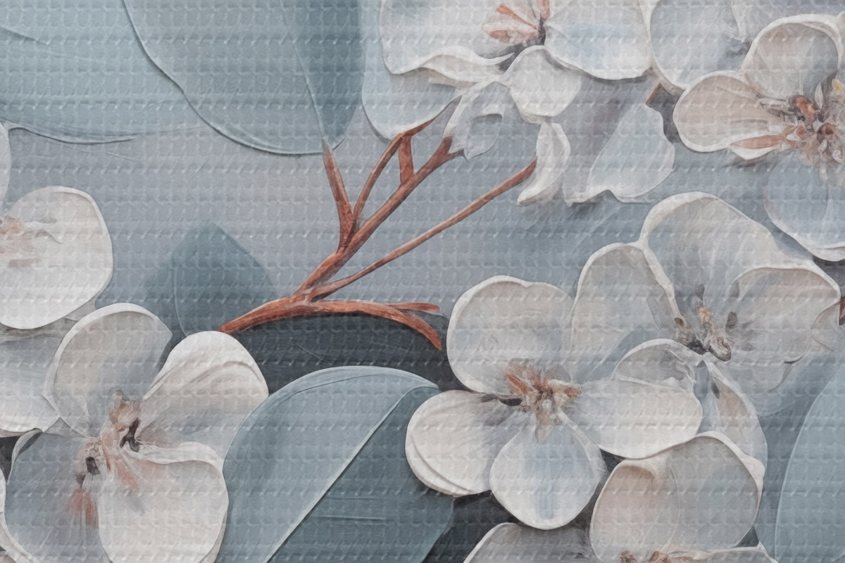 Obrázek Větev bílých květů hortenzie v plném květu s modrými listy na světle šedém pozadí, styl olejomalby Nr r43391