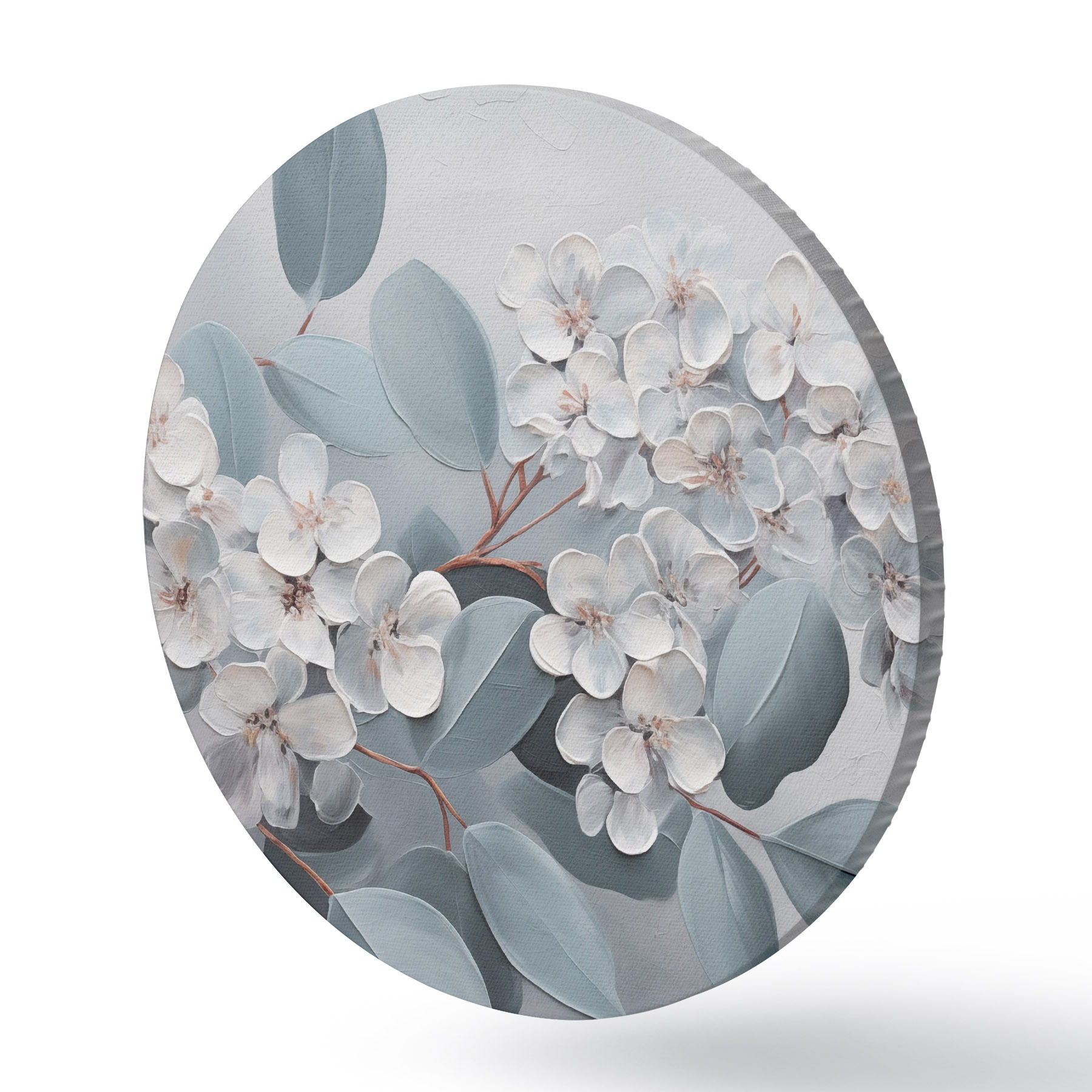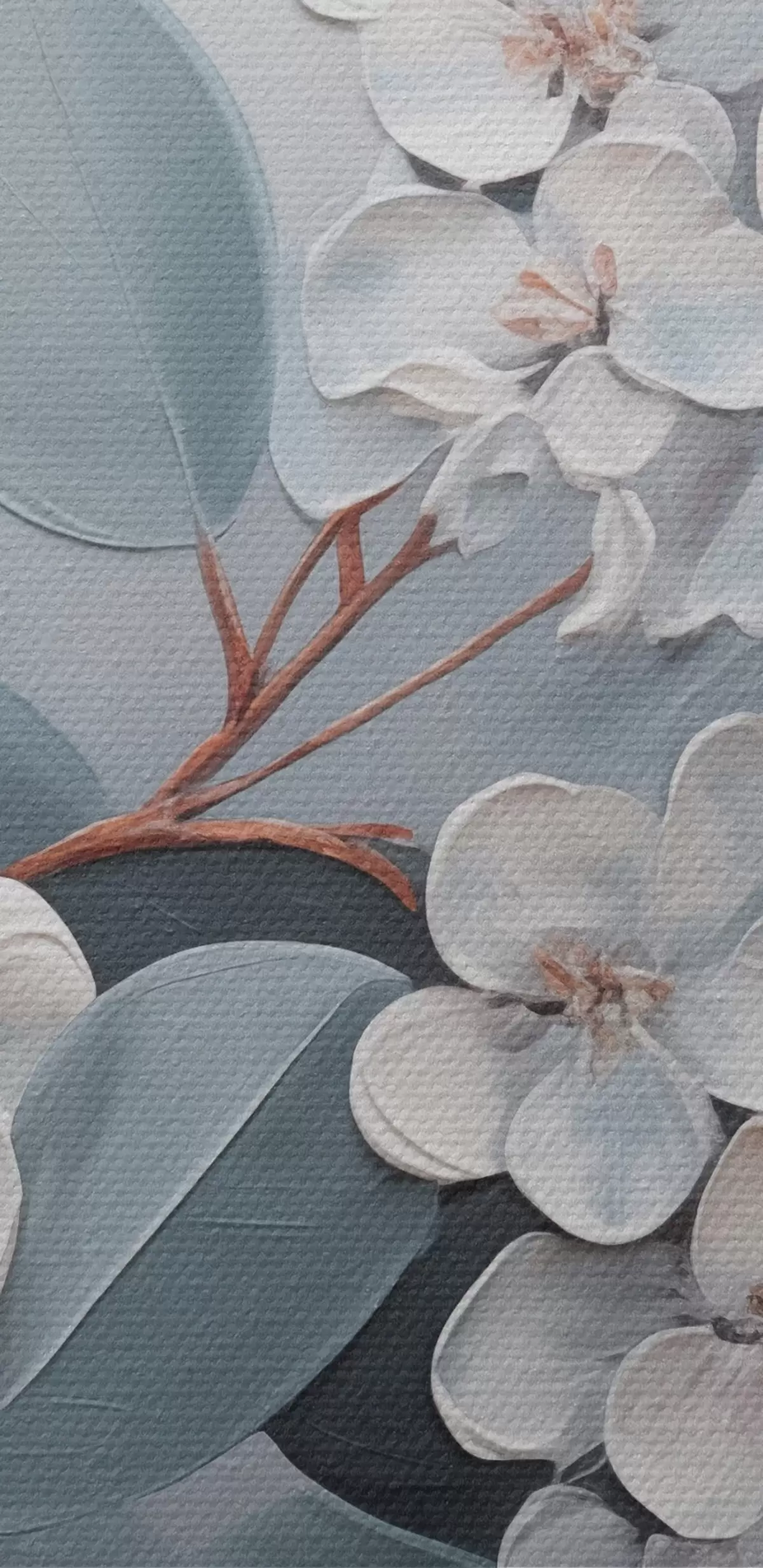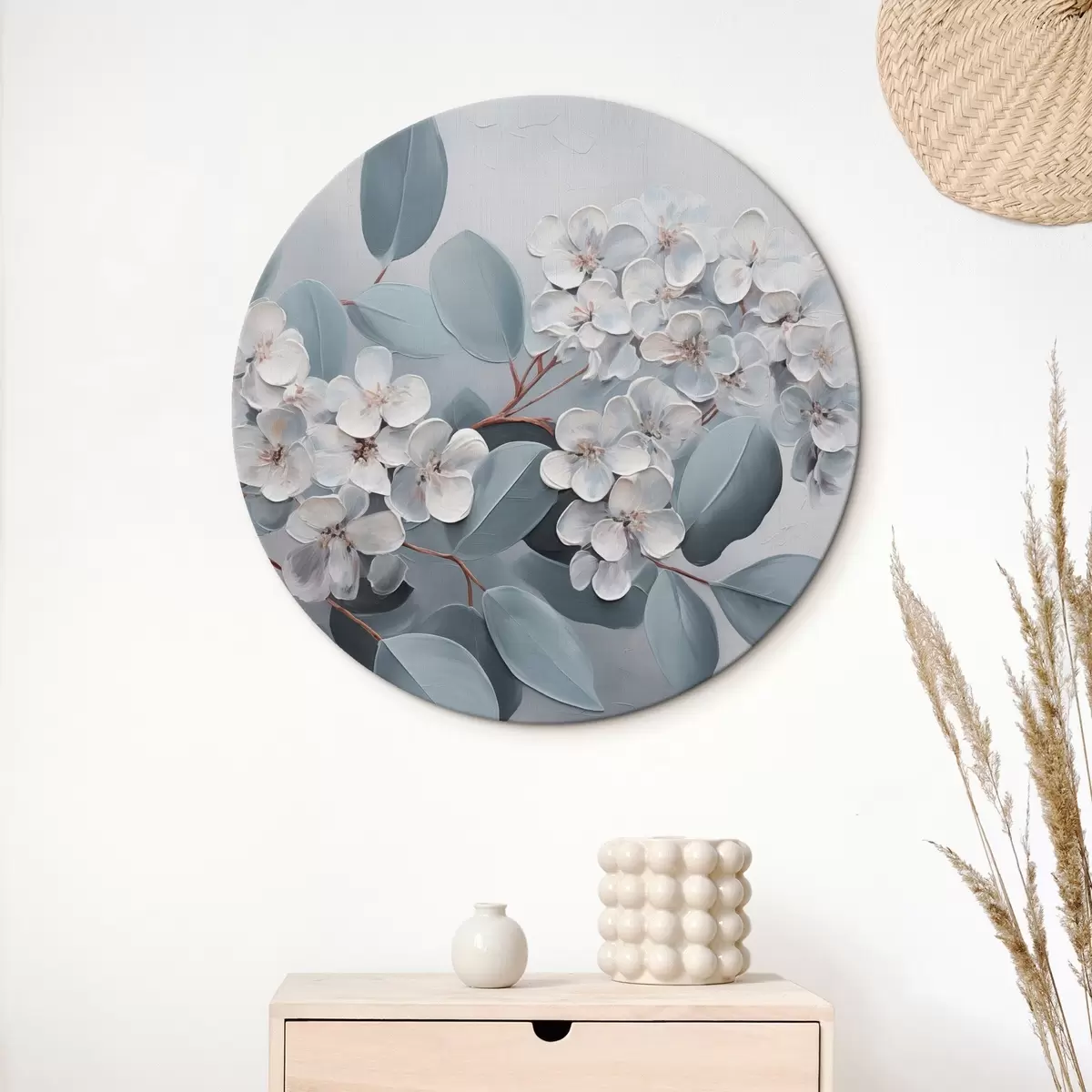 Obrázek Větev bílých květů hortenzie v plném květu s modrými listy na světle šedém pozadí, styl olejomalby Nr r43391