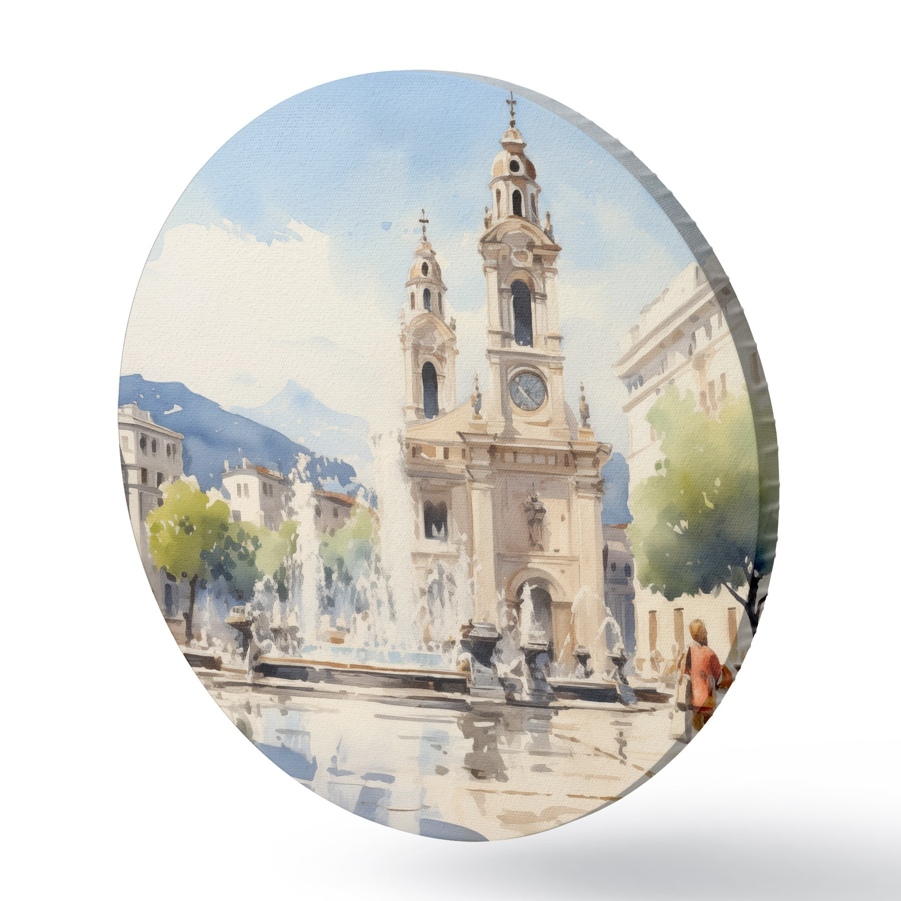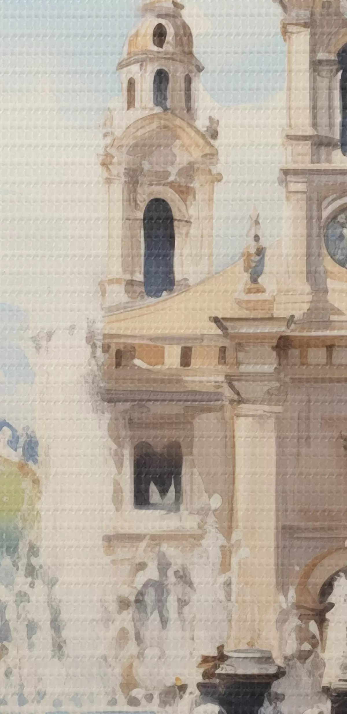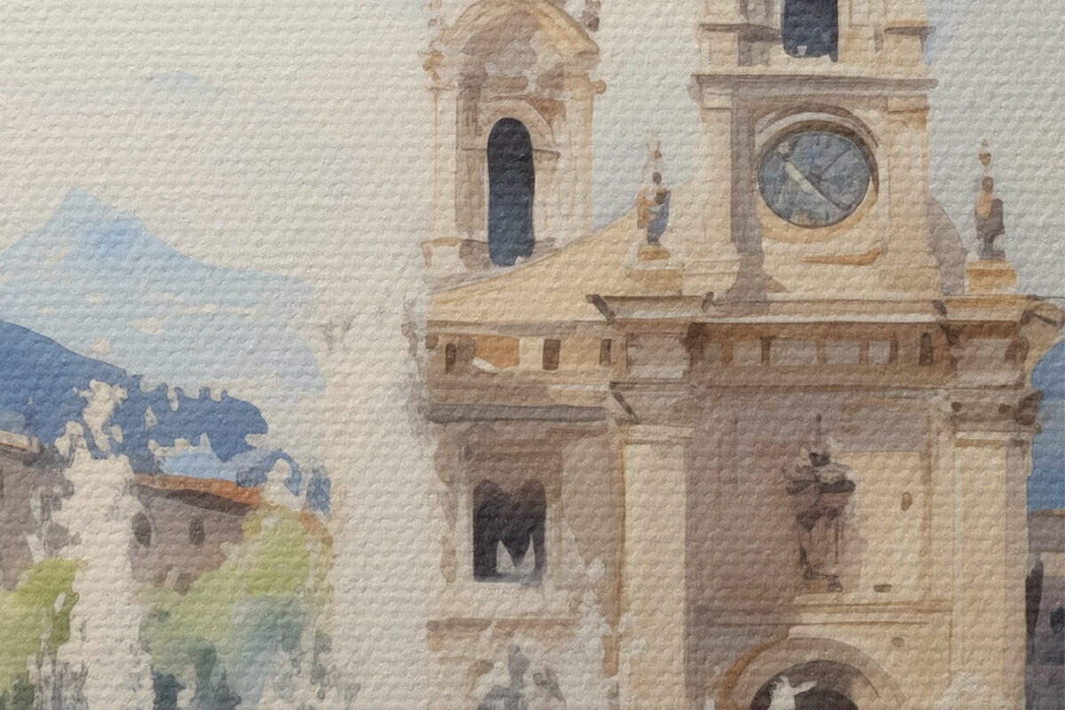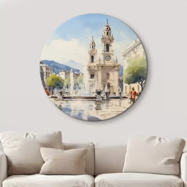Obrázek Abstraktní městská krajina s věží a kašnou na náměstí, hory v dálce, akvarel Nr r43397