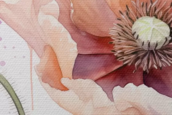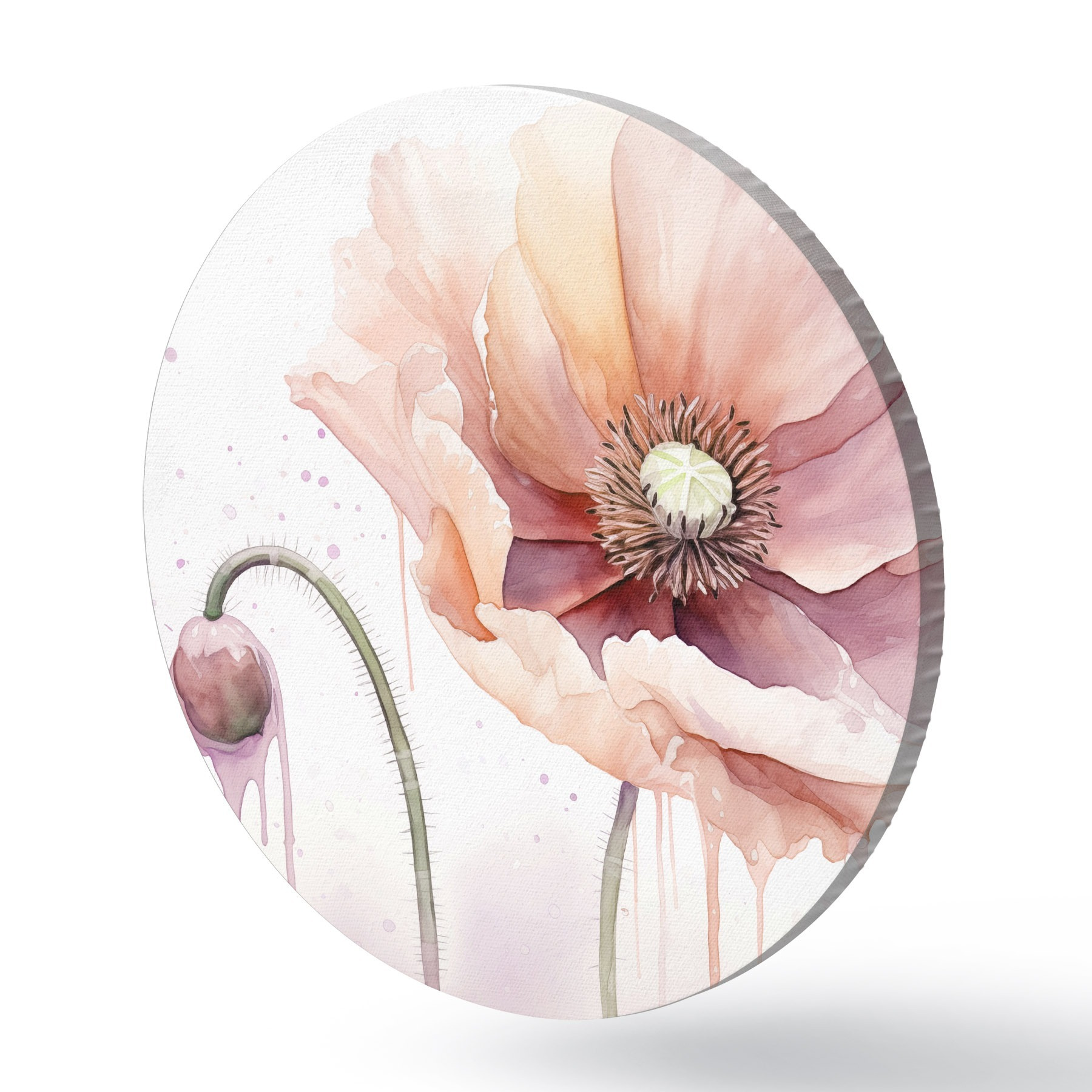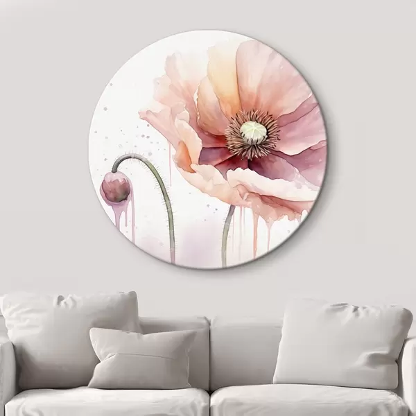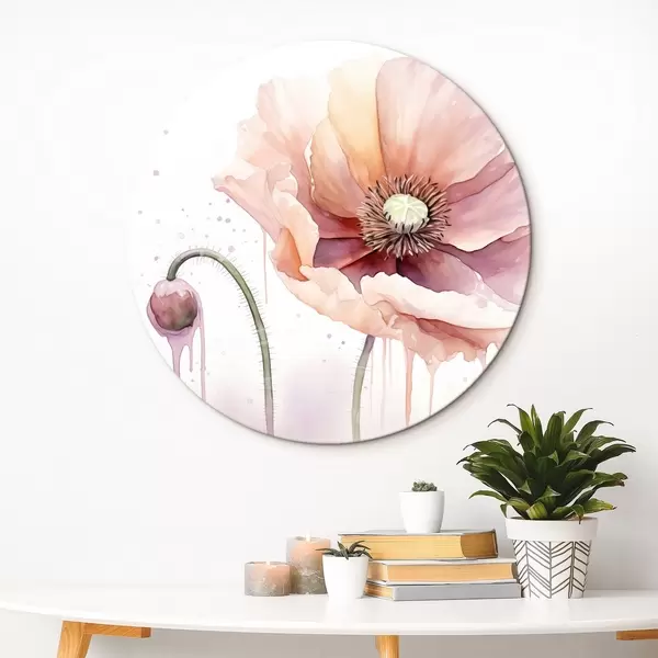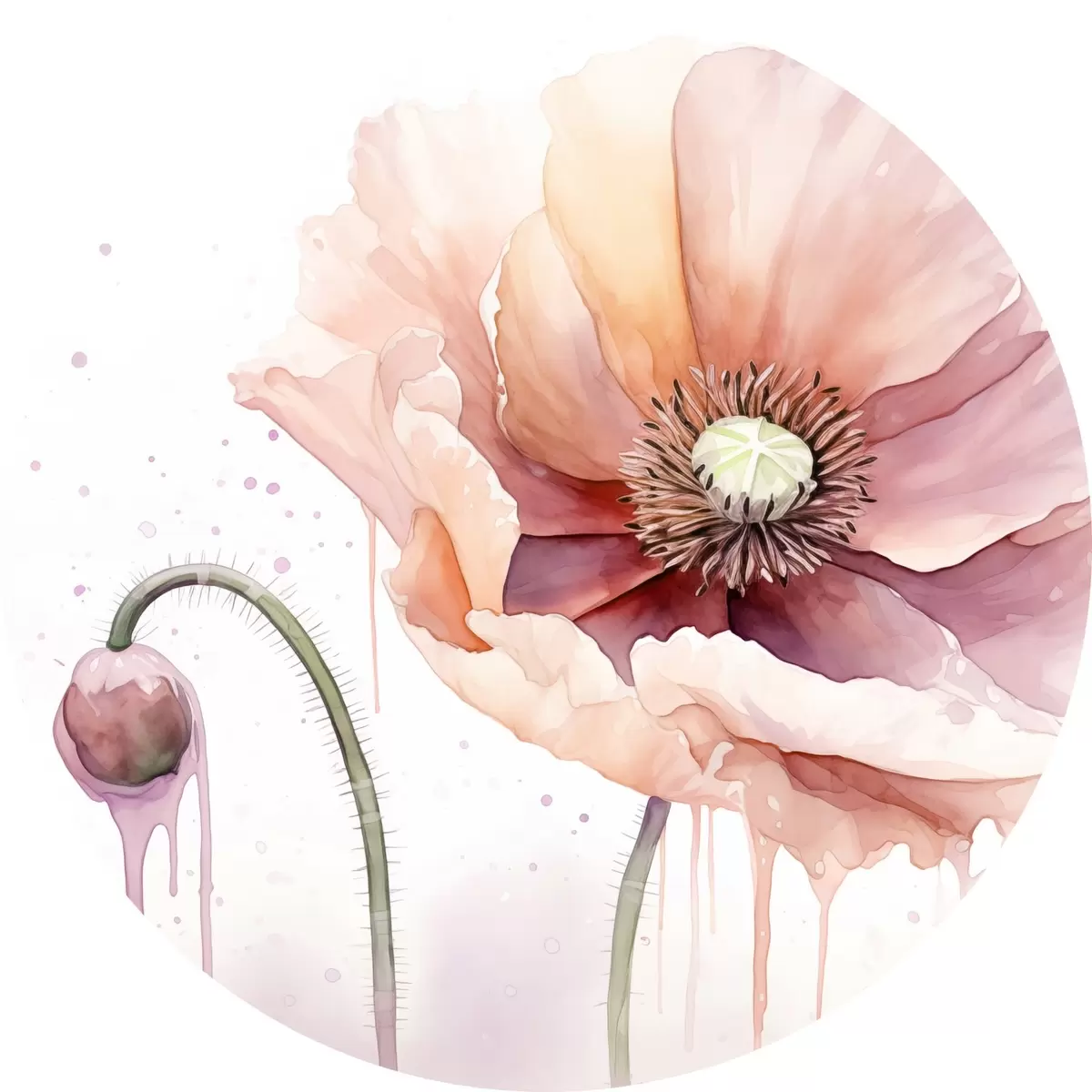 Obrázek Růžový květ máku s poupětem na bílém pozadí, imitace akvarelové malby s kapkami, jemné barvy Nr r43402