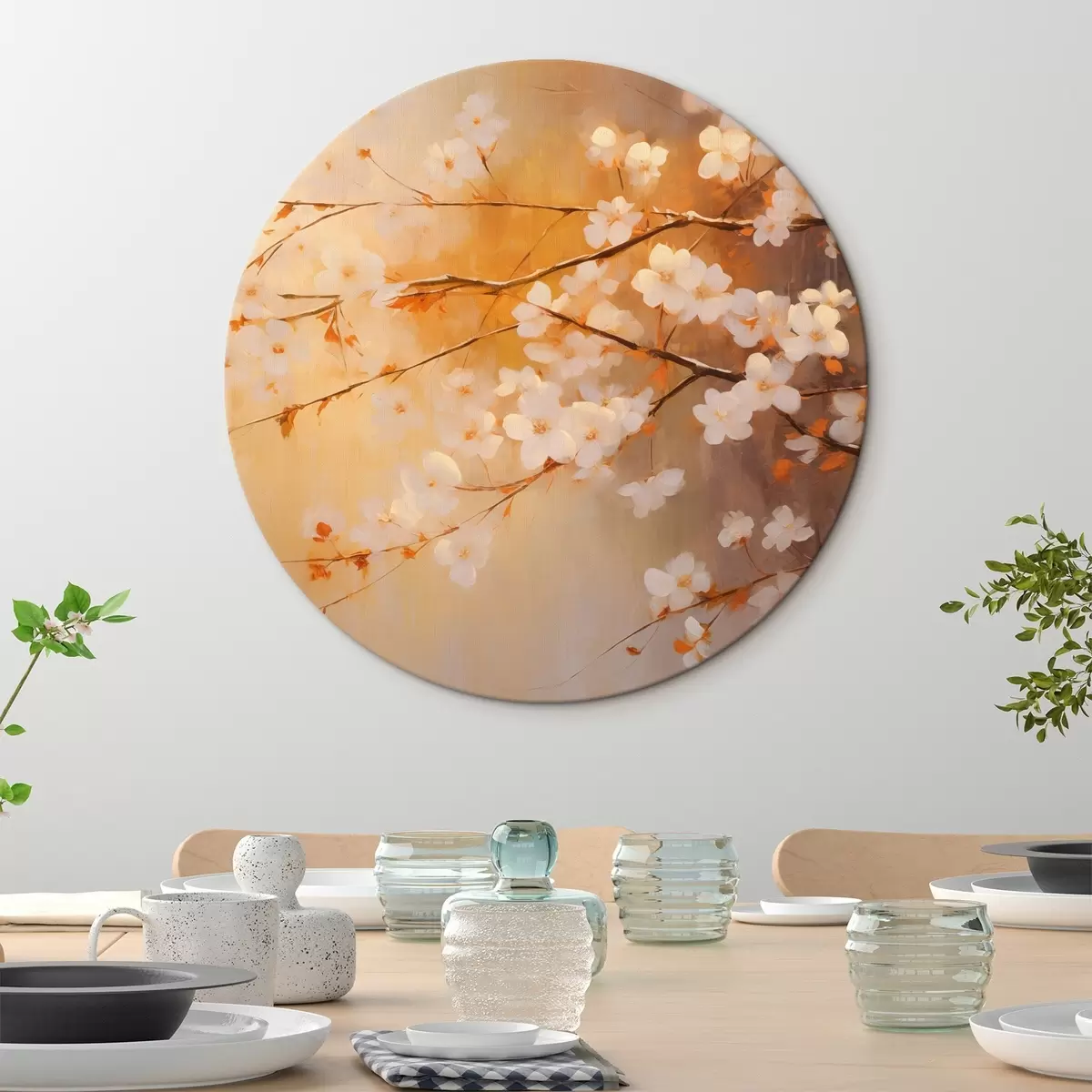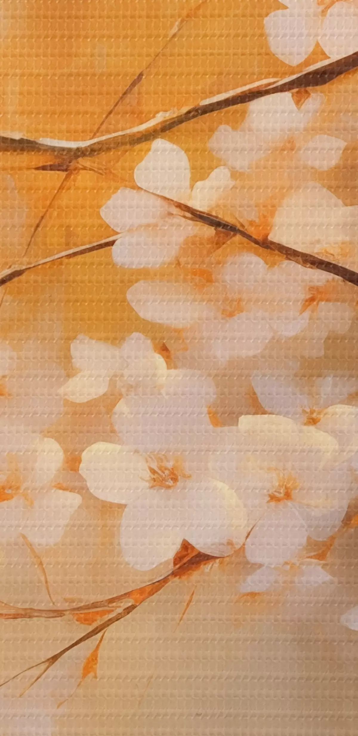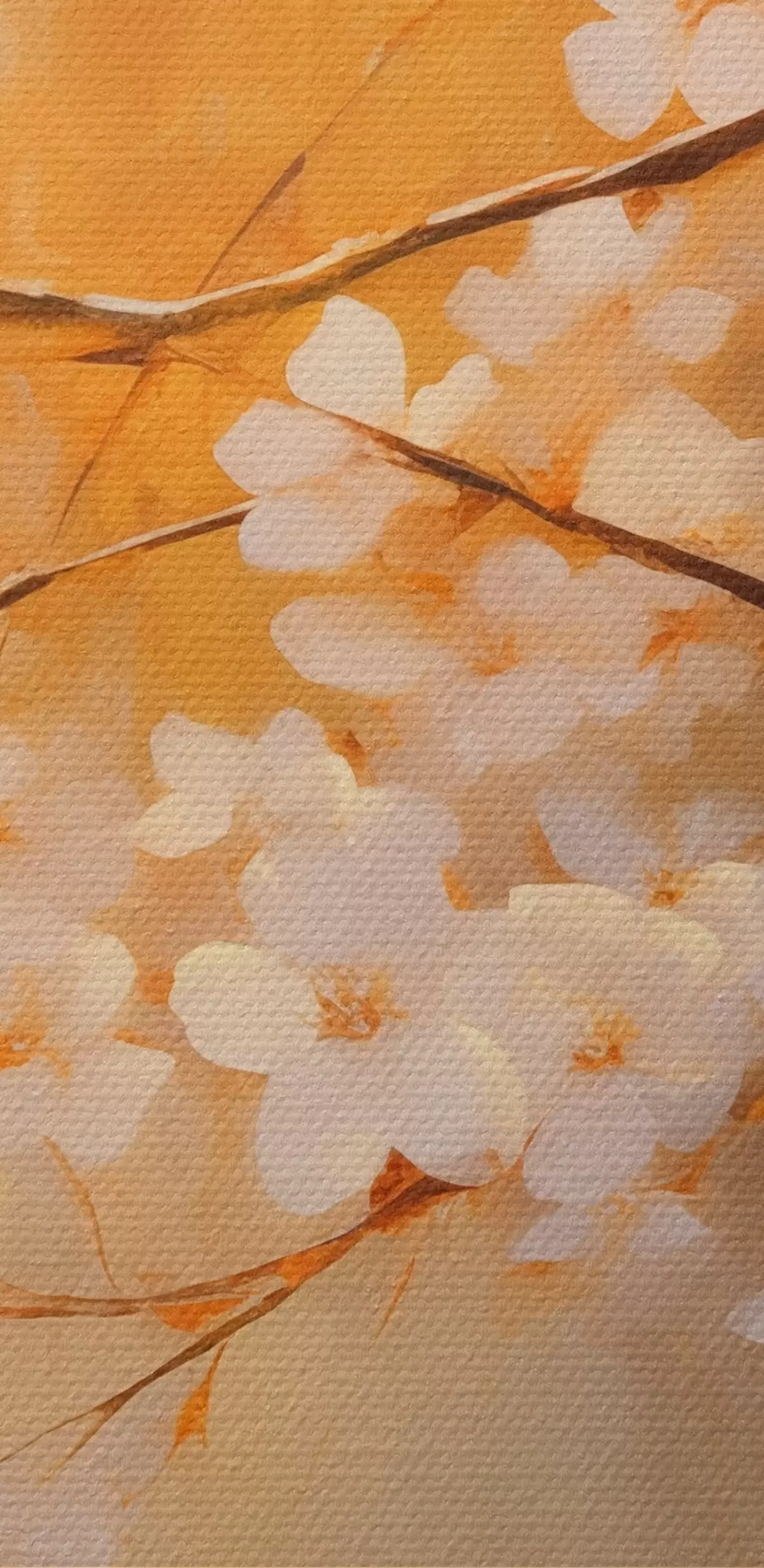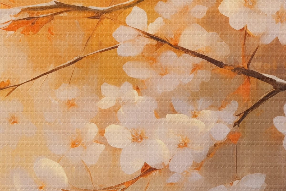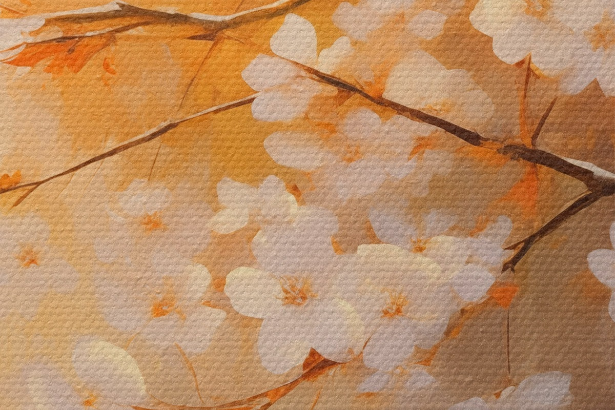 Obrázek Větve třešňových květů s oranžovými květy, teplá paleta barev, na rozmazaném pozadí žlutých odstínů Nr r43407