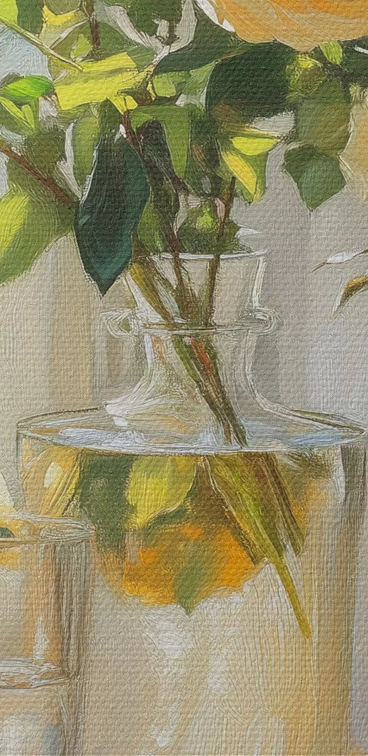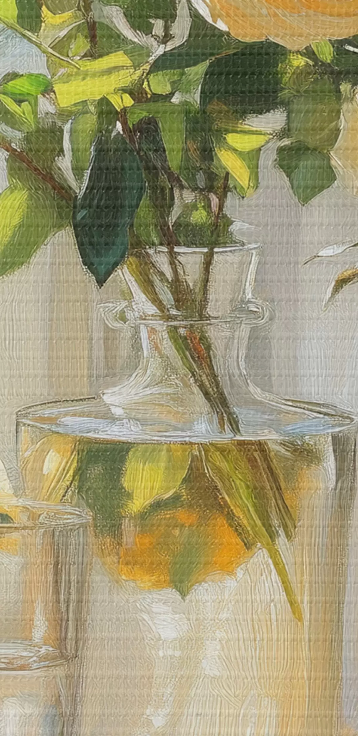 Obrázek Růže ve váze, kresba ve stylu oleje, jemné sluneční světlo, citrony, jaro Nr r43887