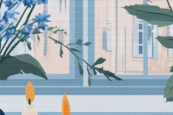 Obrázek Útulný dům s květinami a výhledem z okna, architektura, modré barvy Nr r44010