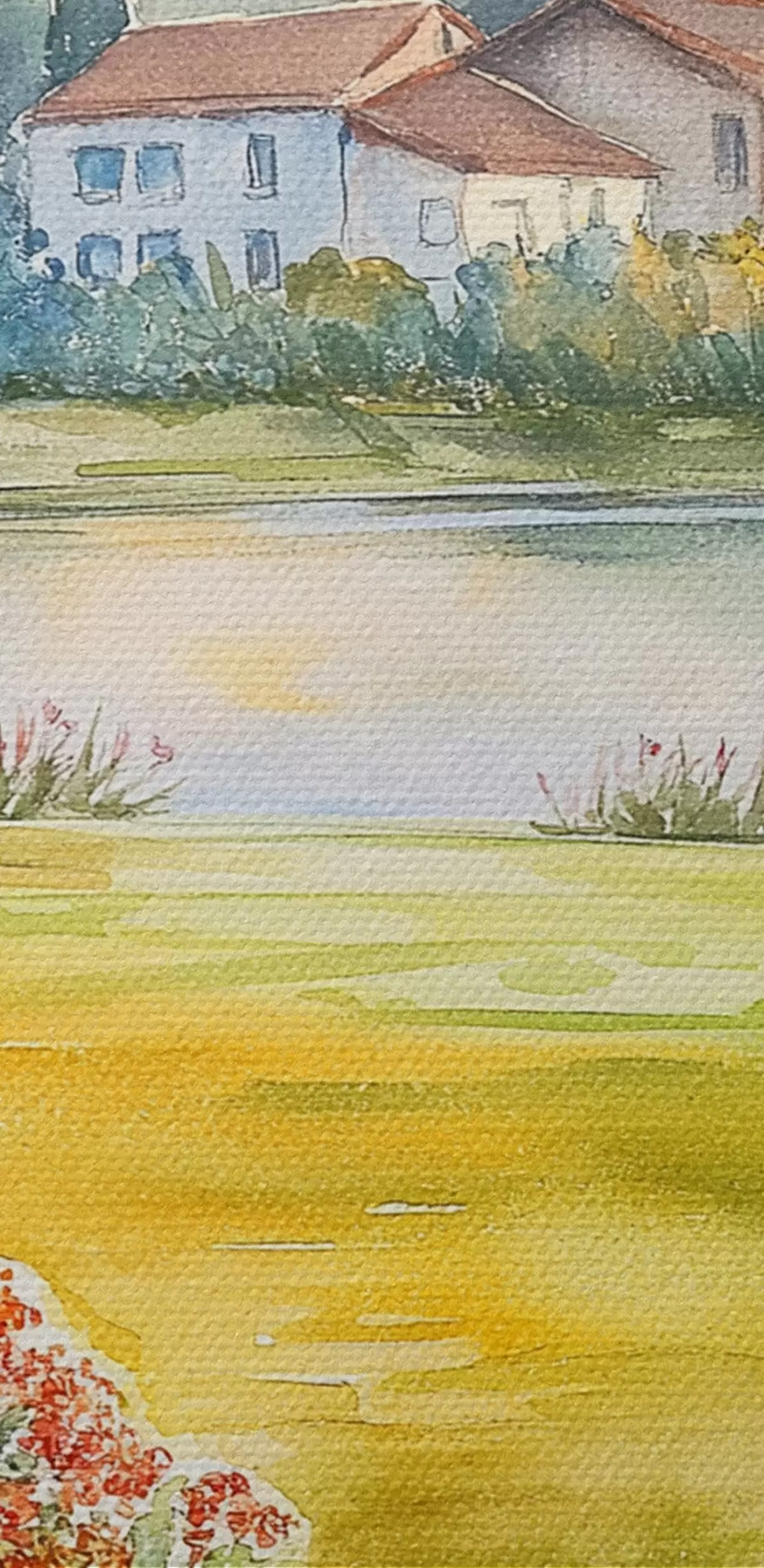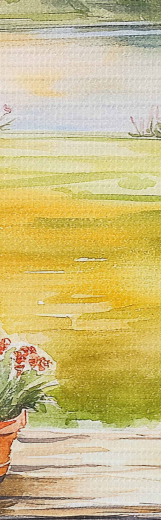 Obrázek Vesnice při západu slunce, rustikální, letní květiny, jezero, akvarel Nr r44016
