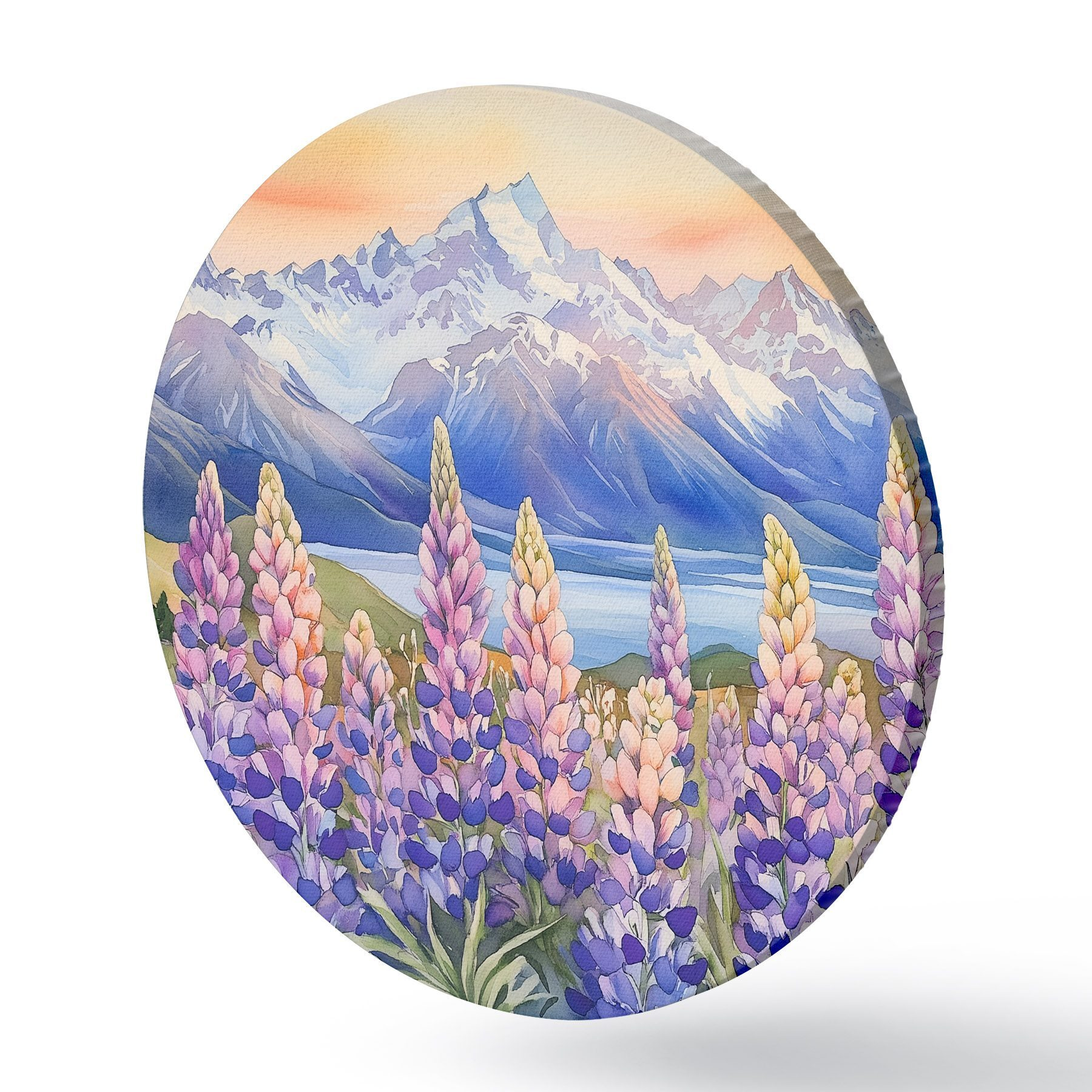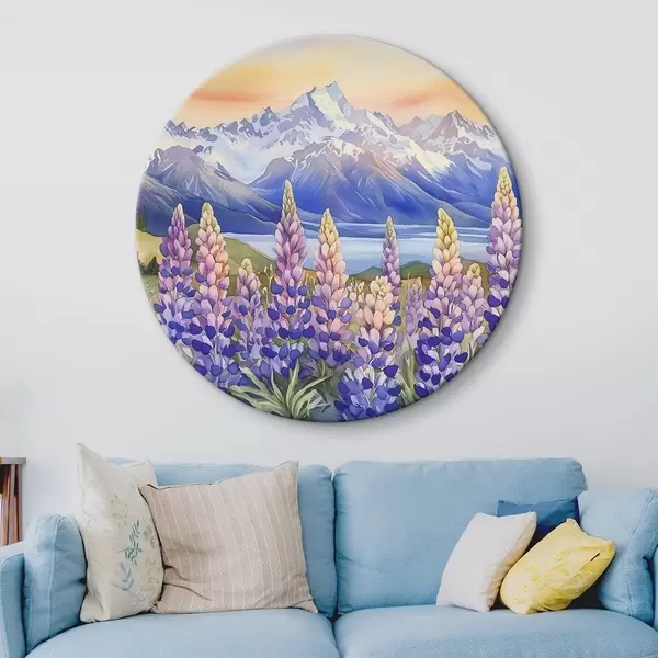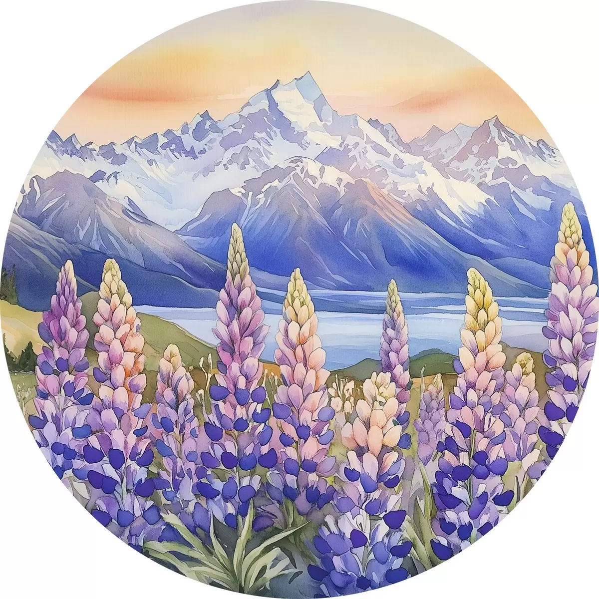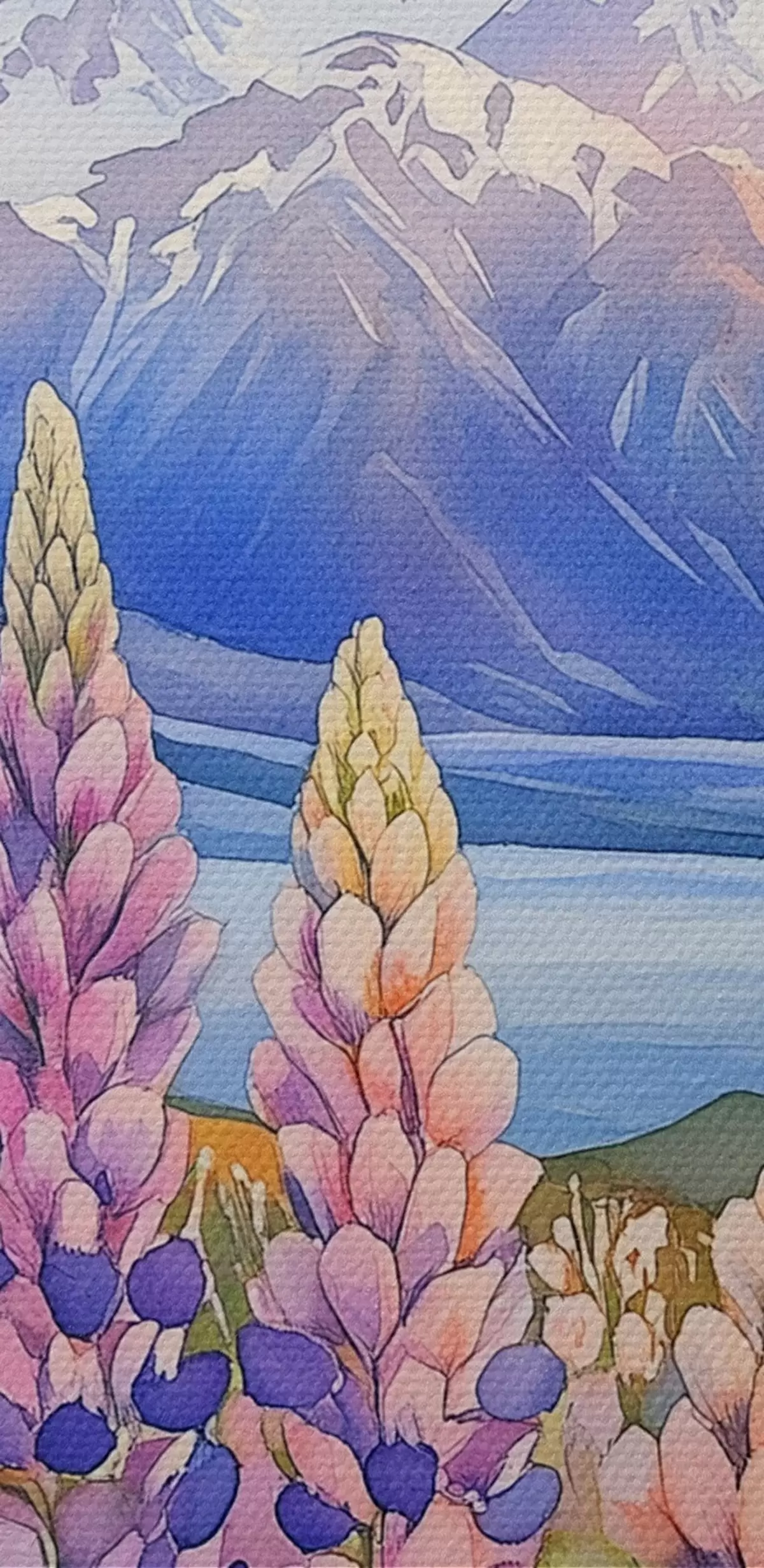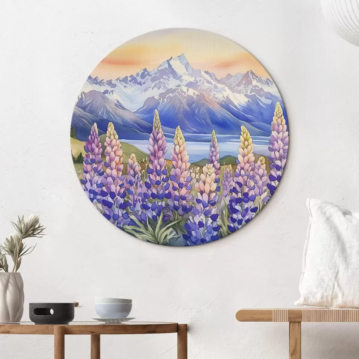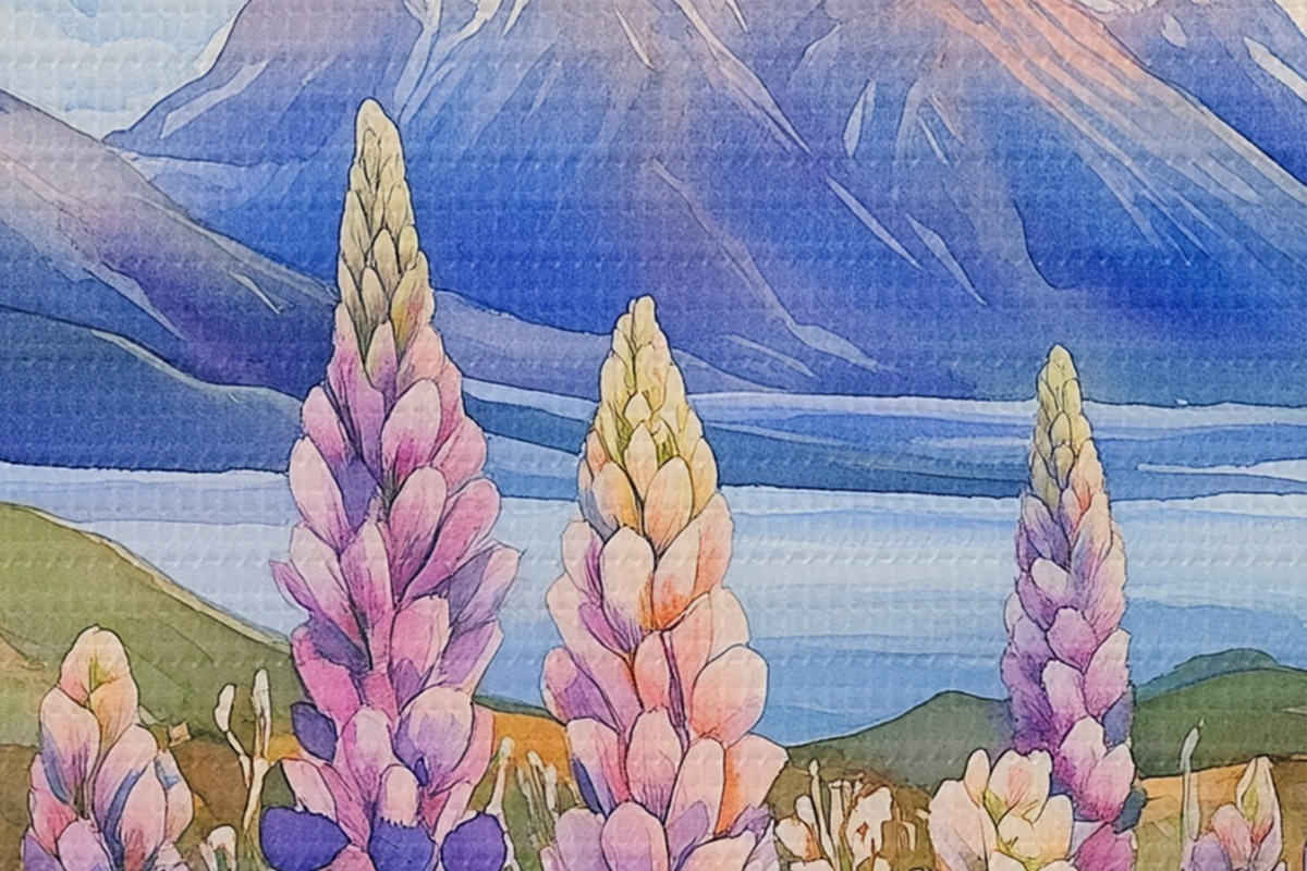 Obrázek Lupinové květy, louka, hory, akvarel, obloha při západu slunce Nr r44146