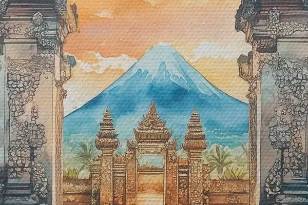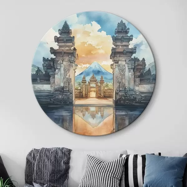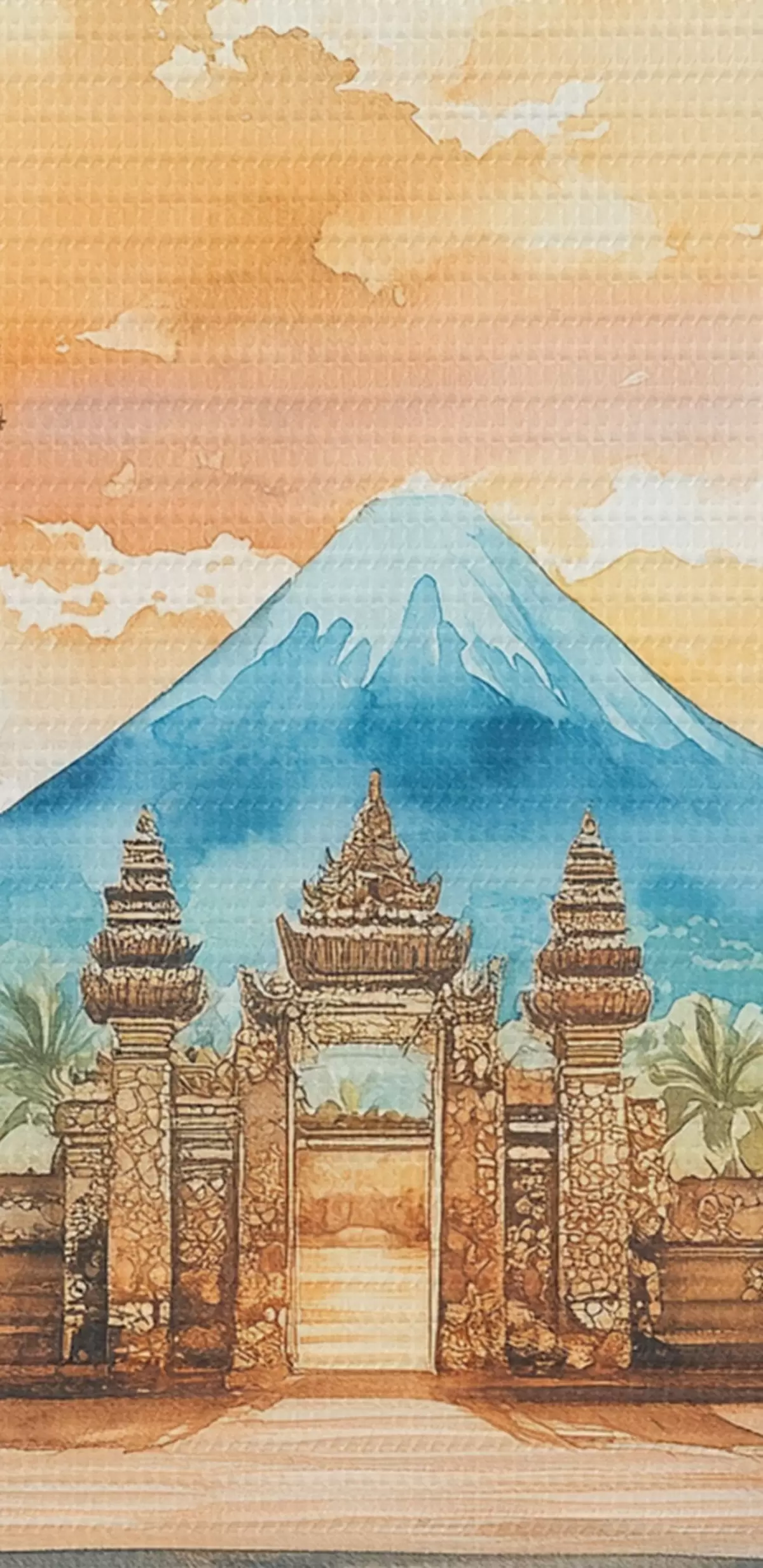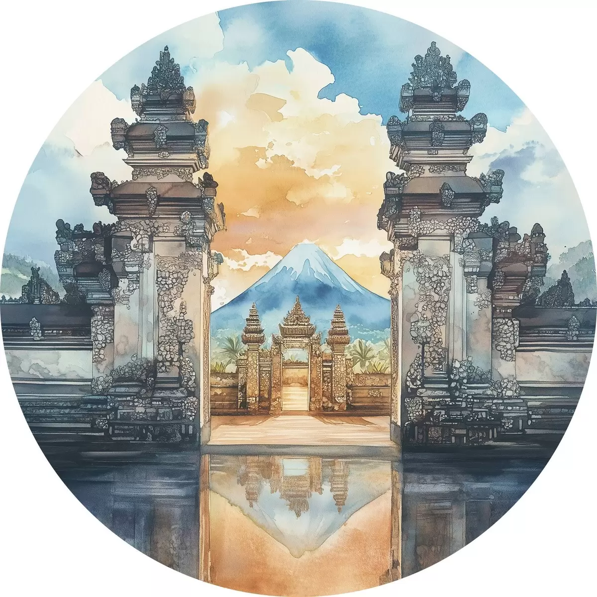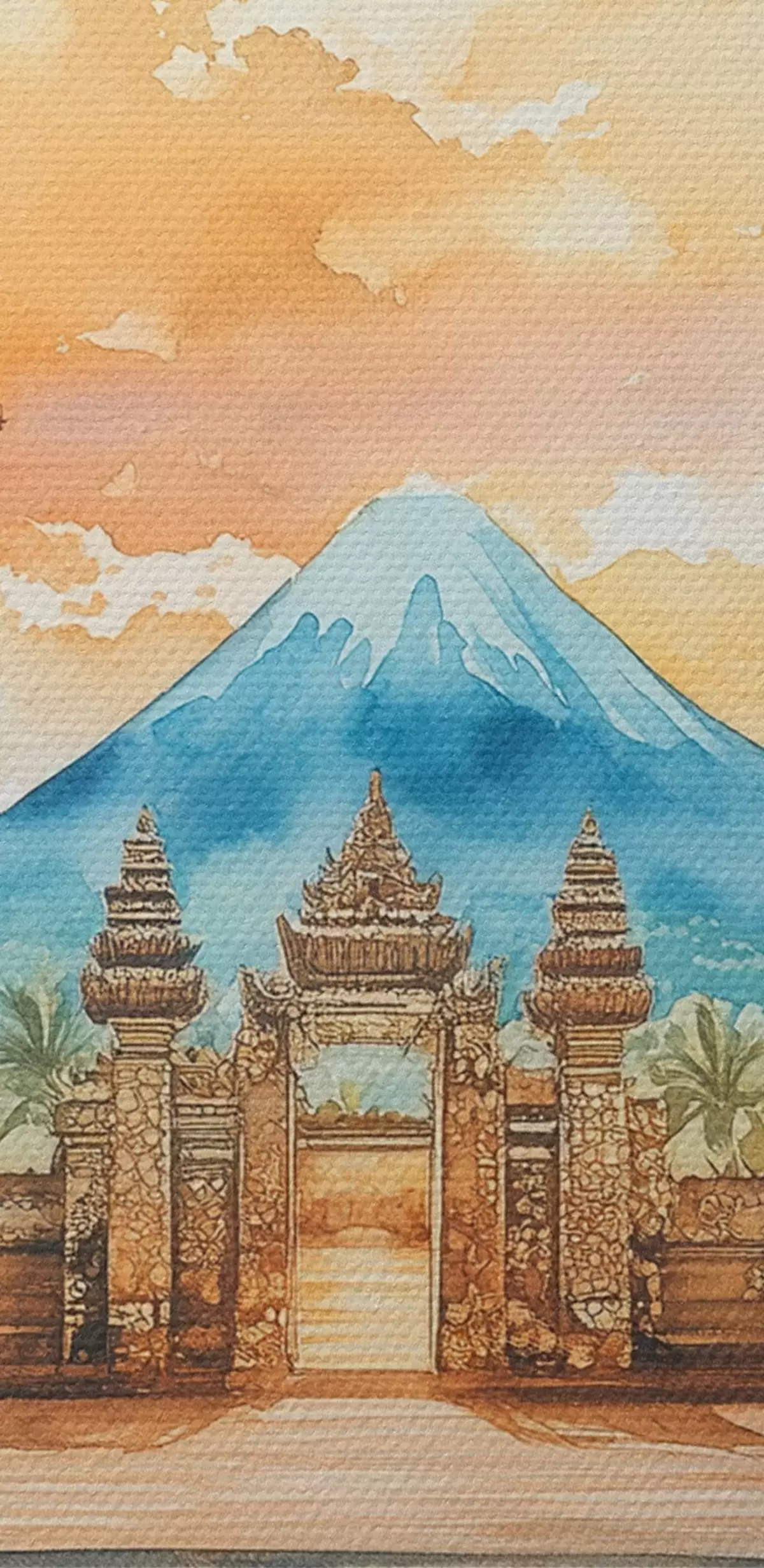 Obrázek Estetika Bali, chrám, obloha při západu slunce, tropická příroda, styl akvarelu Nr r44149