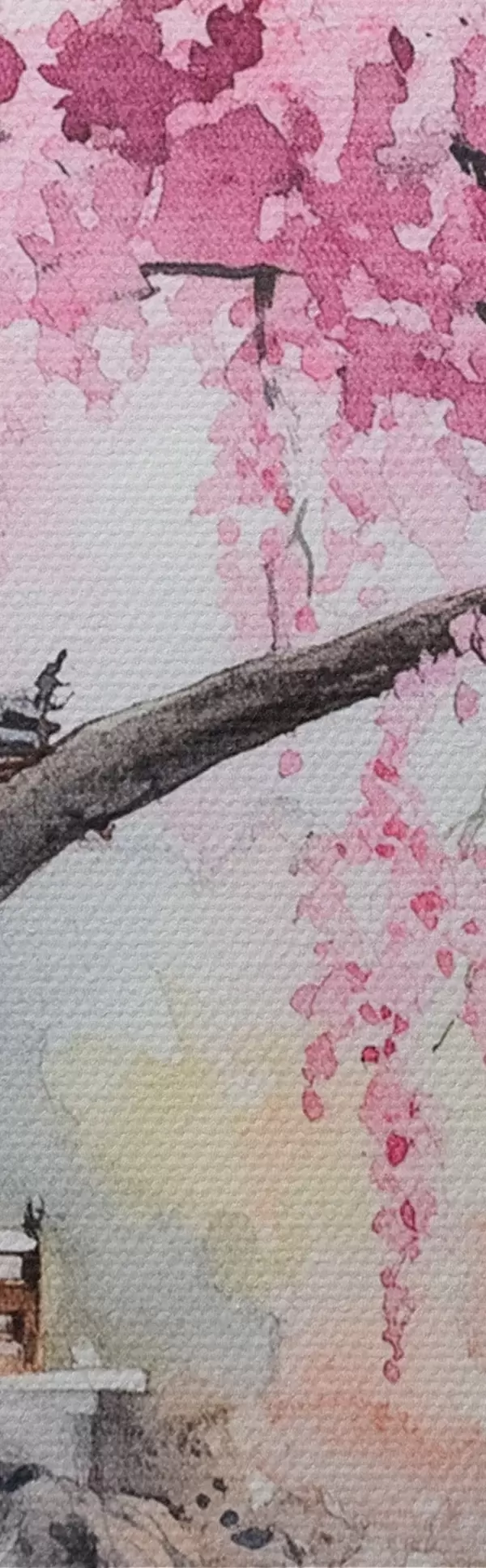 Obrázek Růžový třešňový strom u domu na jezeře, Japonsko, orientální, akvarelový styl Nr r44312