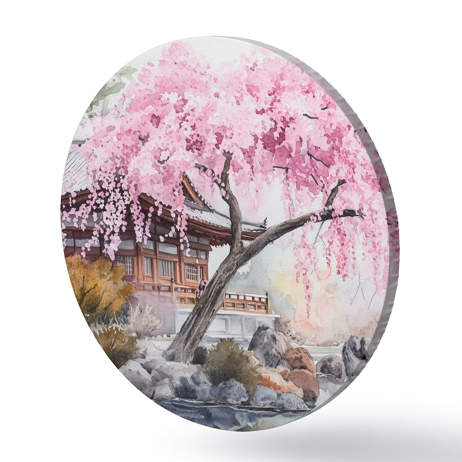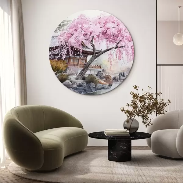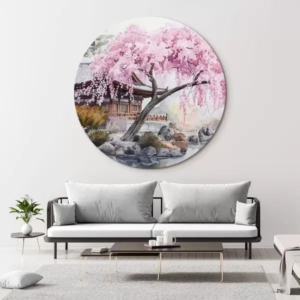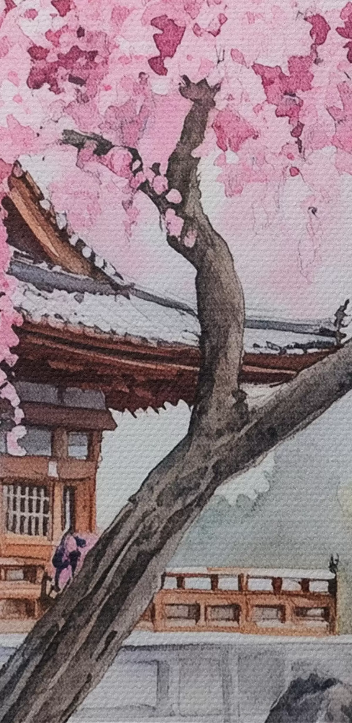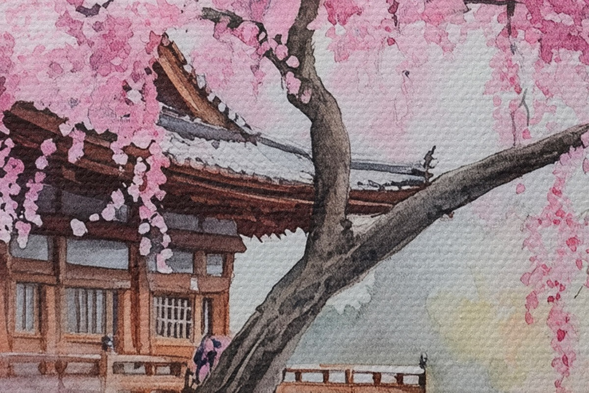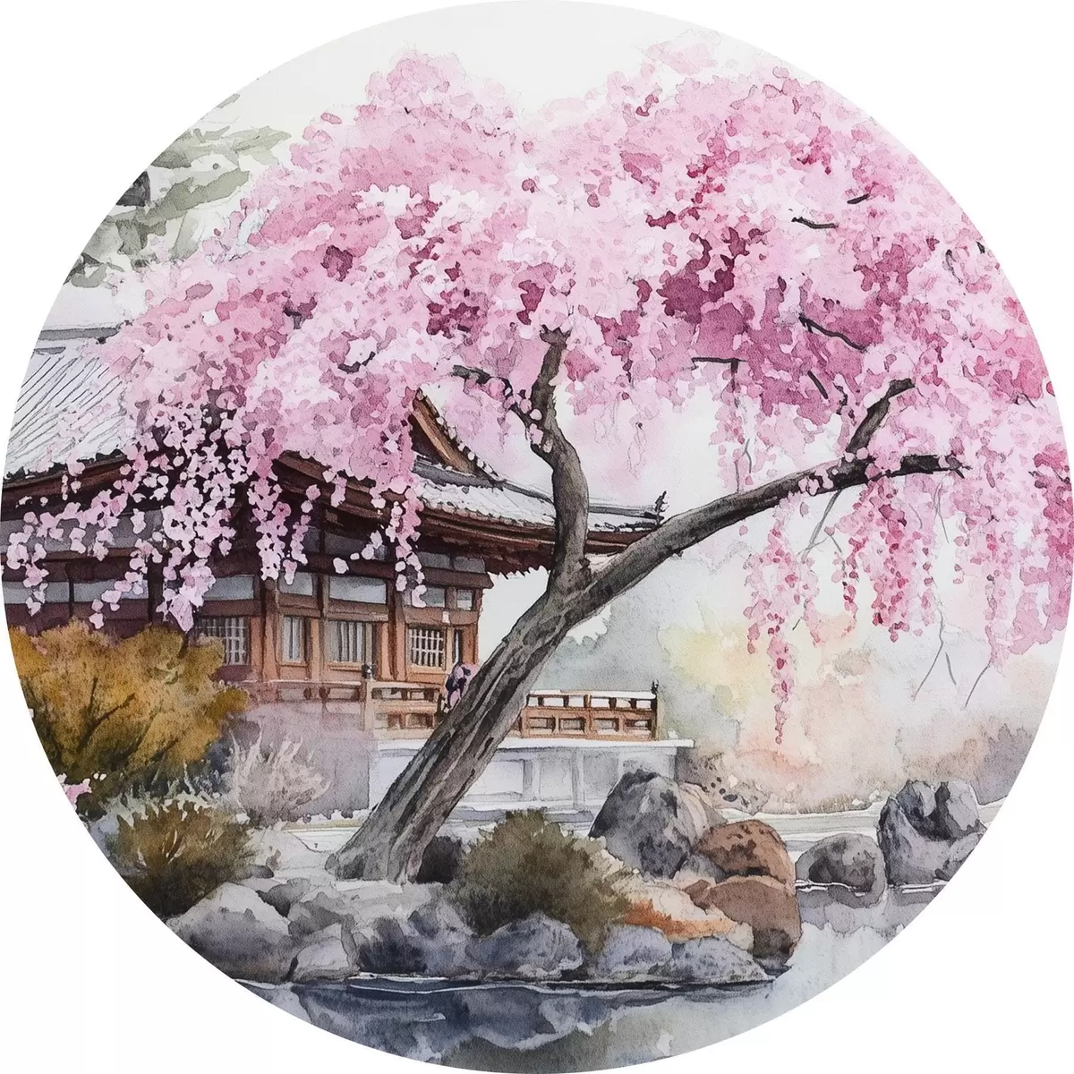 Obrázek Růžový třešňový strom u domu na jezeře, Japonsko, orientální, akvarelový styl Nr r44312