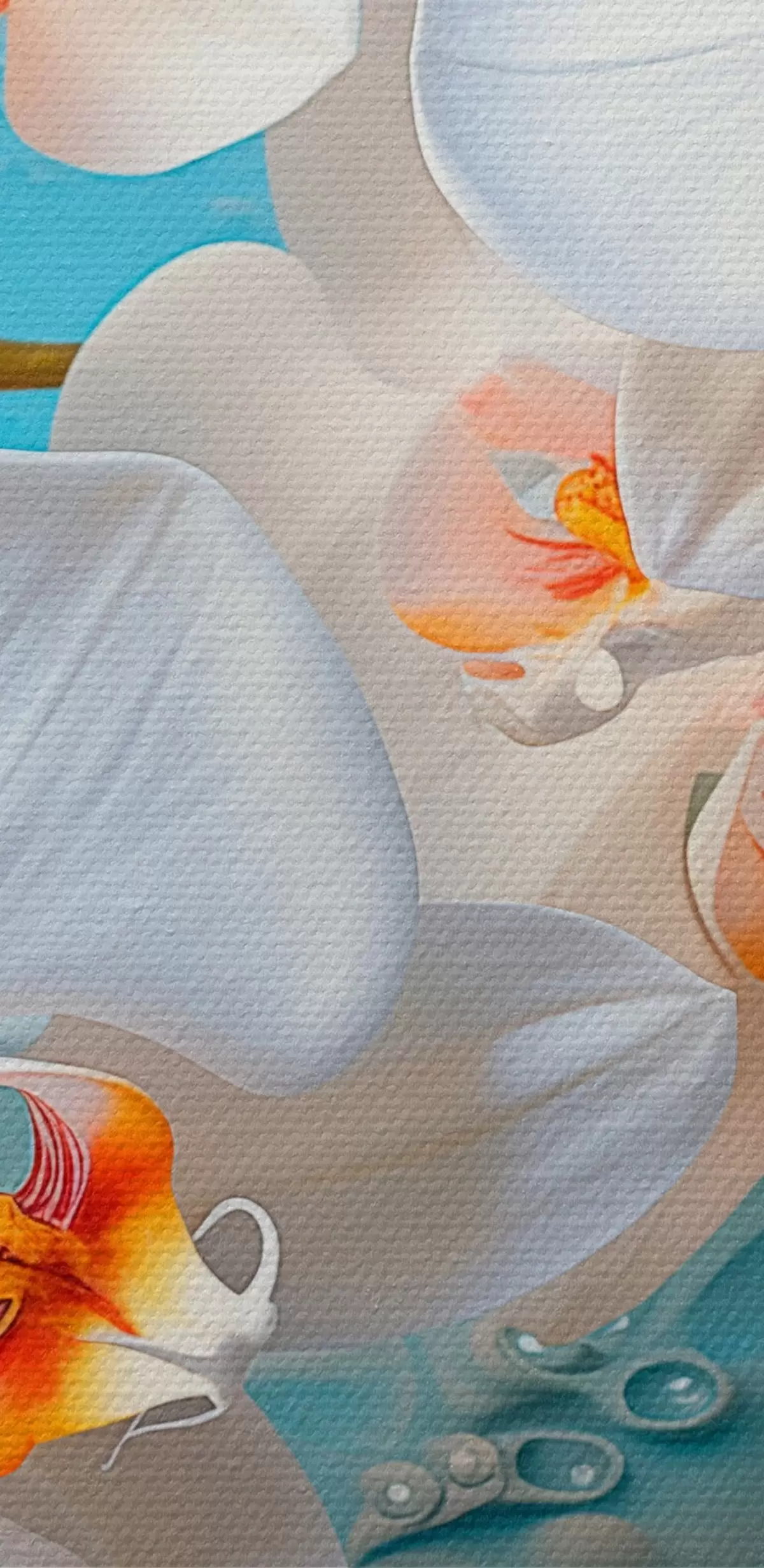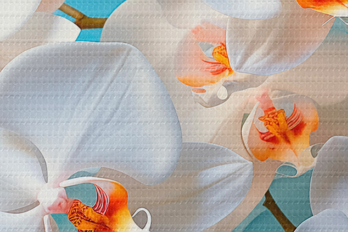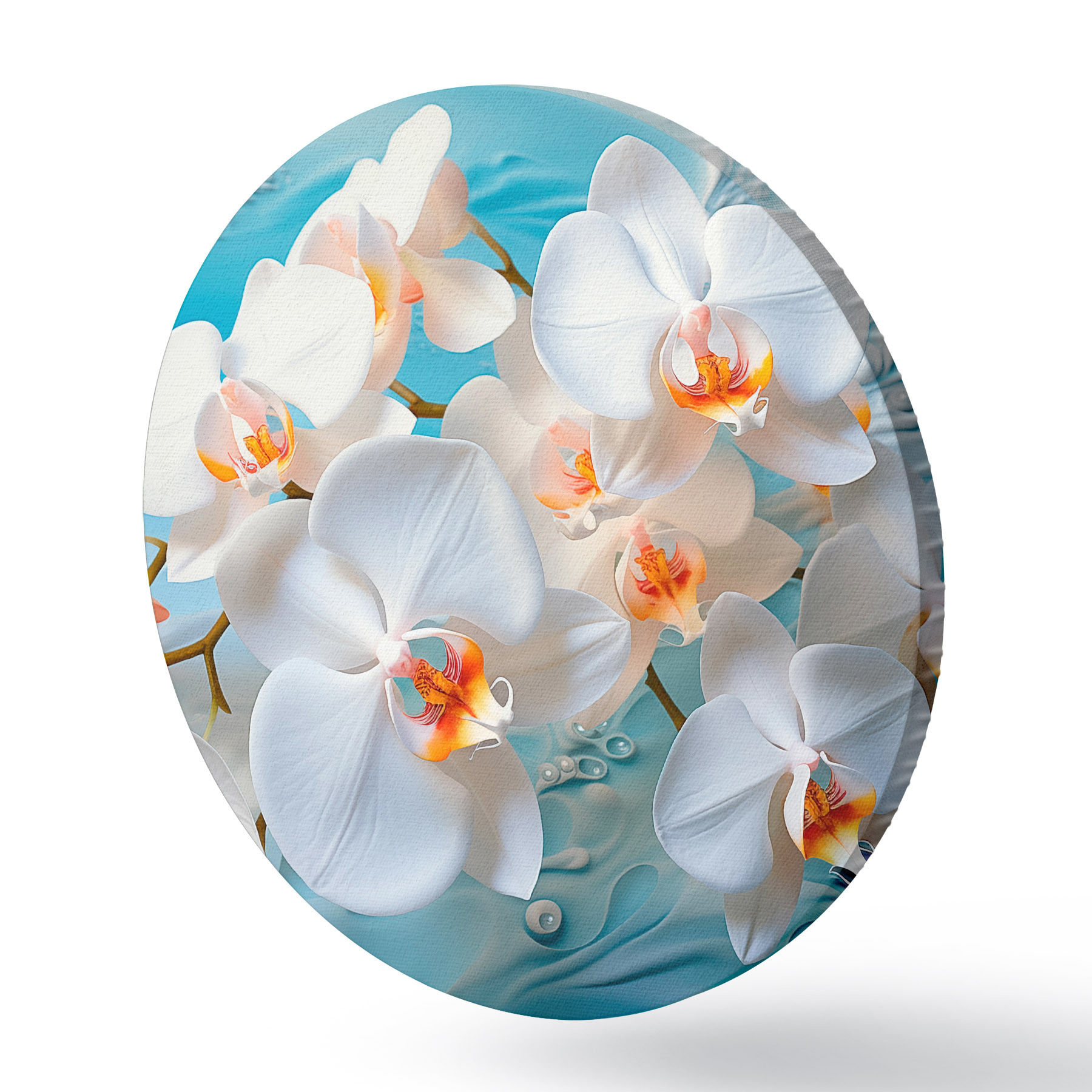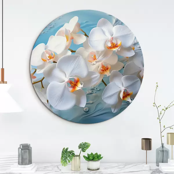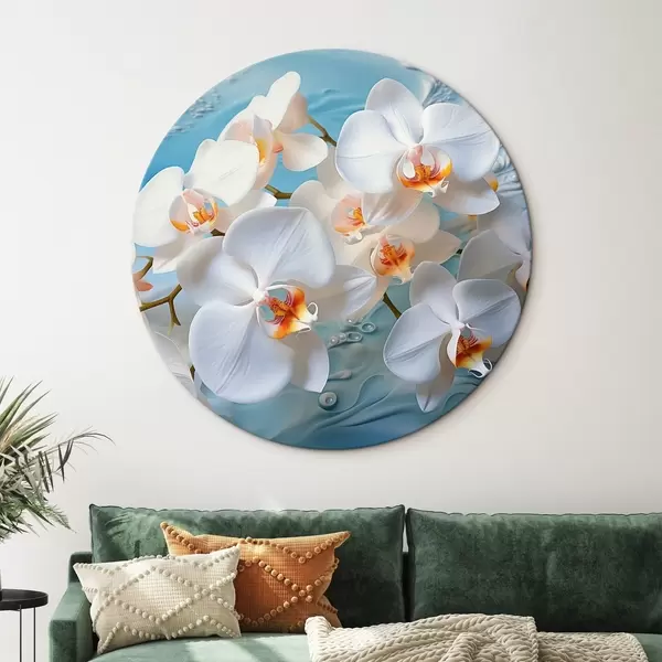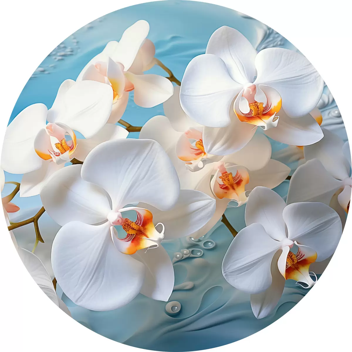 Obrázek Bílé orchideje naaranžované na světle modré ploše s kapkami vody, měkké osvětlení Nr r44401