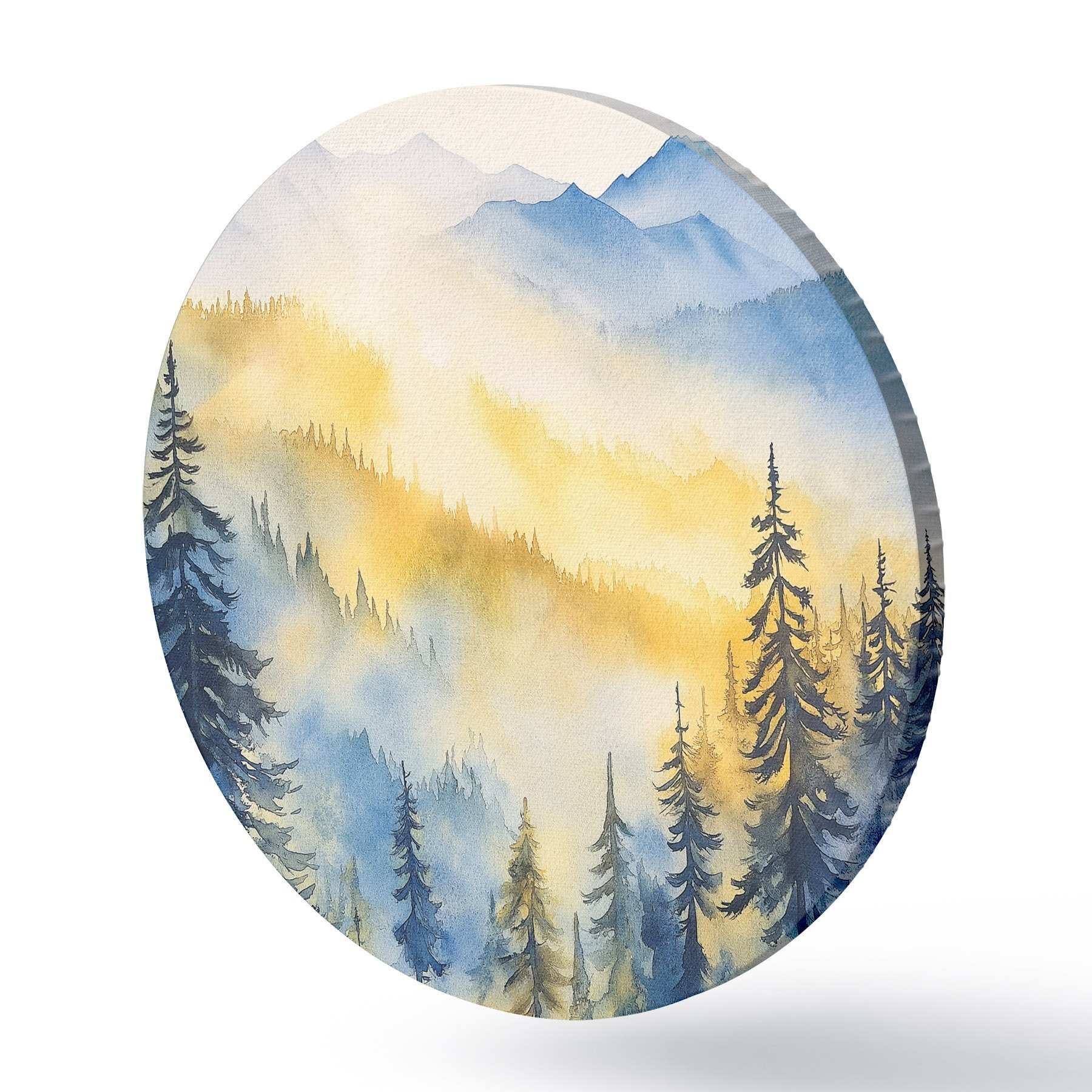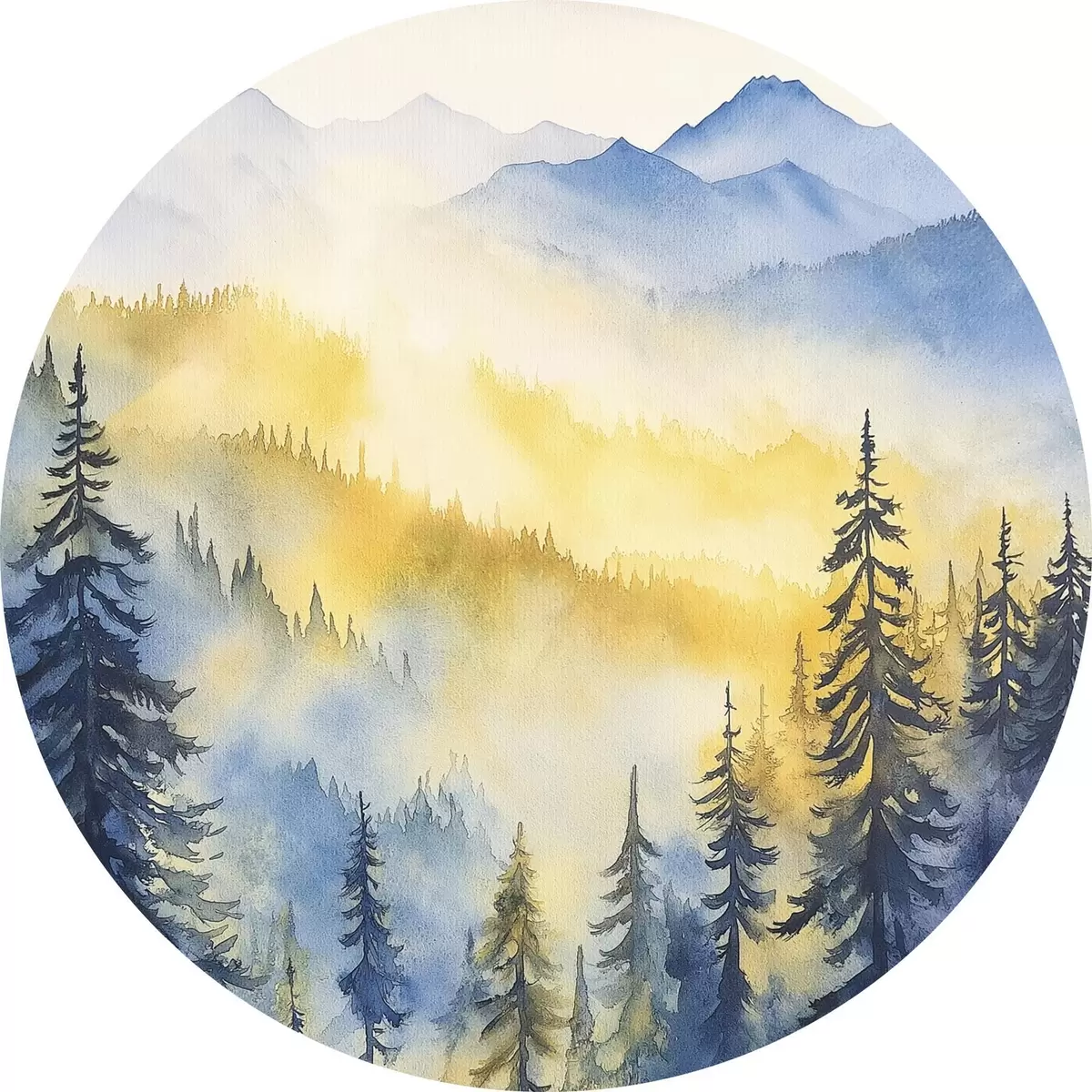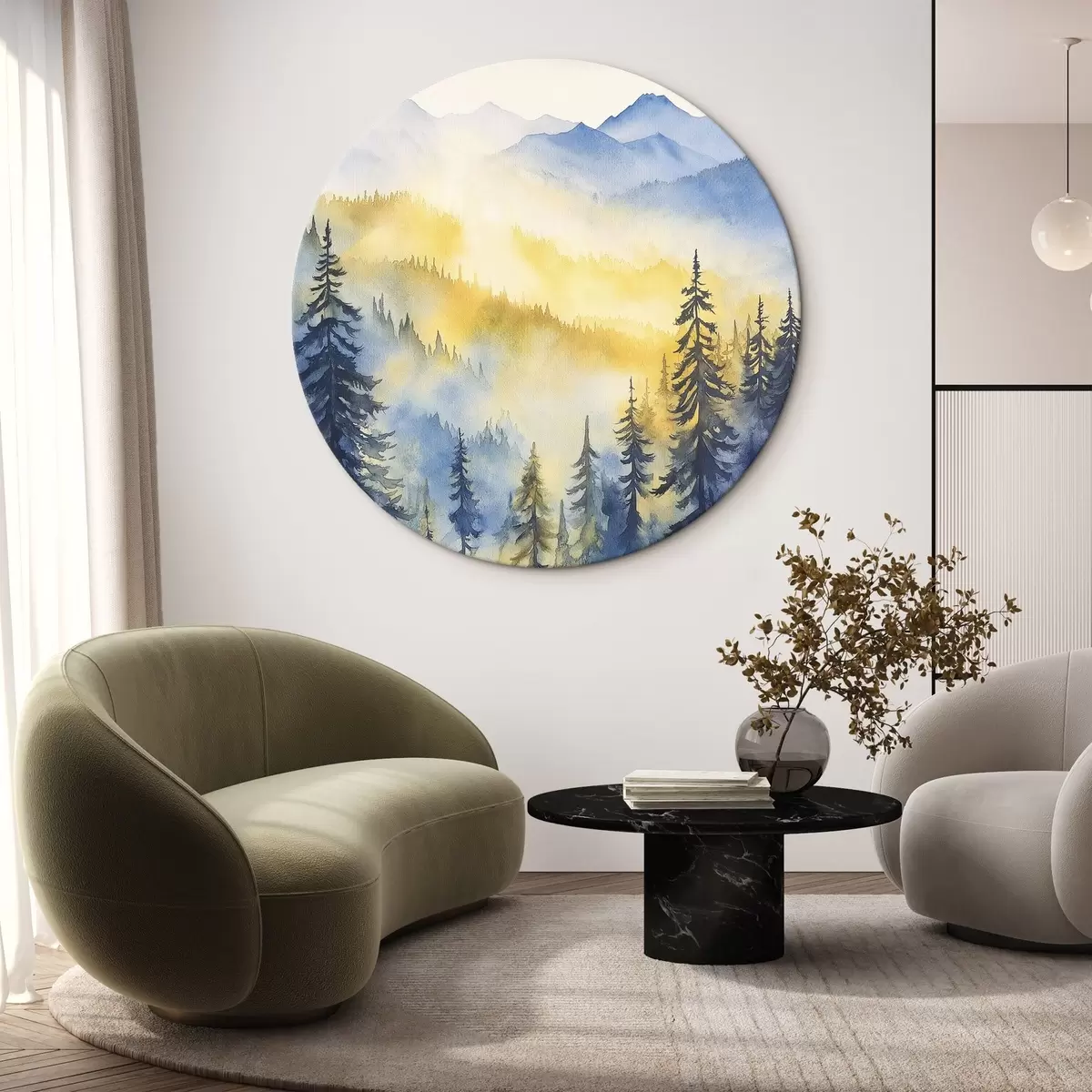 Obrázek Mlhavé hory při východu slunce, borové lesy, modrá a žlutá barva Nr r44602