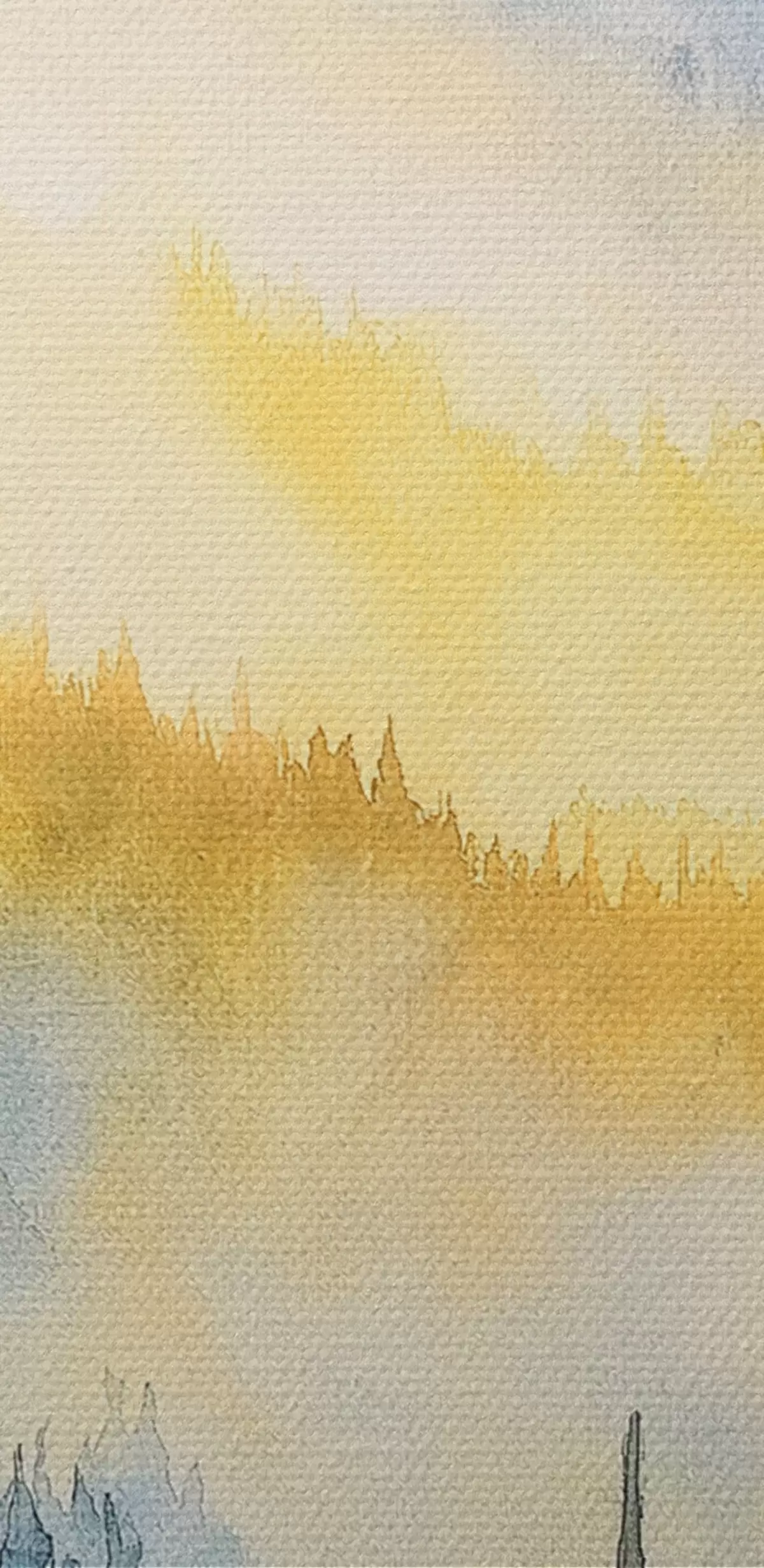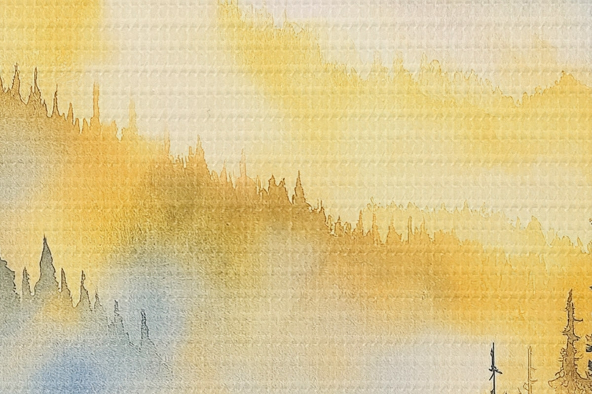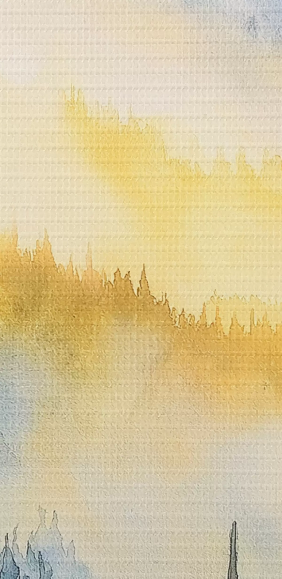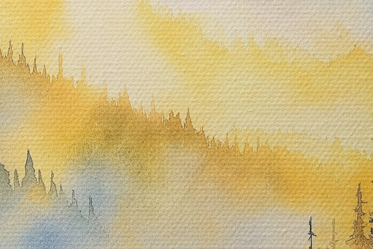 Obrázek Mlhavé hory při východu slunce, borové lesy, modrá a žlutá barva Nr r44602