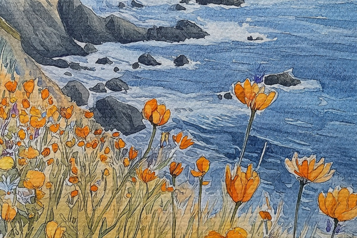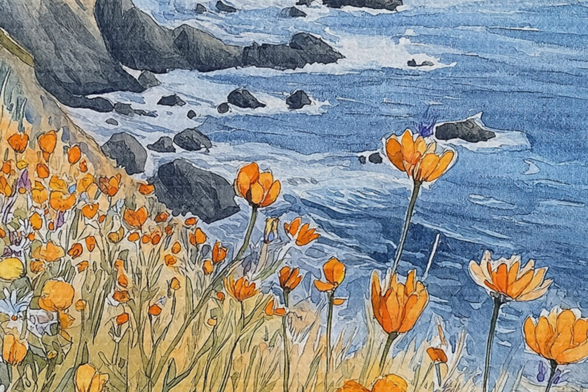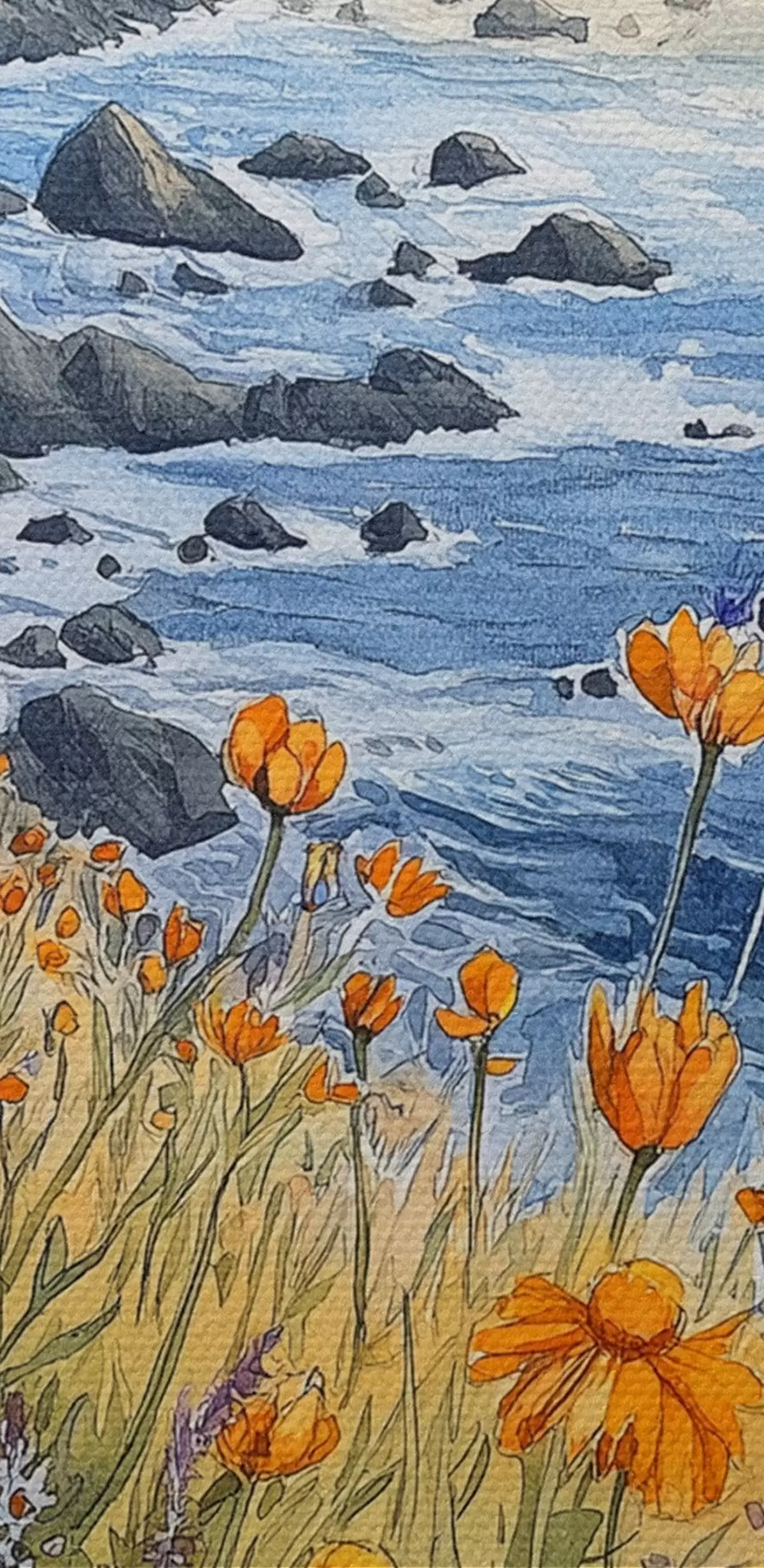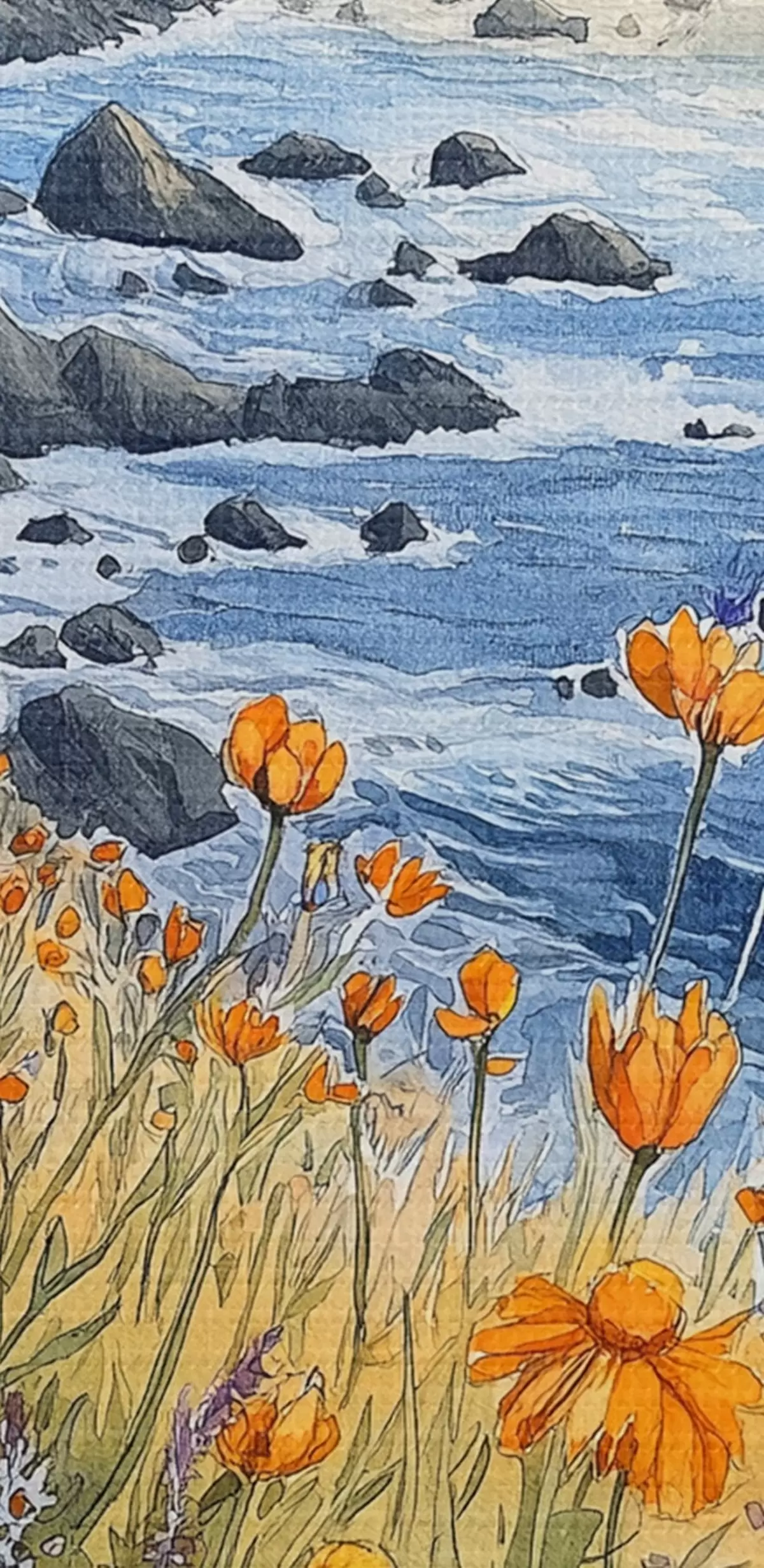 Obrázek Útes s oranžovými květy, pobřeží oceánu, Portugalsko, akvarel Nr r44604
