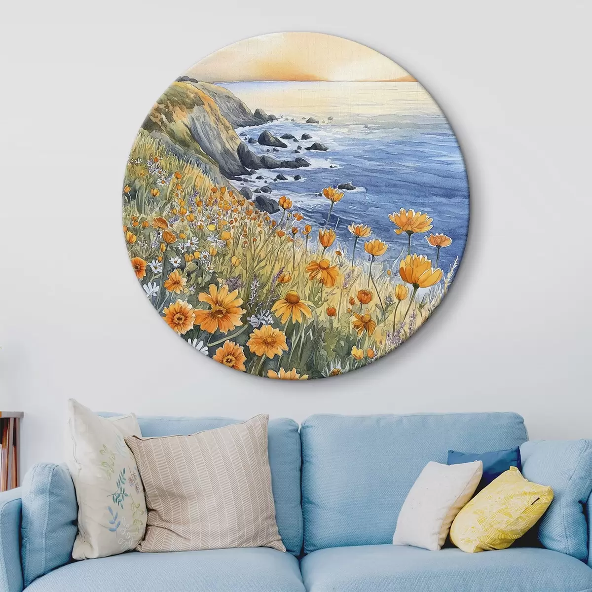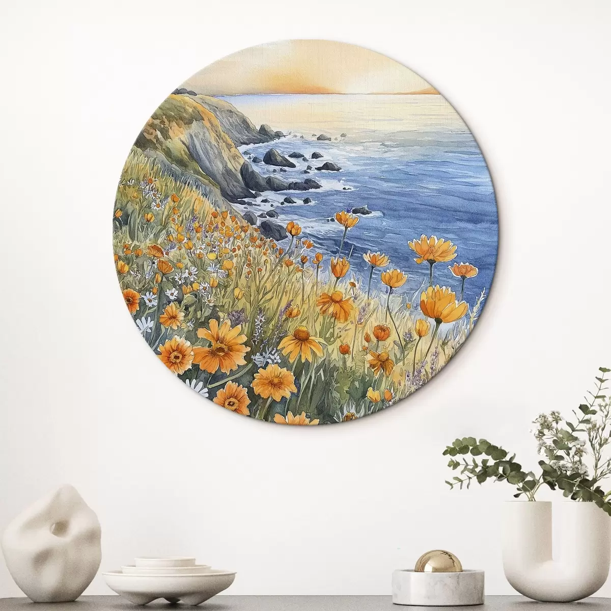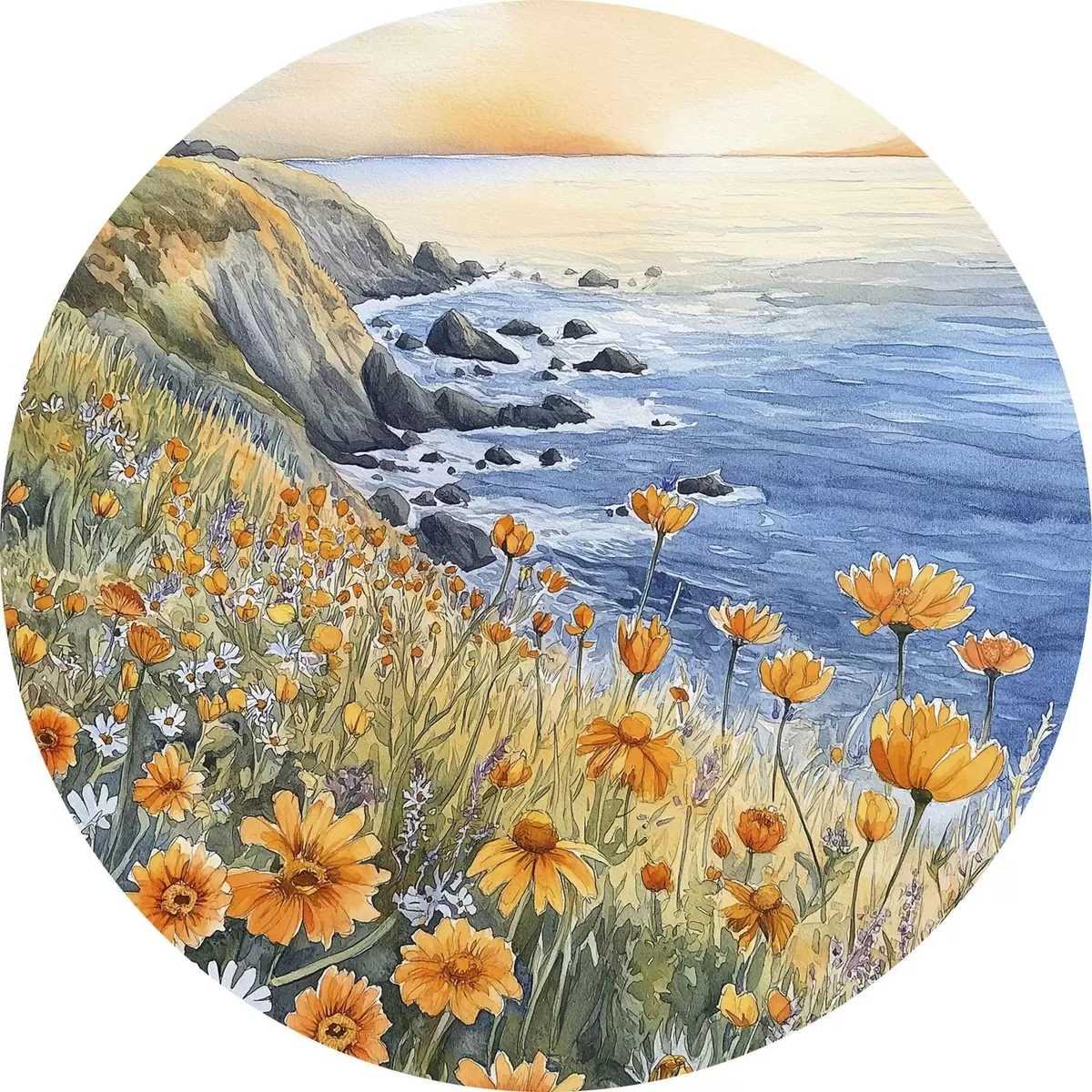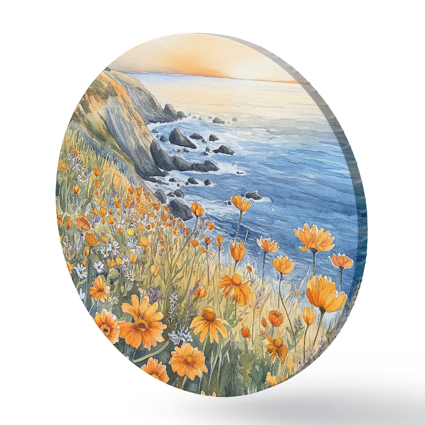 Obrázek Útes s oranžovými květy, pobřeží oceánu, Portugalsko, akvarel Nr r44604