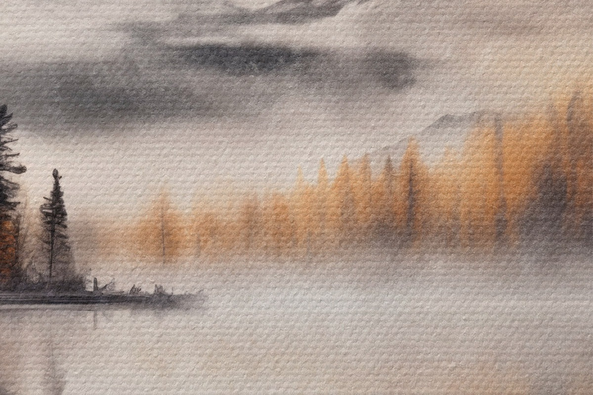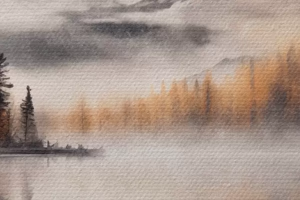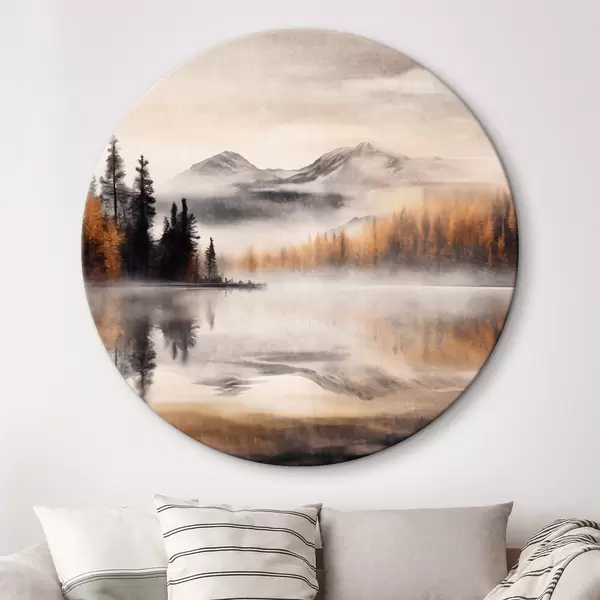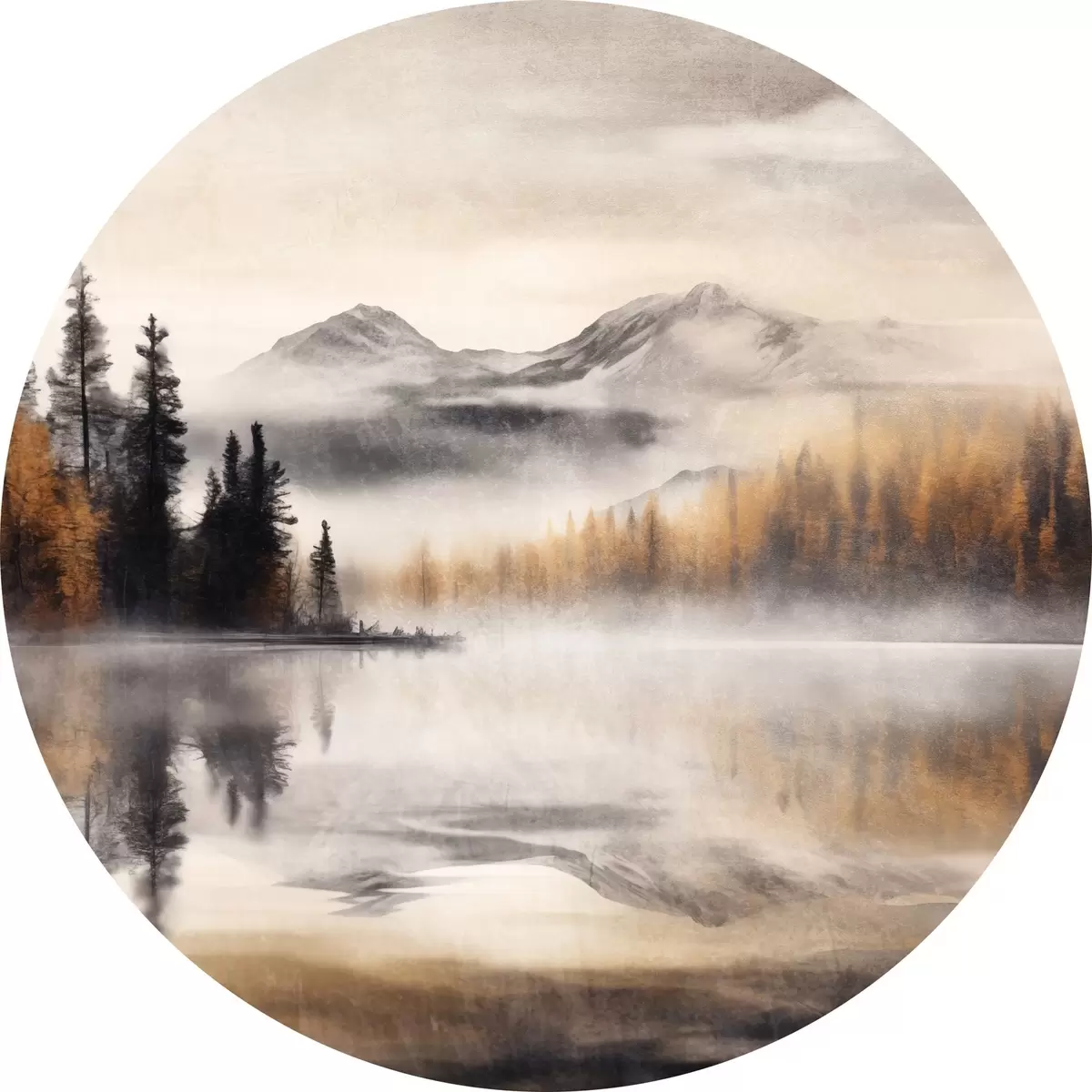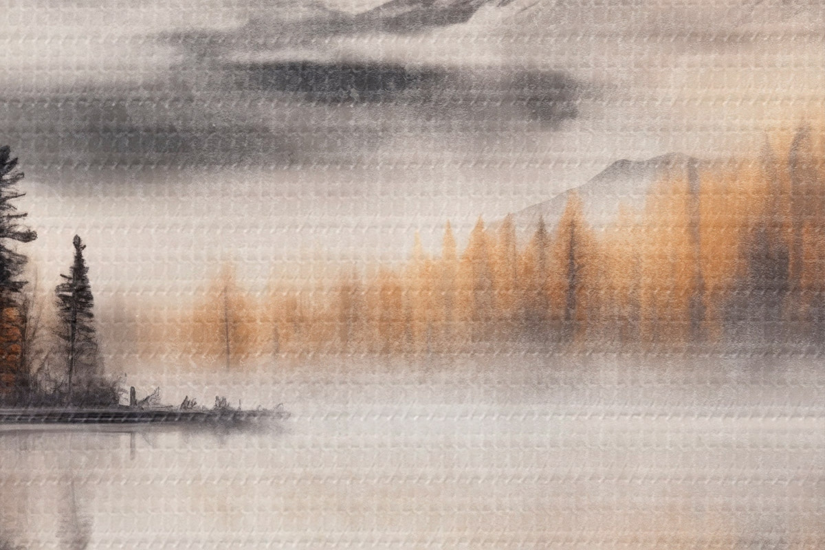 Obrázek Mlhavá jezerní krajina s borovicemi a horami, zatažená šedá obloha Nr r44856