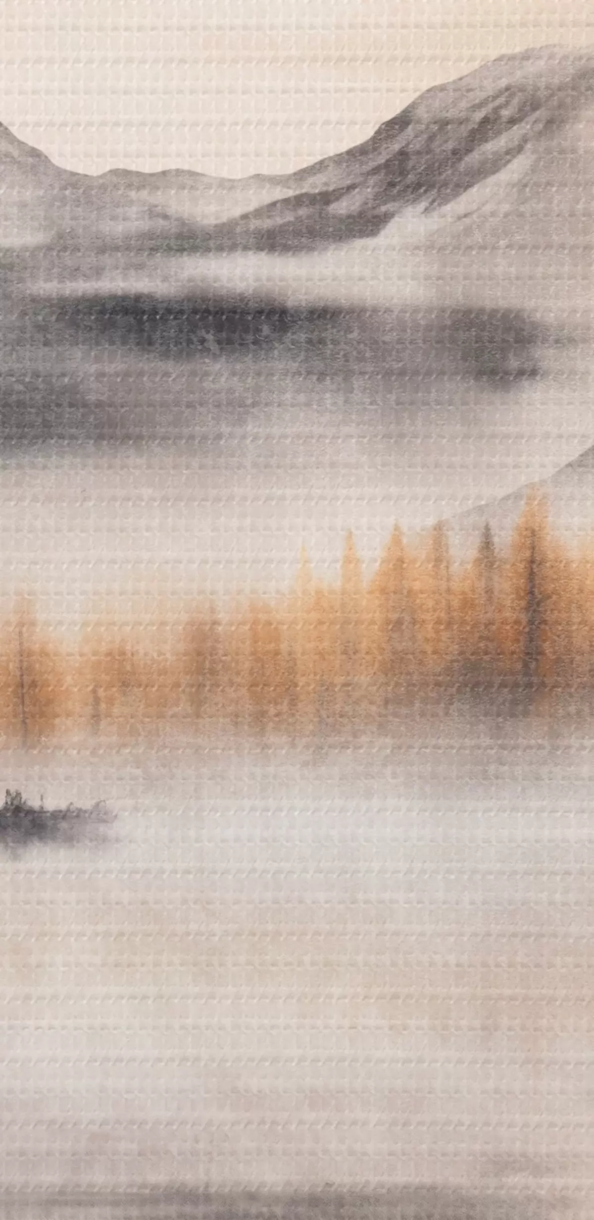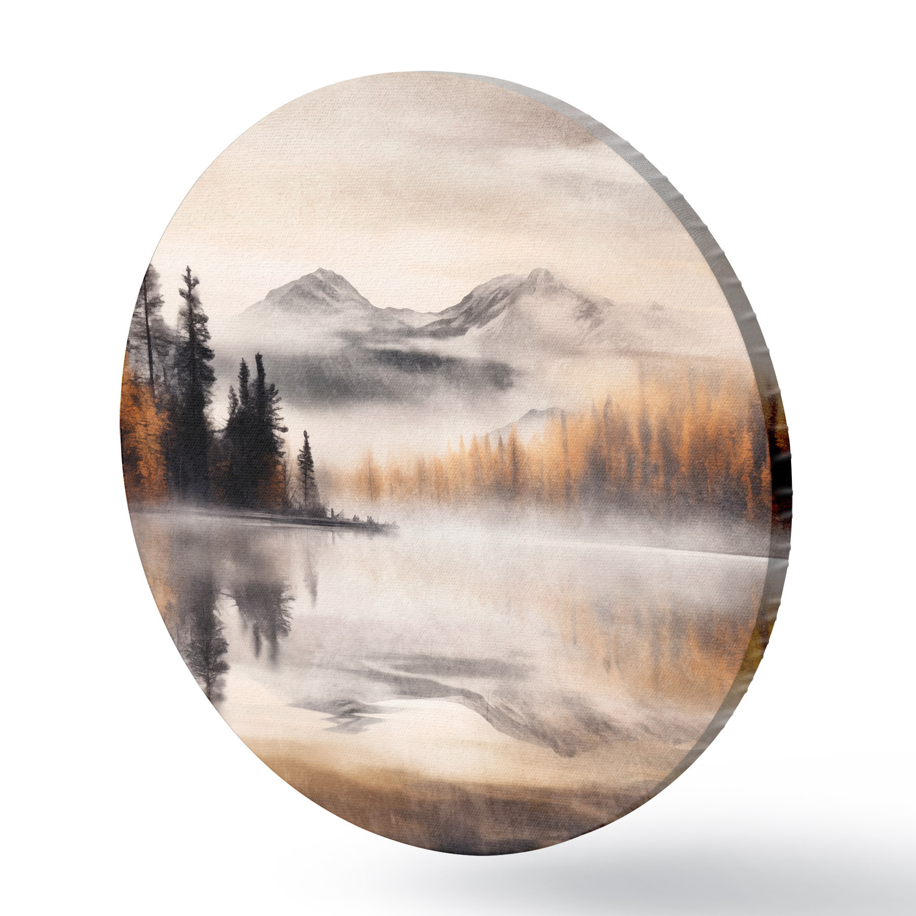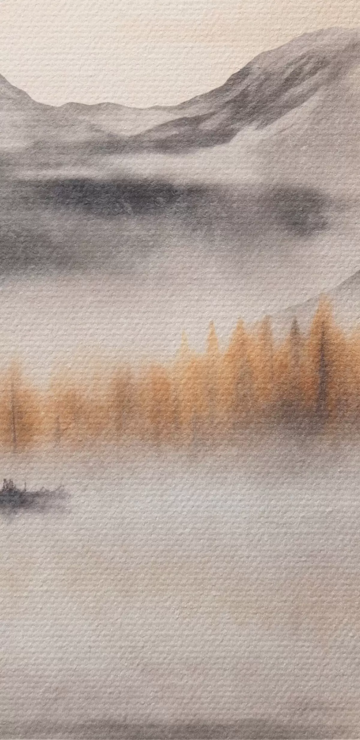 Obrázek Mlhavá jezerní krajina s borovicemi a horami, zatažená šedá obloha Nr r44856